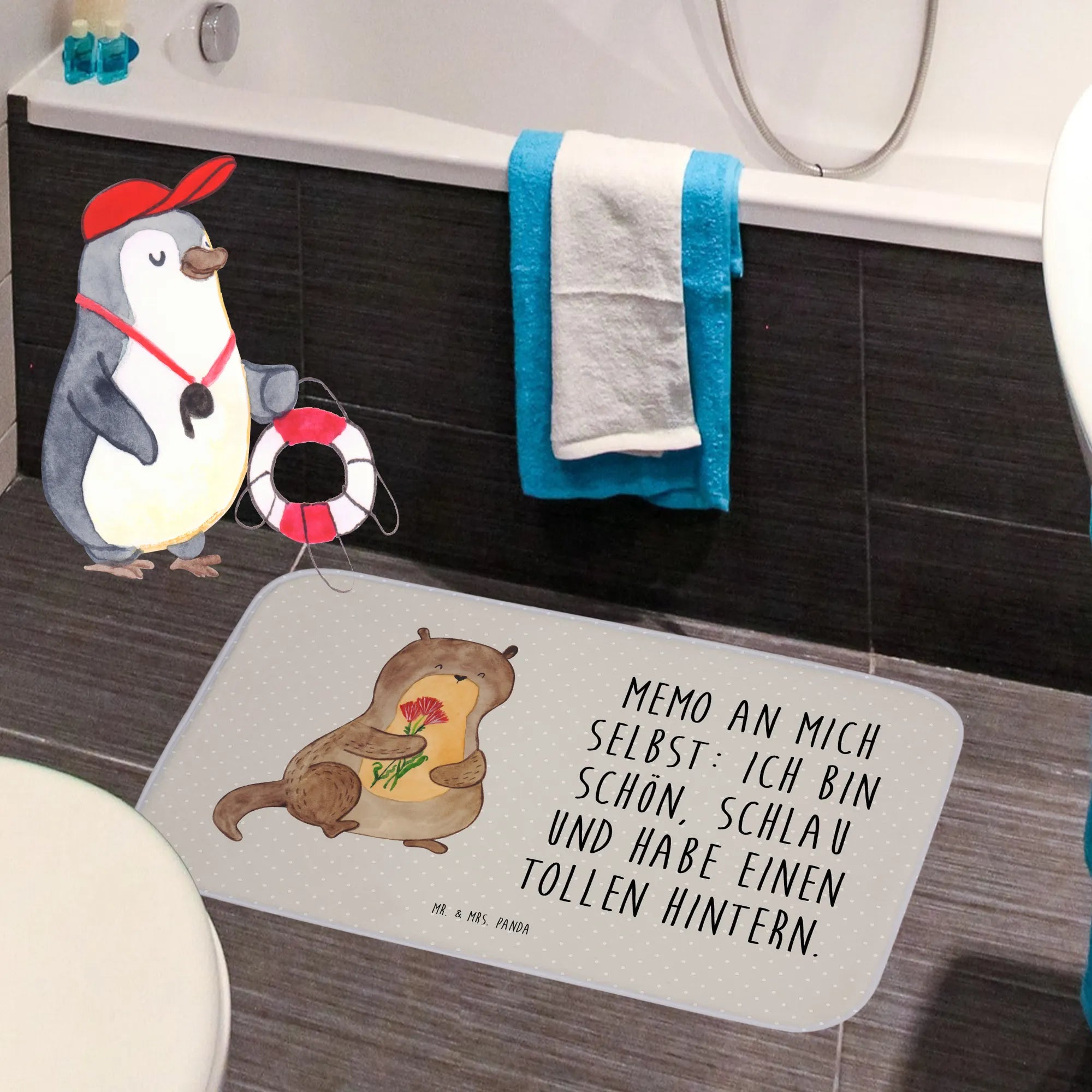Verleih deinem Badezimmer mit dem Badvorleger von Mr. & Mrs. Panda eine ganz besondere Note! Mit einer Größe von 590 mm x 400 mm ist dieser Badvorleger perfekt für jedes Badezimmer. Hergestellt aus flauschiger Premium Kunstfaser, bietet er ein unglaublich angenehmes Gefühl bei jedem Schritt. Die Antirutsch-Gummibeschichtung gewährleistet Sicherheit und verhindert Ausrutschen. Ob mit motivierenden Sprüchen oder süßen Designs bedruckt – dieser Badvorleger bringt Freude und Stil in dein Zuhause. Zudem ist er besonders saugstark, sodass er Flüssigkeiten schnell aufnimmt. Und die Pflege ist einfach: bei 30°C in der Waschmaschine waschbar, bleibt der Badvorleger immer frisch und einladend!
