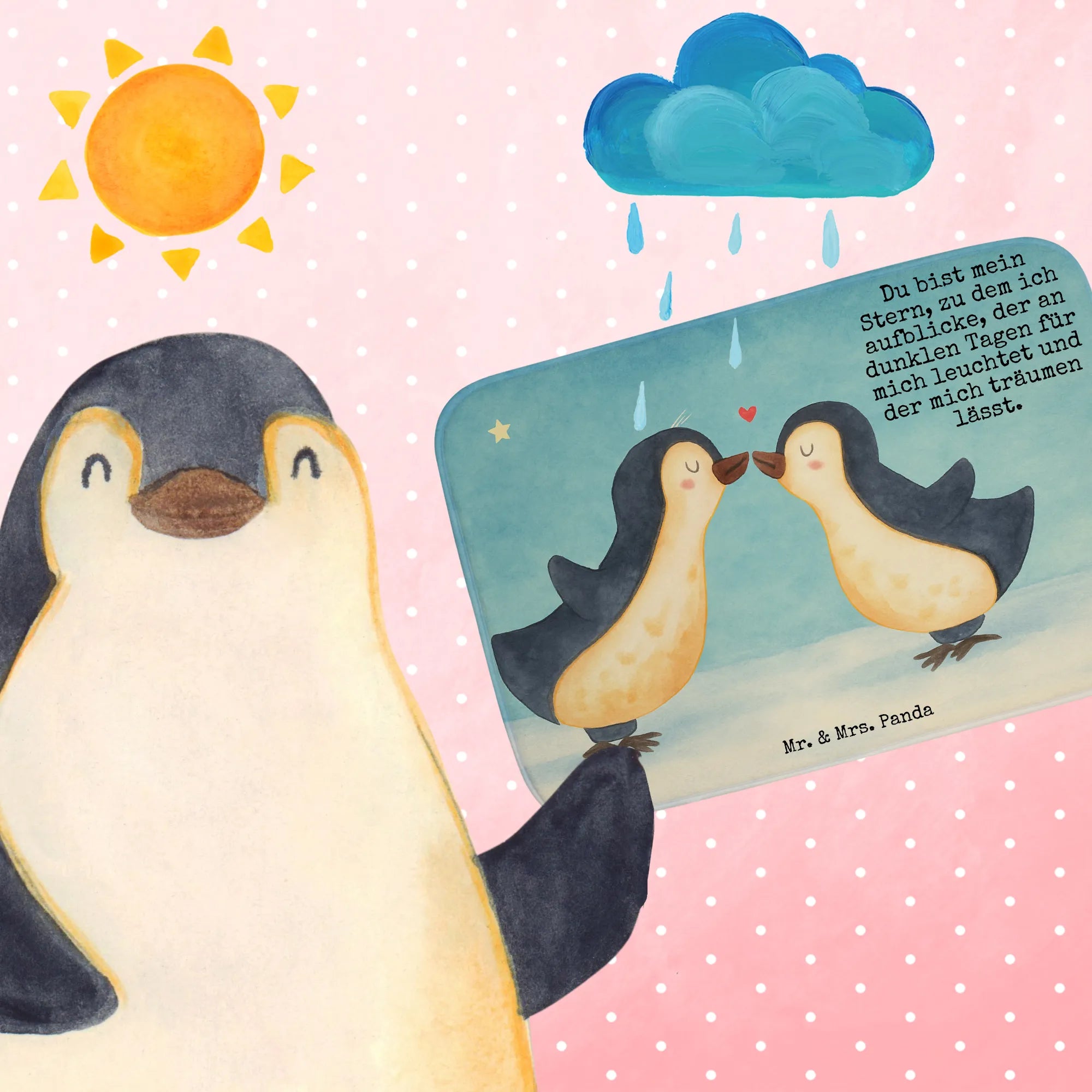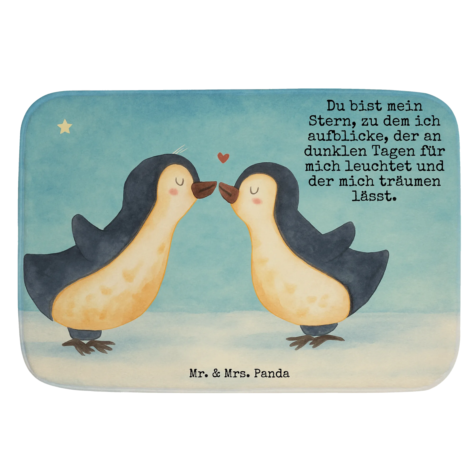 Stell dir eine zauberhafte Szene vor, in der zwei entzückende Pinguine mit geschlossenen Augen sanft ihre Schnäbel aneinander reiben, während ein kleines Herz über ihnen schwebt. Diese zwei Pinguine verkörpern nicht nur die niedliche Seite der Natur, sondern auch die tiefgründige Pinguin Liebe, die sie zueinander empfinden. Die warmen gelblichen und blauen Töne schaffen eine harmonische Atmosphäre, die jede Beziehung widerspiegelt, die voller Zuneigung ist. "Du bist mein Stern, zu dem ich aufblicke, der an dunklen Tagen für mich leuchtet und der mich träumen lässt" zeigt, wie sehr diese beiden Pinguine einander brauchen. Diese Darstellung ist perfekt als Geschenk für Verliebte, zu Hochzeitstagen oder um einfach mal Danke zu sagen. Wenn du dieses Motiv anschaust, erinnere dich daran, dass die Liebe wie ein Pinguin: warm, treu und unerschütterlich ist.