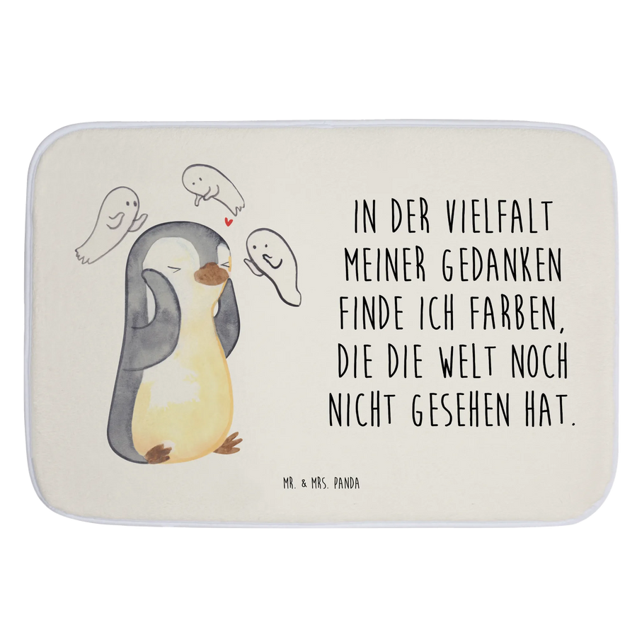 Die Badematte "Pinguin Schizophrenie" aus der Kollektion Tiere mit Superkräften von Mr. & Mrs. Panda ist mehr als nur ein praktischer Badvorleger – sie ist ein liebevolles Statement für mentale Gesundheit und Inklusion. Sie ist einzigartig gestaltet, um das Badezimmer nicht nur schön zu dekorieren, sondern auch um eine wichtige Botschaft zu vermitteln. Der niedliche Pinguin, der auf der Matte abgebildet ist, symbolisiert die unterschiedlichen Gedanken und Gefühle, die in jedem von uns vorhanden sind. Um seinen Kopf schwirren Gespenster, die seine erschreckenden Gedanken darstellen, während der Slogan "In der Vielfalt meiner Gedanken finde ich Farben, die die Welt noch nicht gesehen hat." diese Vielfalt poetisch umschreibt.