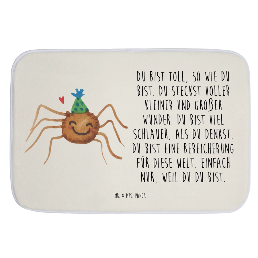 Der wunderschöne Badvorleger Spinne Agathe Party von Mr. & Mrs. Panda bringt Freude und Leben in Dein Badezimmer! Mit seinem farbenfrohen Design und dem feinen Spruch "Du bist toll, so wie du bist. Du steckst voller kleiner und großer Wunder. Du bist viel schlauer, als du denkst. Du bist eine Bereicherung für diese Welt. Einfach nur, weil du du bist." erinnert Dich dieser Badvorleger täglich an die Bedeutung von Selbstliebe und Glück. Die süße Spinne Agathe mit ihrem Partyhut strahlt Pure Freude aus und verwandelt Deinen Boden in ein wahres Schnäppchen für jeden Raum.