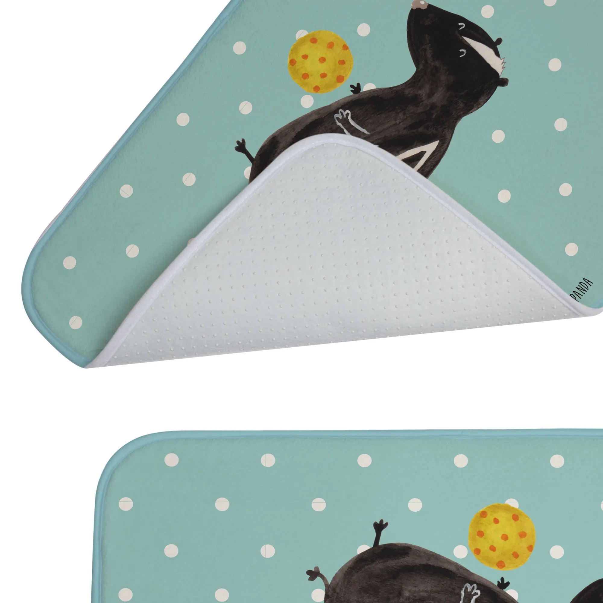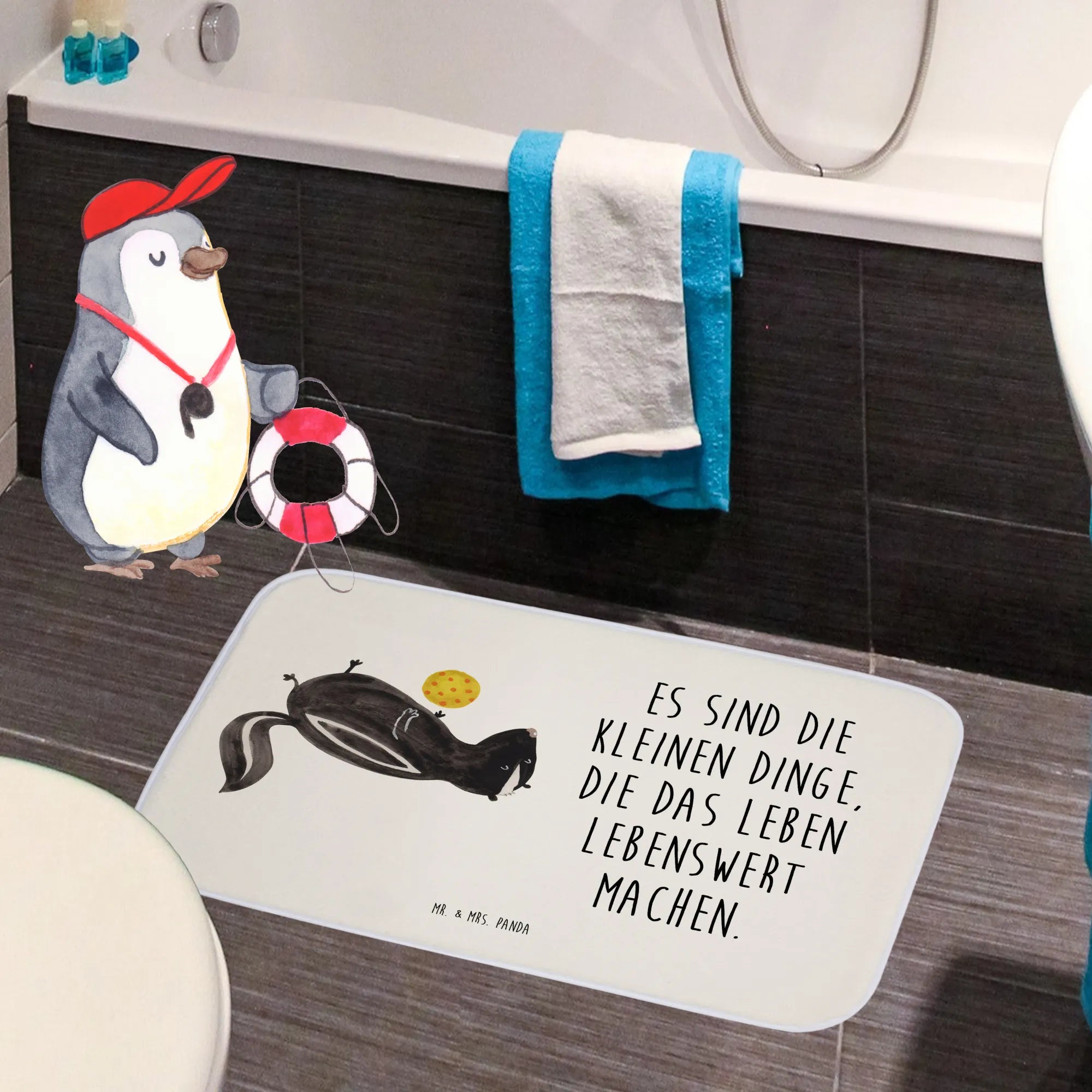 Der Badvorleger Stinktier Ball aus der Stinktier-Kollektion von Mr. & Mrs. Panda ist nicht nur einfach ein Badezimmeraccessoire, sondern ein Stück Lebensfreude für dein Zuhause. Mit seinem bezaubernden Motiv, das ein süßes Stinktier zeigt, das fröhlich mit einem Ball spielt, bringt dieser Badvorleger eine verspielte Atmosphäre in dein Bad. Die detailreiche Aquarellzeichnung und der Spruch "Es sind die kleinen Dinge, die das Leben lebenswert machen." verleihen deinem Badezimmer einen besonderen Charme.