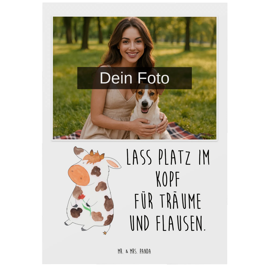 Du suchst nach dem perfekten Geschenk für einen Landwirtschafts- oder Tierliebhaber? Dann ist die personalisierte Foto Postkarte mit dem niedlichen Kuh-Motiv von Mr. & Mrs. Panda genau das Richtige! Diese einmalige Postkarte ist nicht nur ein Blickfang, sondern auch eine Botschaft voller Träume und Flausen: 'Lass Platz im Kopf für Träume und Flausen.'