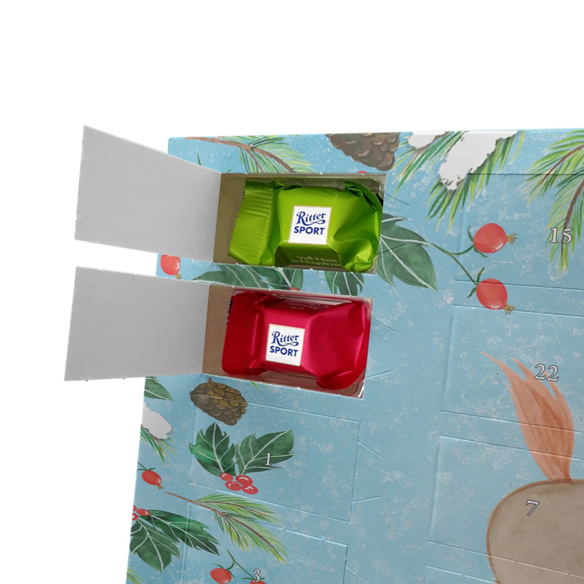 🐼 Personalisierter Schoko Adventskalender, seidenmatt und mit Ritter Sport Schokowürfeln.
