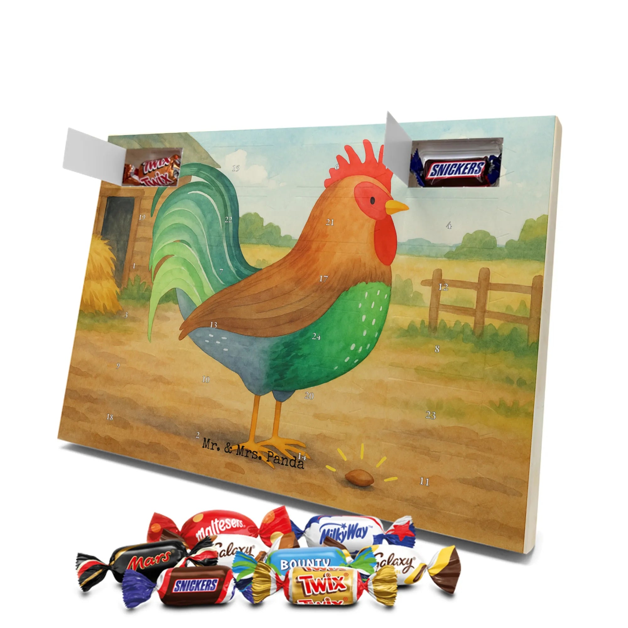 Unser entzückender Schokoladen Adventskalender von Mr. & Mrs. Panda ist das perfekte Highlight für die Adventszeit. Bedruckt mit wunderschönen Motiven & Sprüchen von Mr. & Mrs. Panda zaubert er dir ein Lächeln an jedem Tag im Dezember. Der Kalender ist nicht personalisierbar, überzeugt aber durch brillante Druckqualität mit seidenmatter Oberflächenveredelung und sorgsame bedruckte Seitenflächen. Die stabile Verarbeitung macht ihn zu einem dekorativen Hingucker. Maße: 325 mm x 225 mm x 27 mm. Besonders praktisch: Er kann aufgehängt oder aufgestellt werden, ganz nach deinem Geschmack und Platzangebot. Gefüllt ist der Adventskalender mit Ritter Sport Schokowürfeln – in verführerischen Sorten wie Mousse au Chocolat, Schoko Crisp, Voll-Nuss in Nougatcreme, Karamell Duo, Joghurt und Erdbeer-Joghurt. Wichtiger Hinweis: Es handelt sich um einen Kalender gefüllt mit Ritter Sport Schokolade, nicht um einen Kalender der Marke Ritter Sport. Schenk ihn Freunden, der Familie oder gönn dir selbst eine süße Vorfreude: kleine Schokoladenmomente, liebevoll verpackt von Mr. & Mrs. Panda.