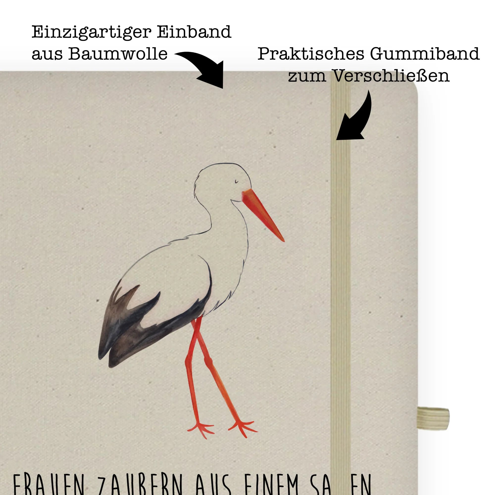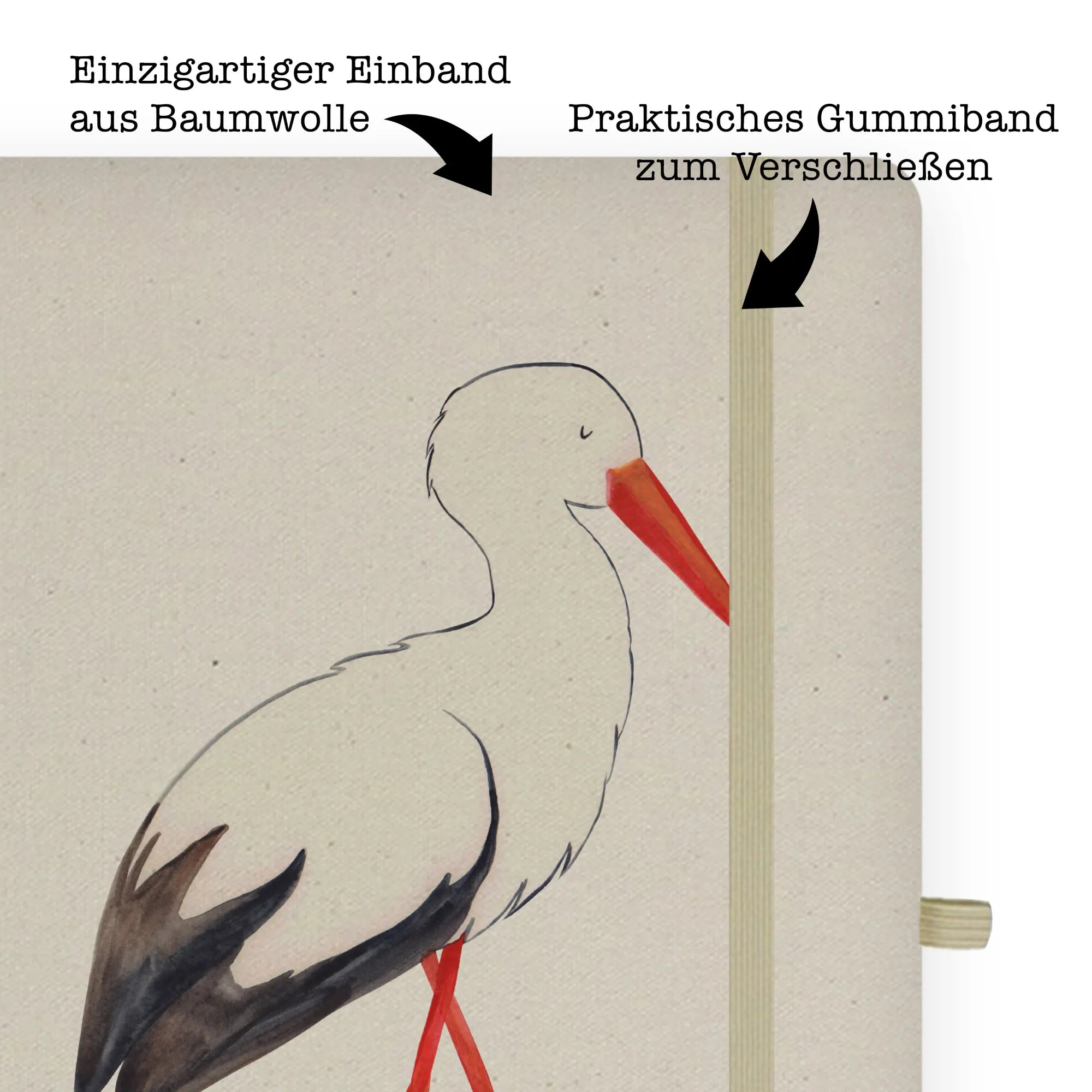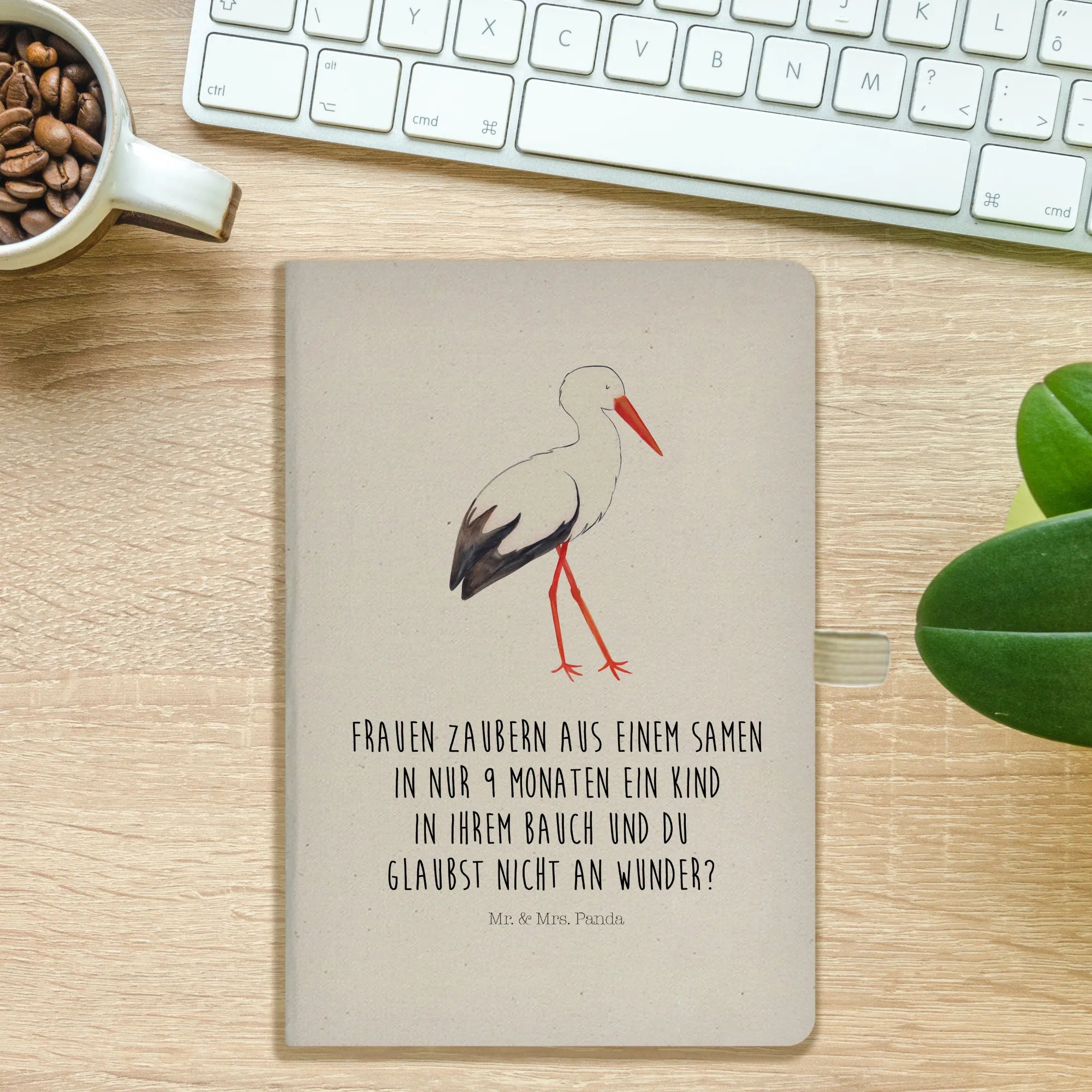 Das DIN A6 Baumwoll Notizbuch mit dem süßen Storch-Motiv aus der Small World Kollektion von Mr. & Mrs. Panda ist mehr als nur ein Notizbuch – es ist ein liebevolles Geschenk für werdende Mütter, frischgebackene Mütter oder einfach diejenigen, die die Magie des Lebens feiern möchten. Mit dem Motto "Frauen zaubern aus einem Samen in nur 9 Monaten ein Kind in ihrem Bauch und du glaubst nicht an Wunder?" regt dieses Notizbuch zum Nachdenken an und bringt Freude in jeden Schreibmoment.