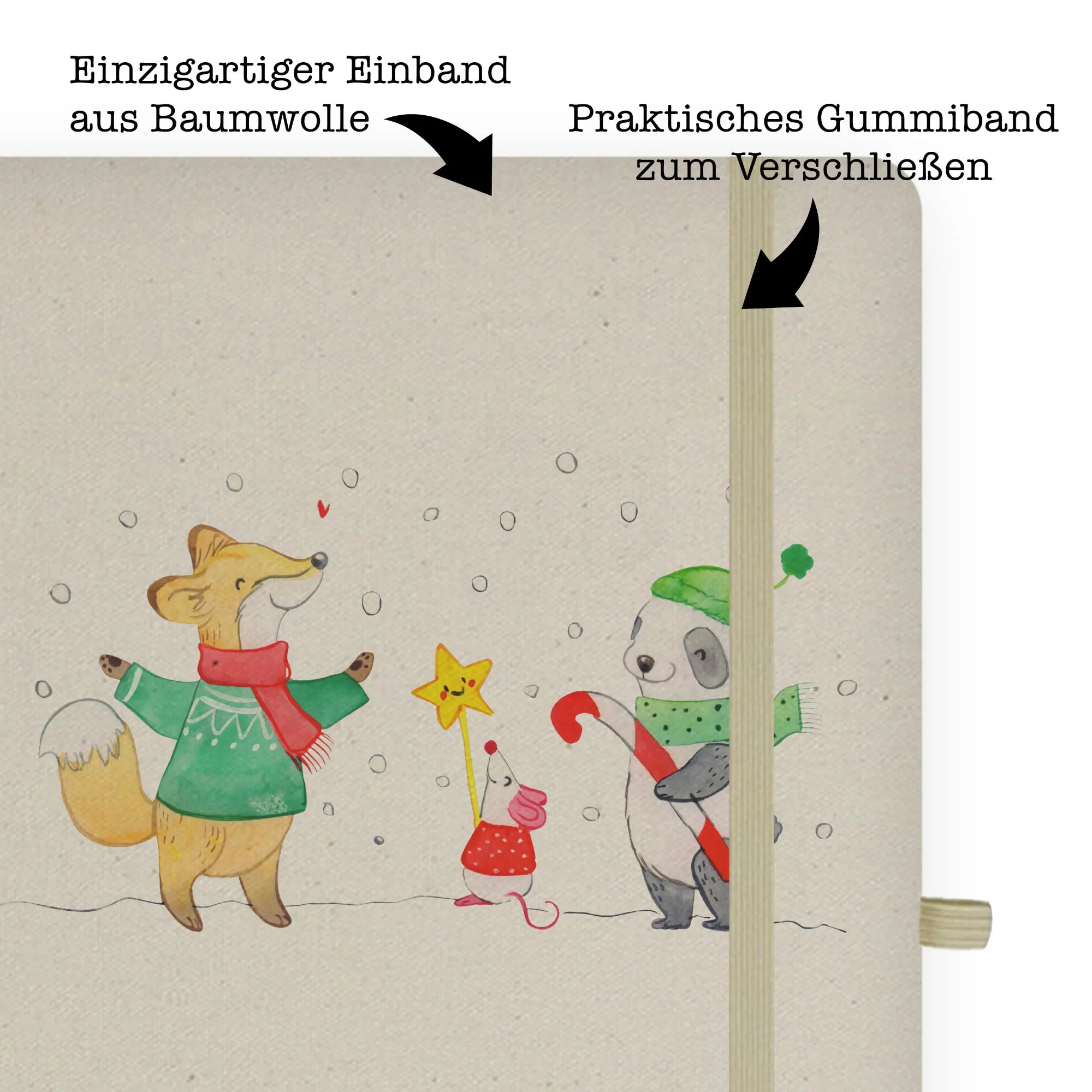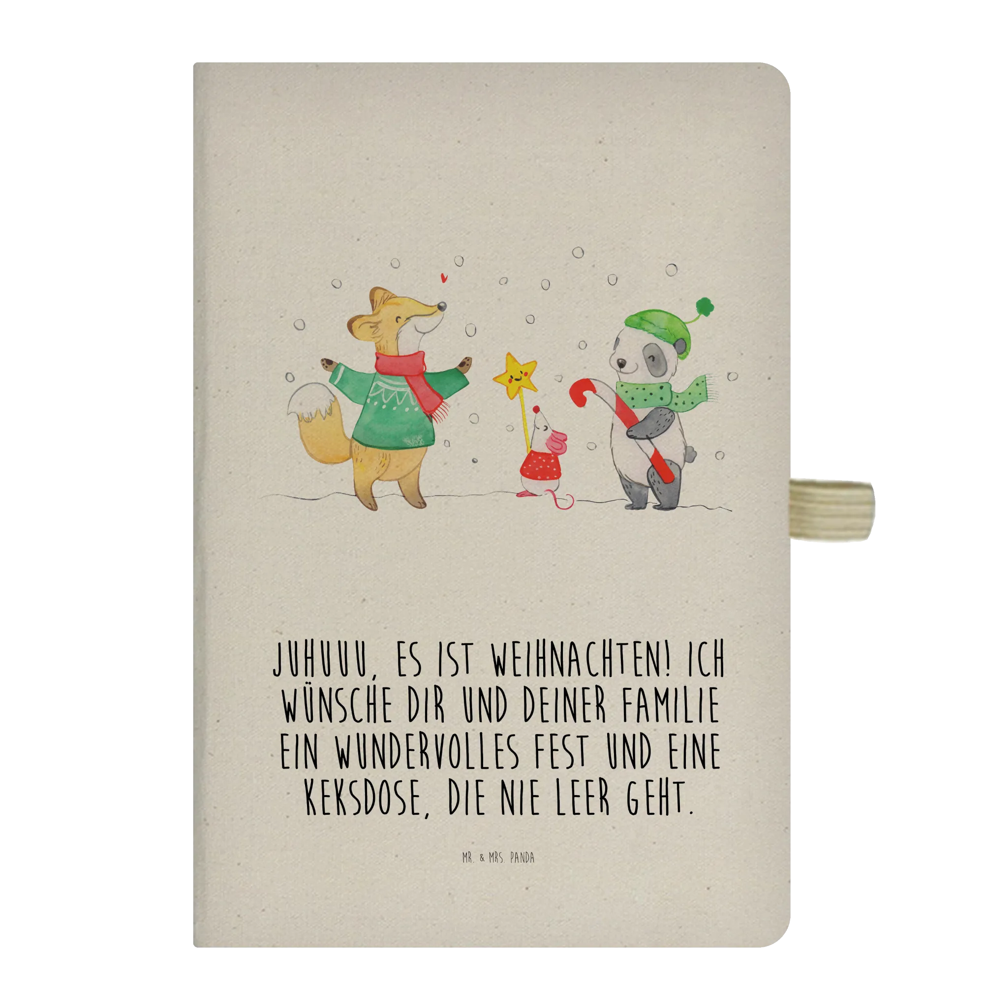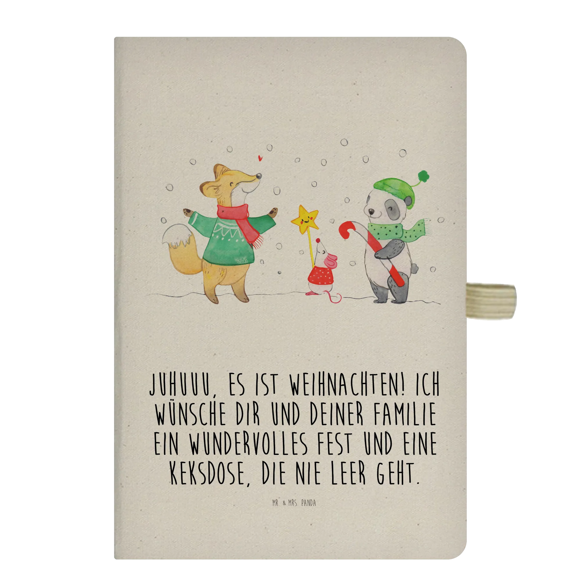 Juhuuu, es ist Weihnachten! Unser DIN A4 Baumwoll Notizbuch „Winter Weihnachtsfreude“ aus der Winter Kollektion von Mr. & Mrs. Panda bringt Weihnachtszauber in deinen Alltag. Auf dem liebevoll bedruckten Stoffeinband stehen ein Fuchs, eine Maus und ein Panda mit Schal und Mütze im Schnee und lächeln der Adventszeit entgegen. Der fröhliche Spruch „Juhuuu, es ist Weihnachten! Ich wünsche dir und deiner Familie ein wundervolles Fest und eine Keksdose, die nie leer geht.“ macht dieses Notizbuch zum perfekten Weihnachtsgeschenk.