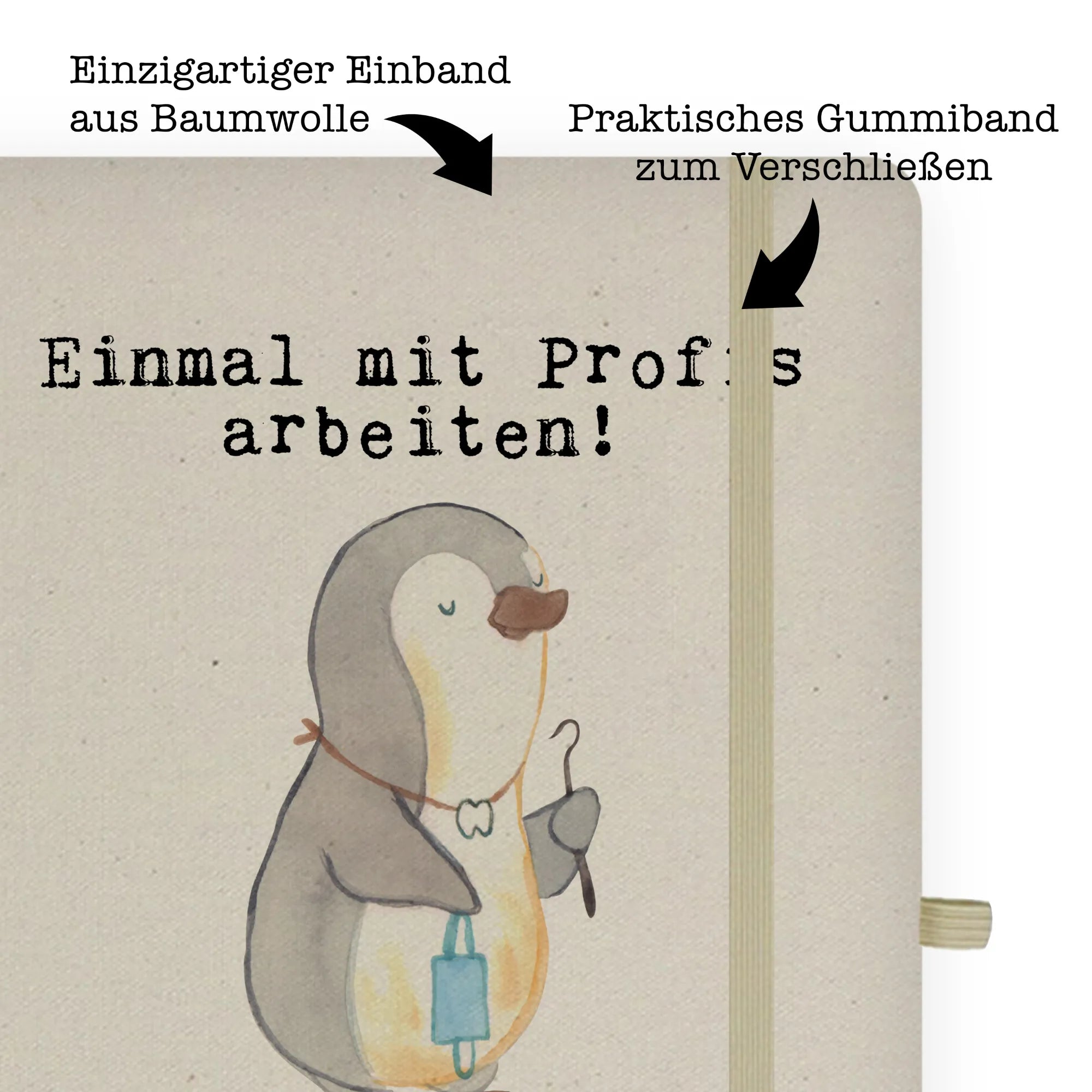 Entdecke das bezaubernde DIN A5 Baumwoll Notizbuch "Zahntechniker aus Leidenschaft" von Mr. & Mrs. Panda! Dieses wunderschöne und edle Notizbuch zeigt den süßen Pinguin, der mit einer Kette um den Hals, einem Zahn daran und einem Mundschutz ausgestattet, die Leidenschaft für die Zahntechnik widerspiegelt.