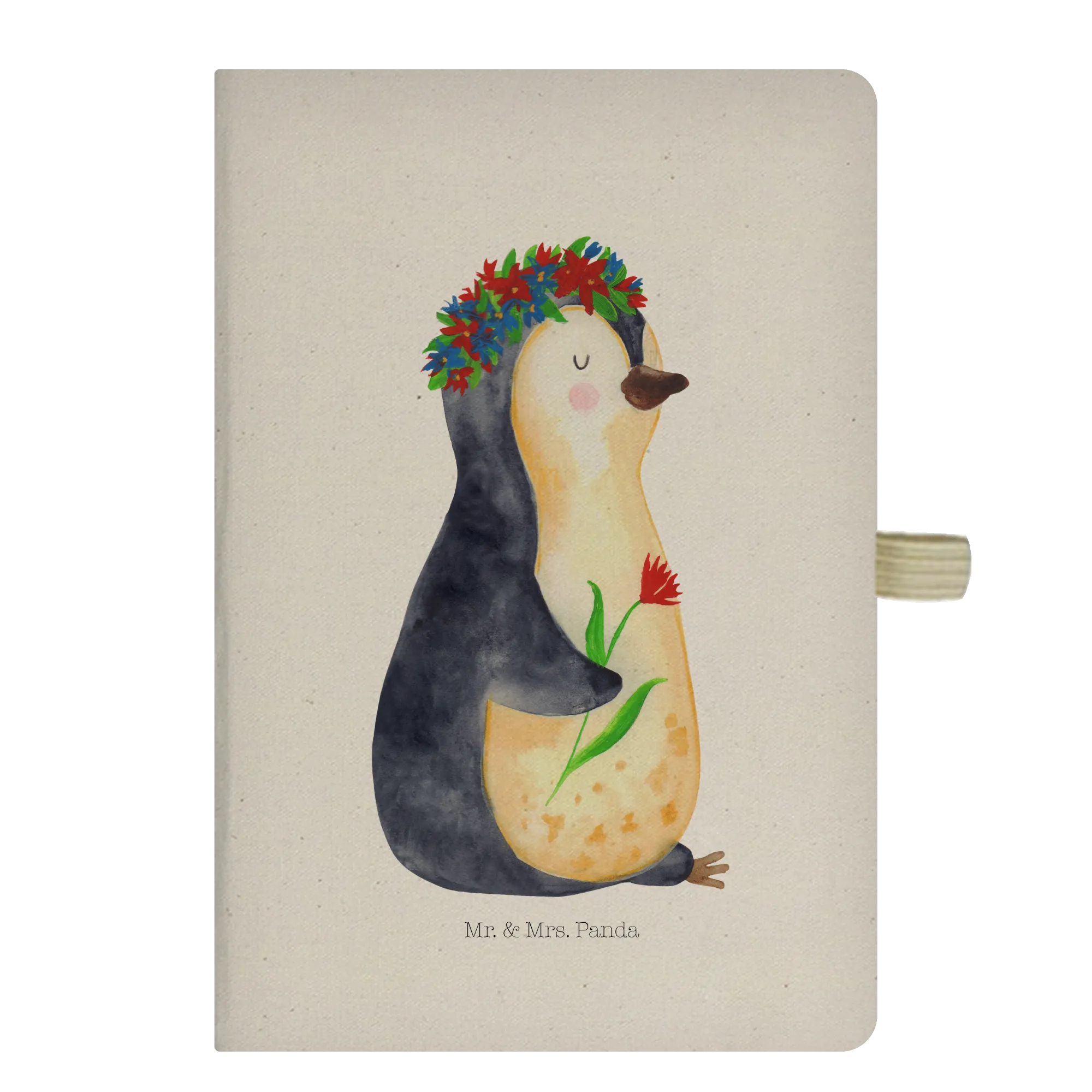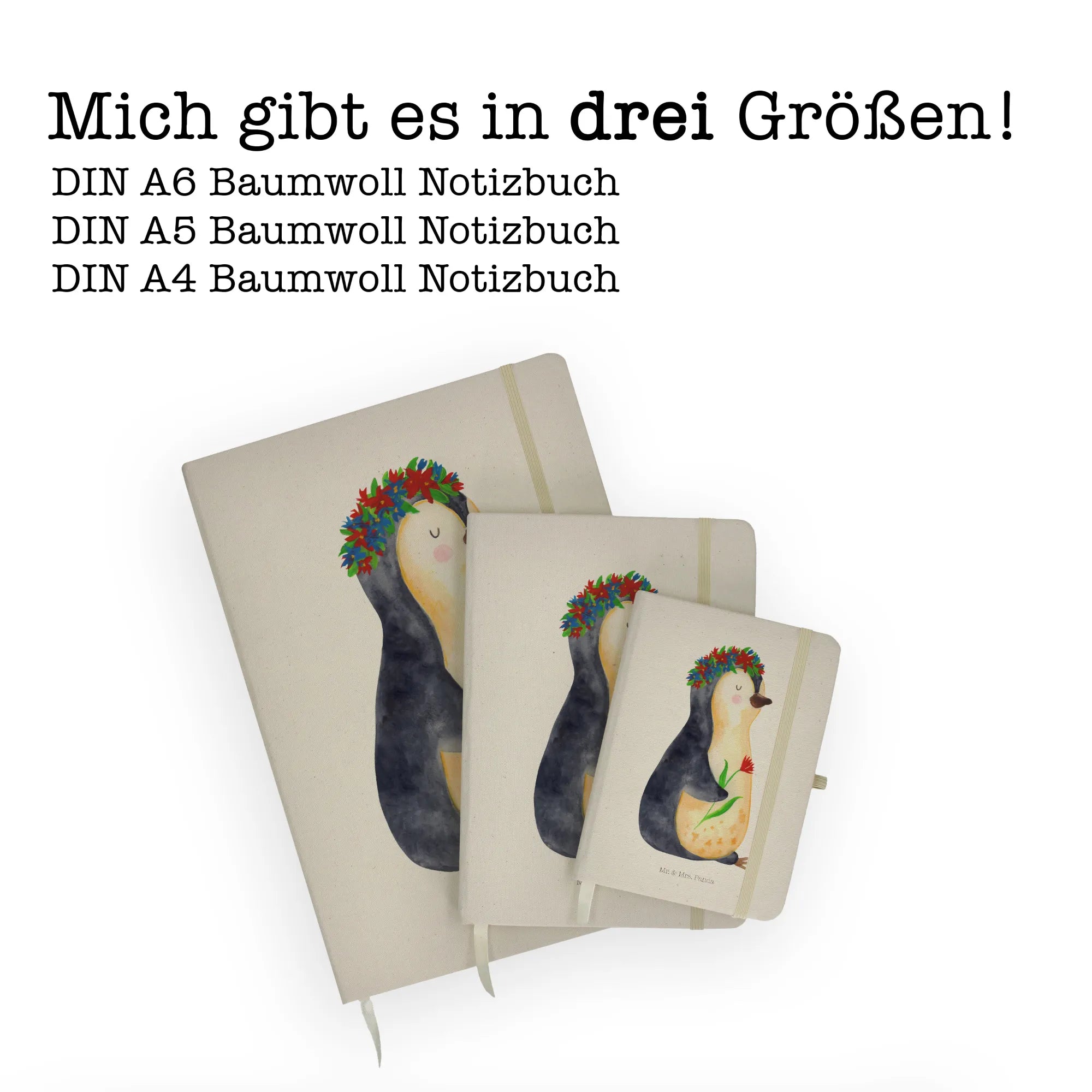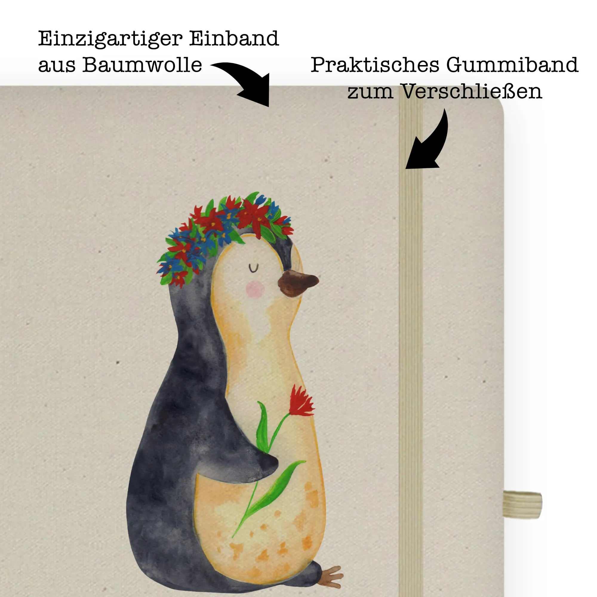 Suchst Du nach dem perfekten Geschenk für Freunde oder Familie, die das Schreiben lieben? Unser DIN A6 Baumwoll Notizbuch mit dem zuckersüßen Pinguin Blumenkranz Motiv aus der Pinguin-Kollektion von Mr. & Mrs. Panda ist genau das Richtige!