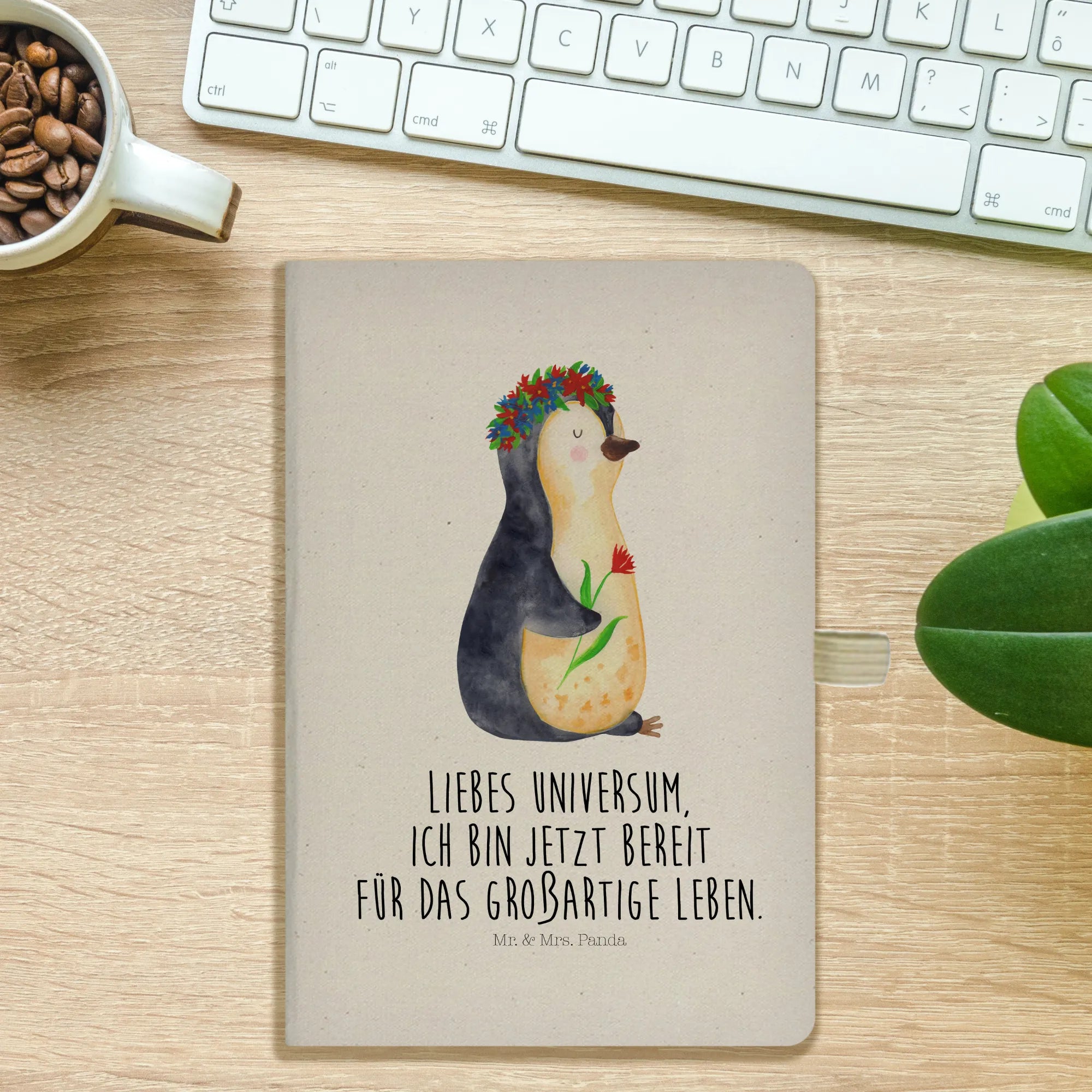 Das DIN A6 Baumwoll Notizbuch mit dem süßen Pinguin Blumenkranz aus der Pinguin-Kollektion von Mr. & Mrs. Panda ist das perfekte Geschenk für alle, die das Leben mit einem Lächeln und einer Portion Kreativität angehen möchten. Ob für deine eigenen Gedanken, Illustrationen oder als liebevolles Geschenk für Freunde und Familie – dieses Notizbuch vereint stilvolles Design mit einer funktionalen Nutzung. Der zauberhafte Pinguin mit seinem Blumenkranz bringt Freude und Motivation in jeden Schreibmoment. Mit dem inspirierenden Spruch 'Liebes Universum, ich bin jetzt bereit für das großartige Leben.' motiviert das Notizbuch dazu, die eigenen Träume und Ziele zu verfolgen.