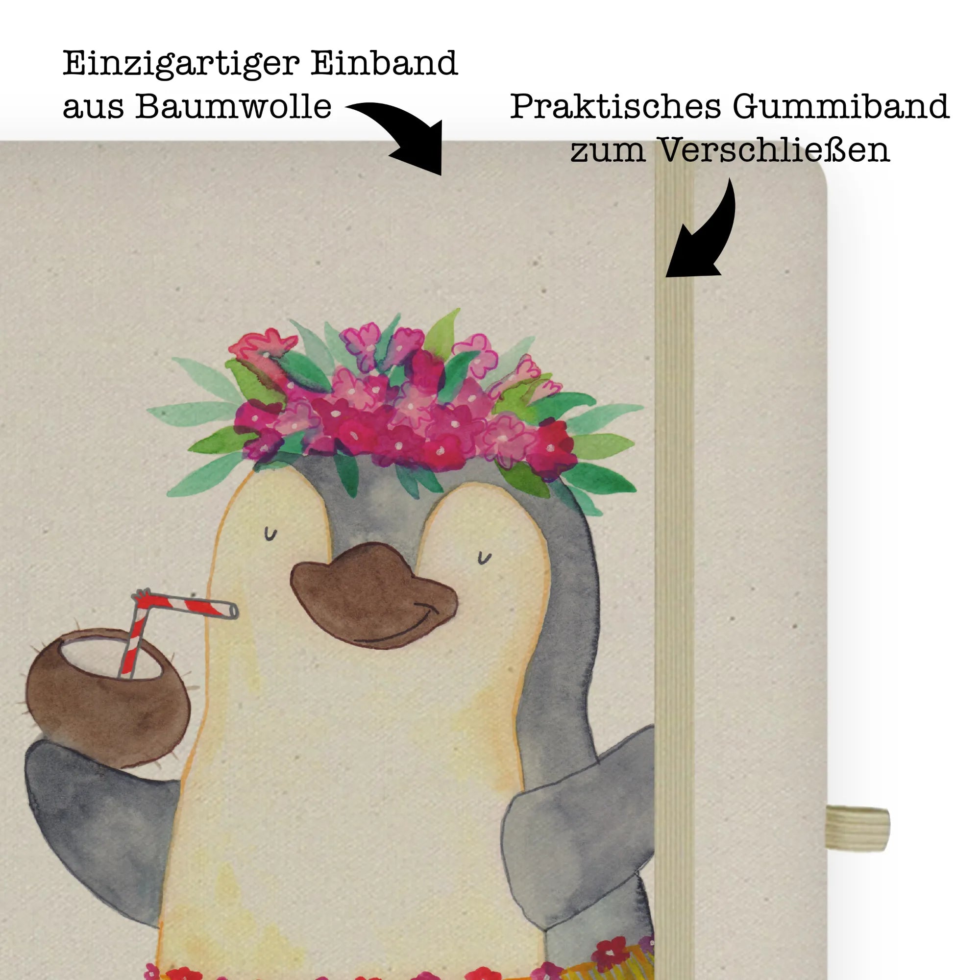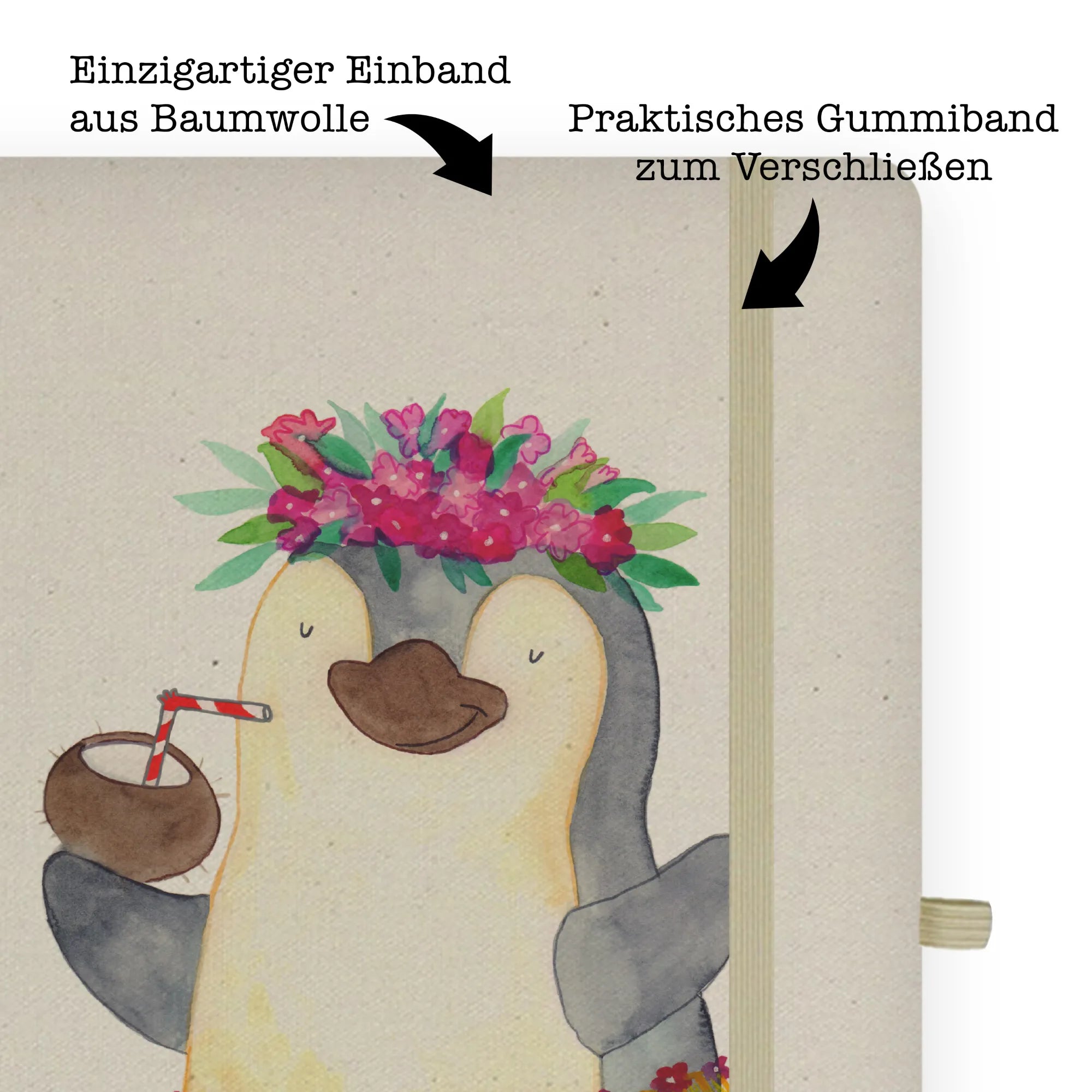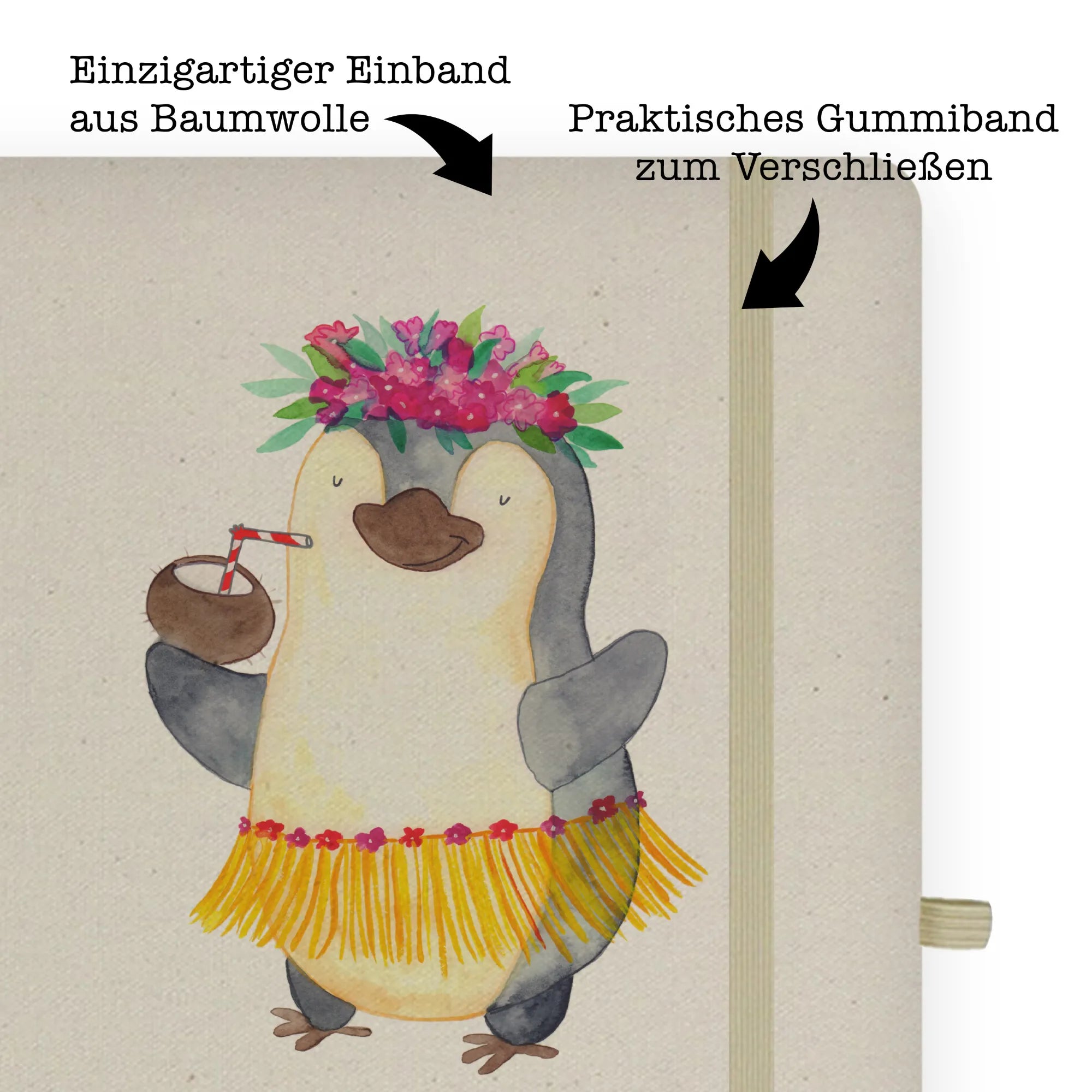 Stell dir vor, du öffnest deine Tasche und ein kleiner, tanzender Pinguin mit einem Baströckchen und einer Kokosnuss in der Hand strahlt dir entgegen. Genau dieses Gefühl von purer Lebensfreude und Unbeschwertheit bringt das DIN A4 Baumwoll Notizbuch von Mr. & Mrs. Panda direkt in deinen Alltag. 🐧🥥