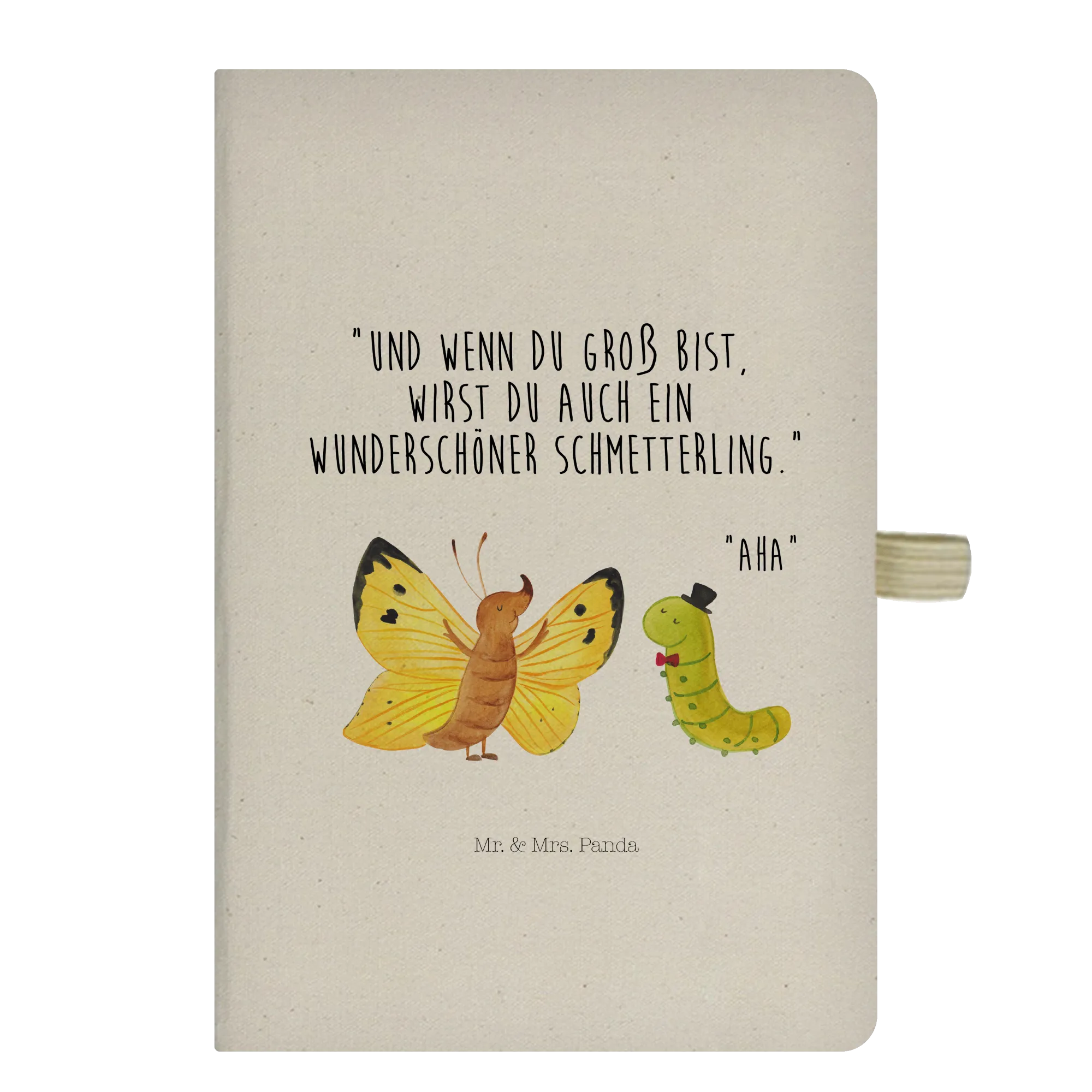 Das DIN A5 Baumwoll Notizbuch mit dem wundervollen Motiv der Raupe und dem Schmetterling aus der Kollektion Small World von Mr. & Mrs. Panda ist das perfekte Geschenk für alle, die das Aufwachsen und die Transformation schätzen. Dieses edle Baumwollnotizbuch symbolisiert nicht nur Wachstum, sondern auch die Reise des Erwachsenwerdens.