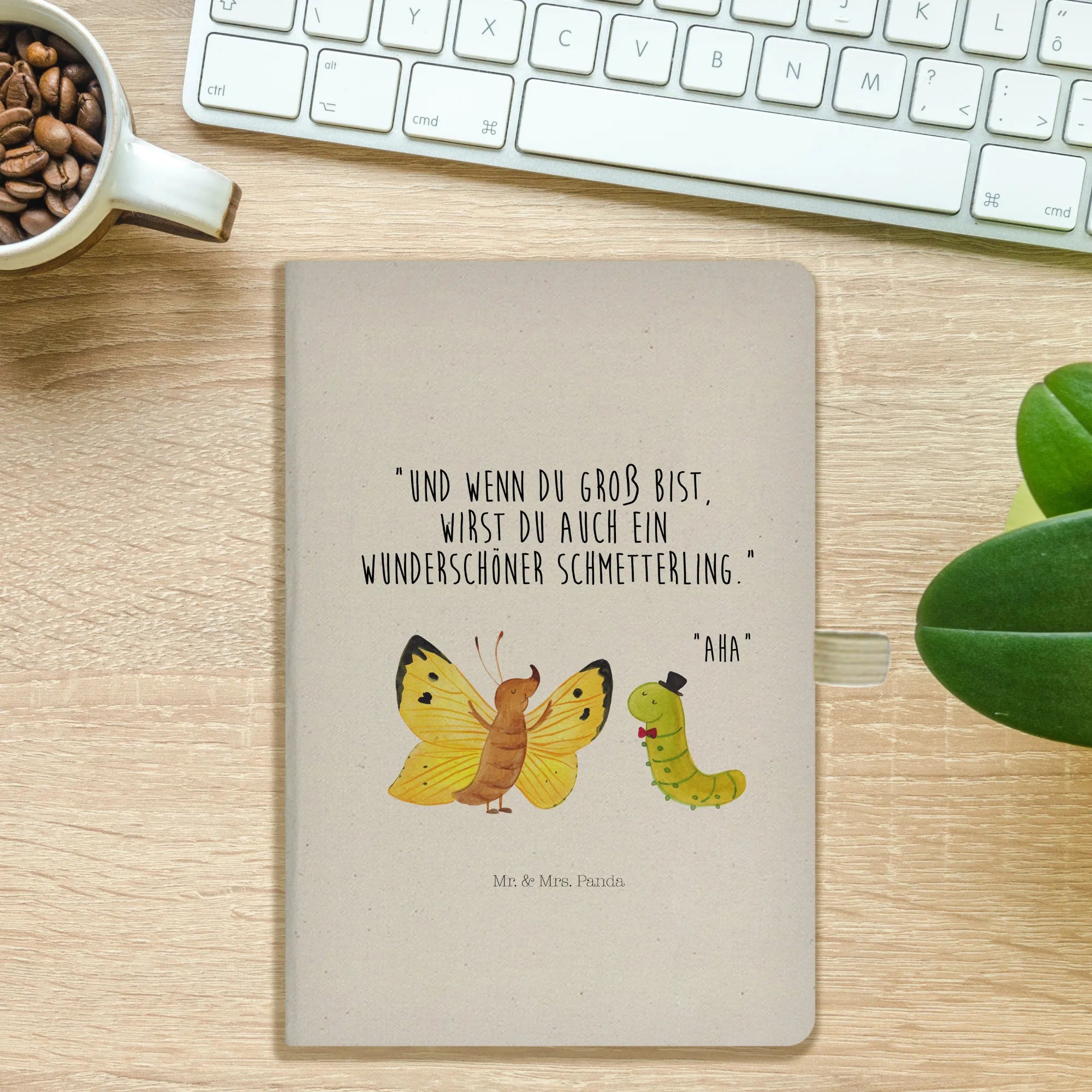 Du bist auf der Suche nach einem ganz besonderen Geschenk, das Freude und Kreativität vereint? Dann ist das niedliche DIN A6 Baumwoll Notizbuch mit dem bezaubernden Motiv Raupe & Schmetterling aus der exklusiven Small World Kollektion von Mr. & Mrs. Panda genau das Richtige für dich! Diese Kollektion zeigt mit ihren bunten und liebevoll designten Motiven die Wunder der Tierwelt und ermutigt dich, die kleinen und großen Veränderungen im Leben zu feiern. Das Motiv der kleinen Raupe, die sich in einen wunderschönen Schmetterling verwandelt, steht für Wachstum, Entwicklung und Transformation. Es ist ein perfektes Geschenk für Kinder und Erwachsene, die an ihre Träume glauben und mutig neue Wege gehen wollen.