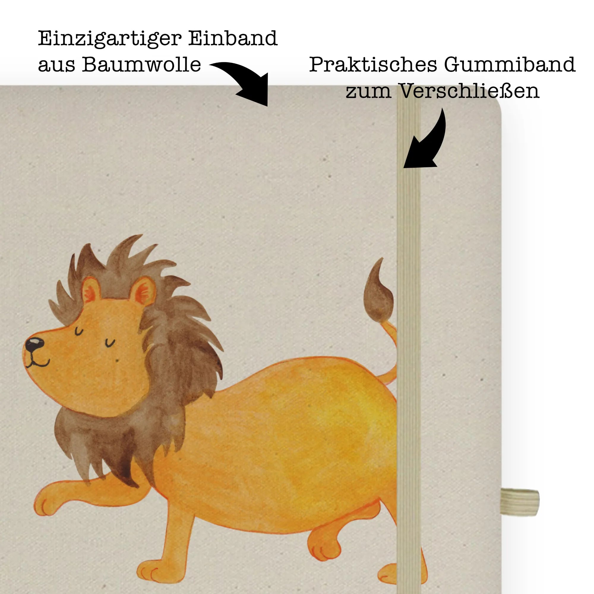Stark und stolz wie ein Löwe. Unser DIN A5 Baumwoll Notizbuch mit dem Sternzeichen Löwe ist ein liebevolles Geschenk für alle Löwen-Geborenen und Freunde der Astrologie. Das handgezeichnete Aquarell-Motiv aus der Sternzeichen-Kollektion von Mr. & Mrs. Panda bringt Farbe und Freude in deinen Alltag. 😊