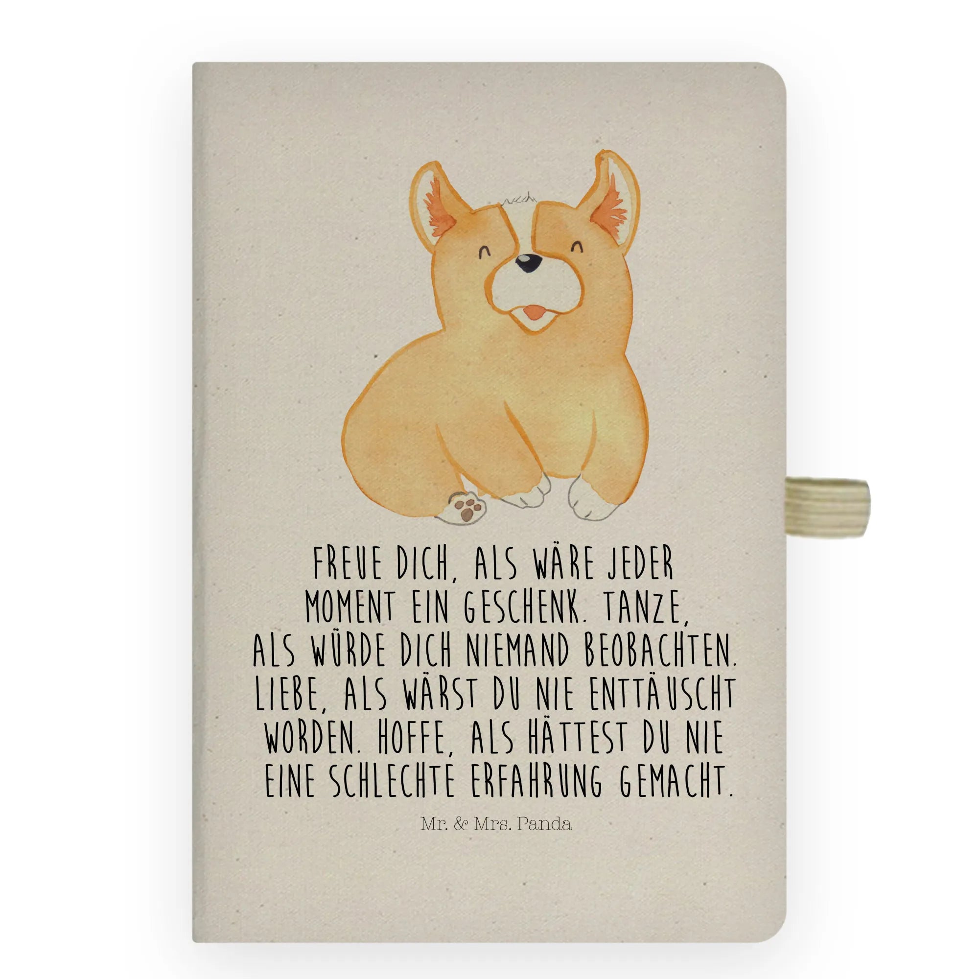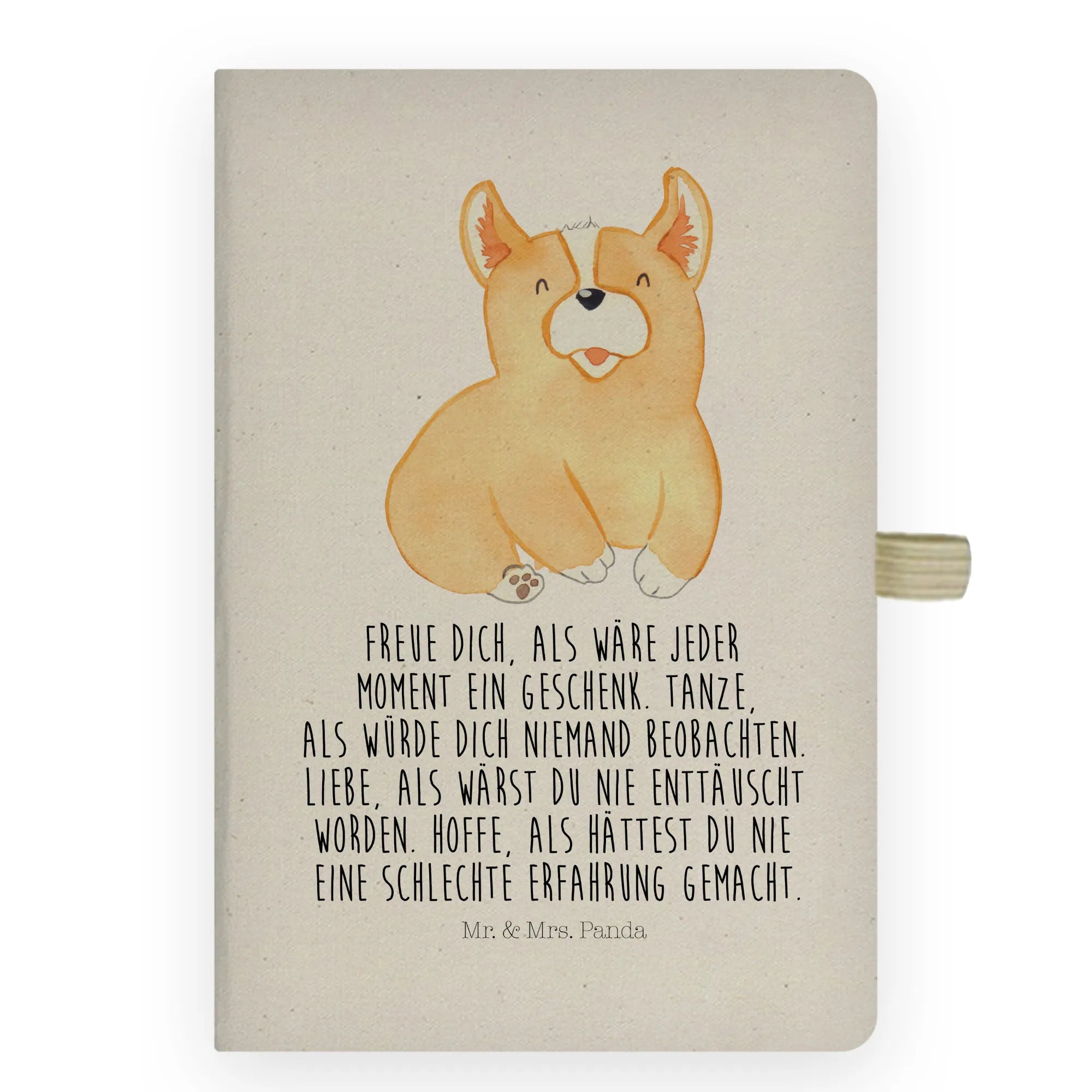 Das DIN A4 Baumwoll Notizbuch von Mr. & Mrs. Panda mit dem niedlichen Corgie-Motiv ist das ideale Geschenk für jeden Tierliebhaber und Hundebesitzer. Es vereint Funktionalität und Stil, und die entzückende Illustration eines Welsh Corgie Pembroke bringt Freude in den Alltag.