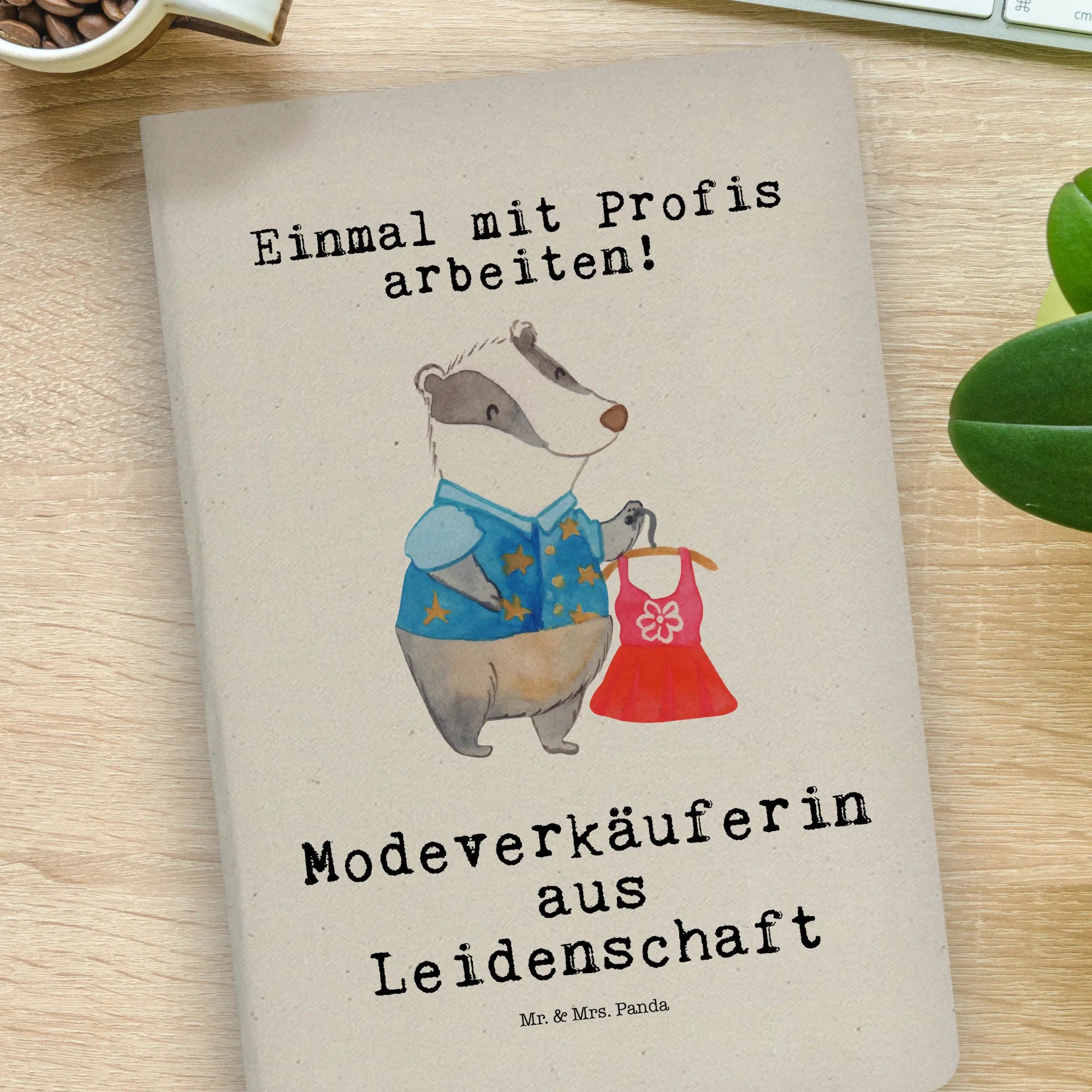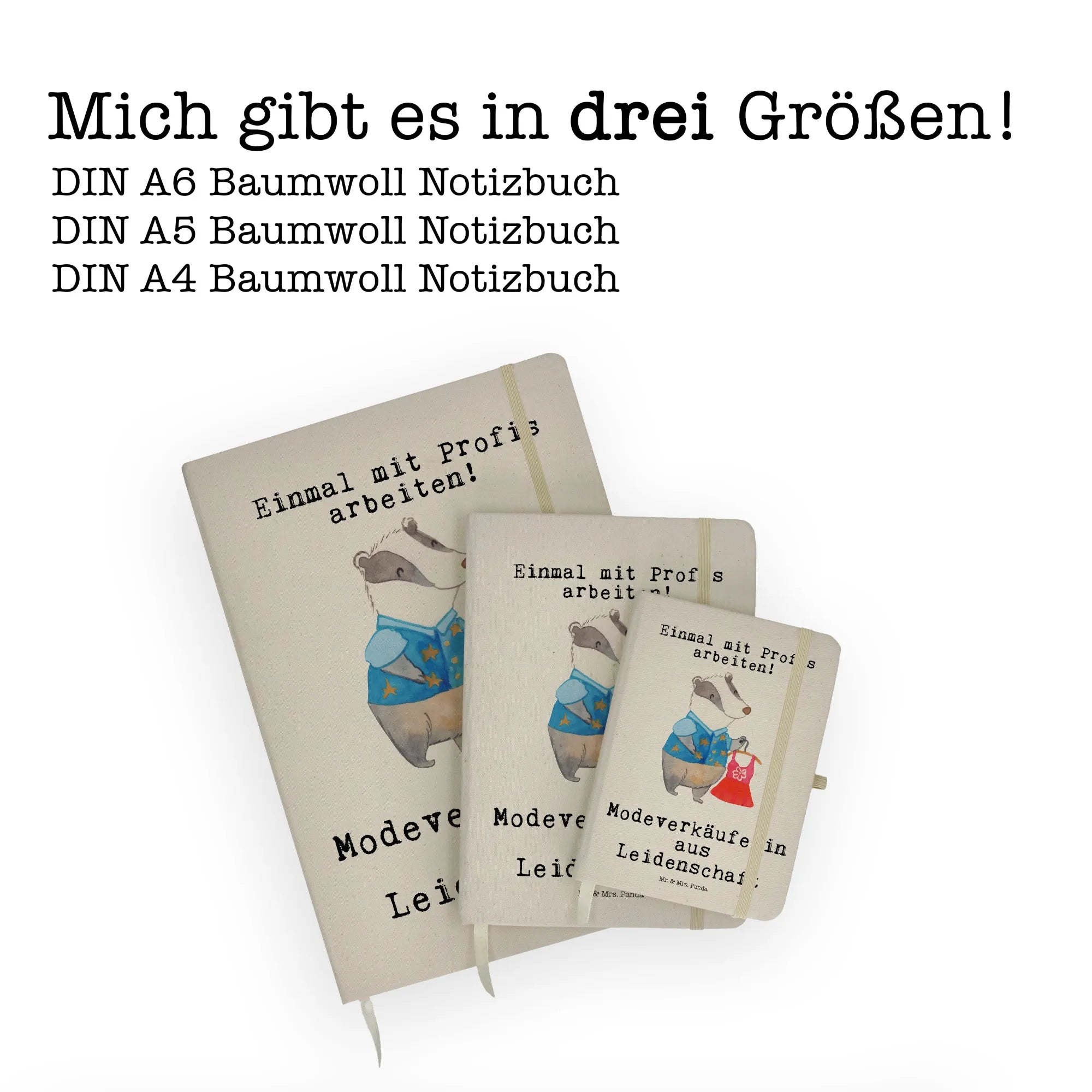 Entdecke das DIN A5 Baumwoll Notizbuch „Modeverkäuferin aus Leidenschaft“ aus der Berufe-Kollektion von Mr. & Mrs. Panda. Ein liebevoll gestaltetes A5 Notizbuch mit einem handgezeichneten Motiv: Ein schicker Dachs präsentiert ein Kleid – perfekt für alle, die Mode und Verkauf mit Herz verbinden.