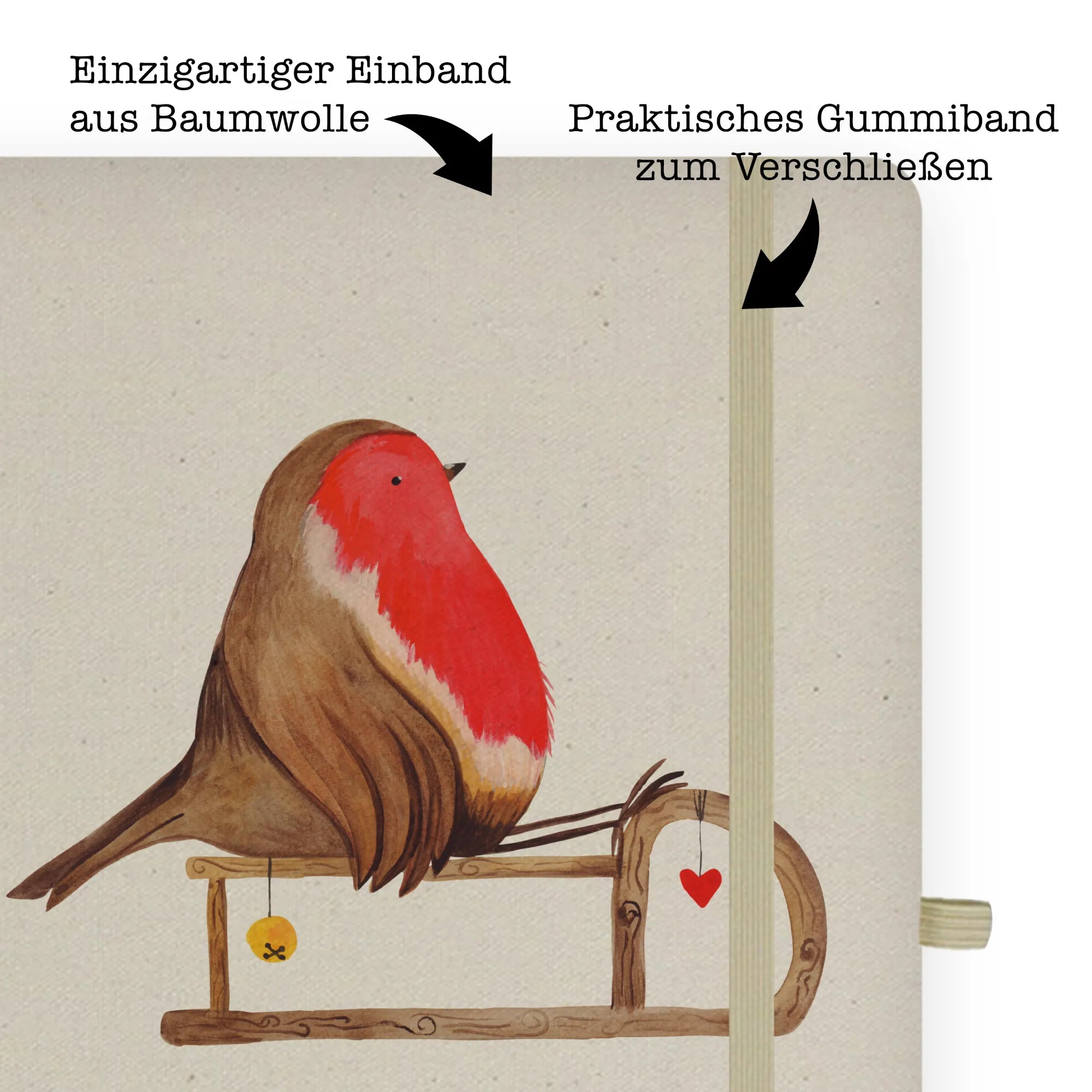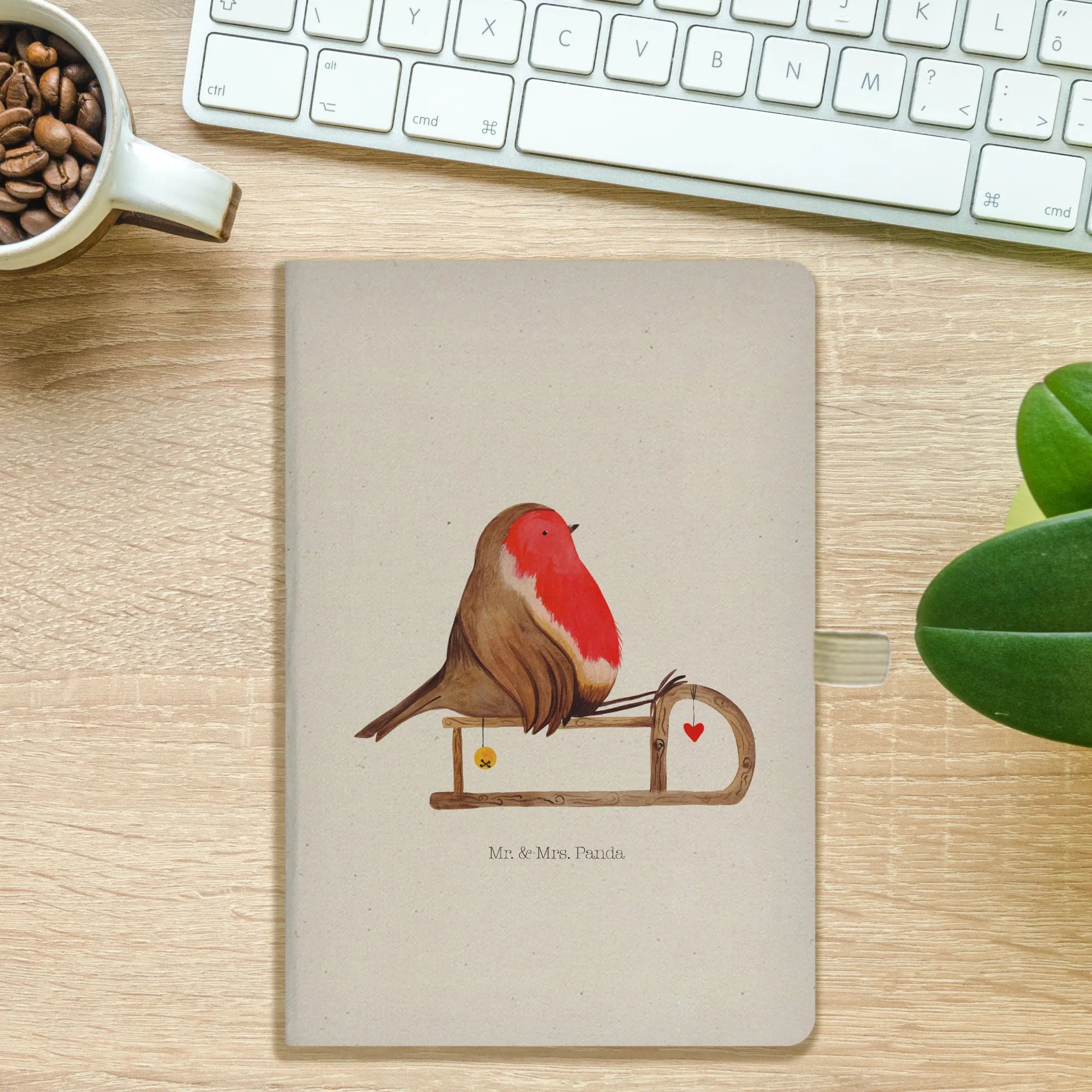 Entdecke das bezaubernde DIN A5 Baumwoll Notizbuch mit dem niedlichen Motiv Rotkehlchen auf dem Schlitten aus der Winter Kollektion von Mr. & Mrs. Panda!