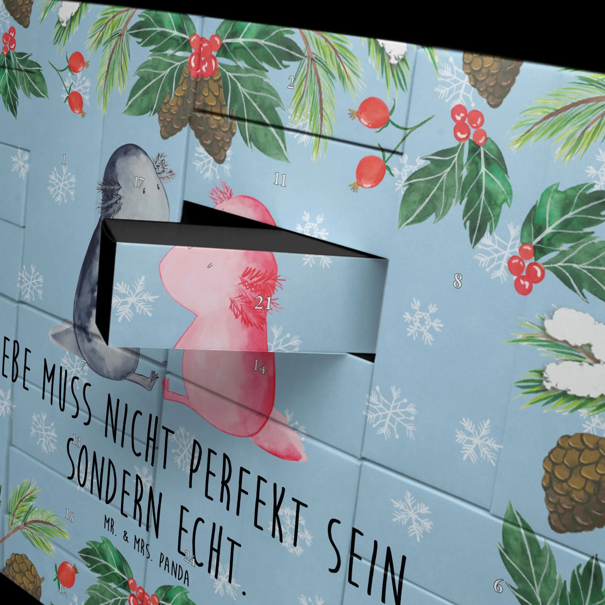 Auf der Suche nach einem ganz besonderen Adventskalender? Der Befüllbare Adventskalender "Axolotl Liebe" von Mr. & Mrs. Panda vereint Romantik, Niedlichkeit und Persönlichkeit. Die liebevoll handgezeichneten Axolotl sitzen sich gegenüber, halten Händchen und vermitteln mit dem Slogan „Liebe muss nicht perfekt sein, sondern echt.“ eine warme, ehrliche Botschaft – perfekt als Adventskalender zum Selbstbefüllen für deinen Lieblingsmenschen.