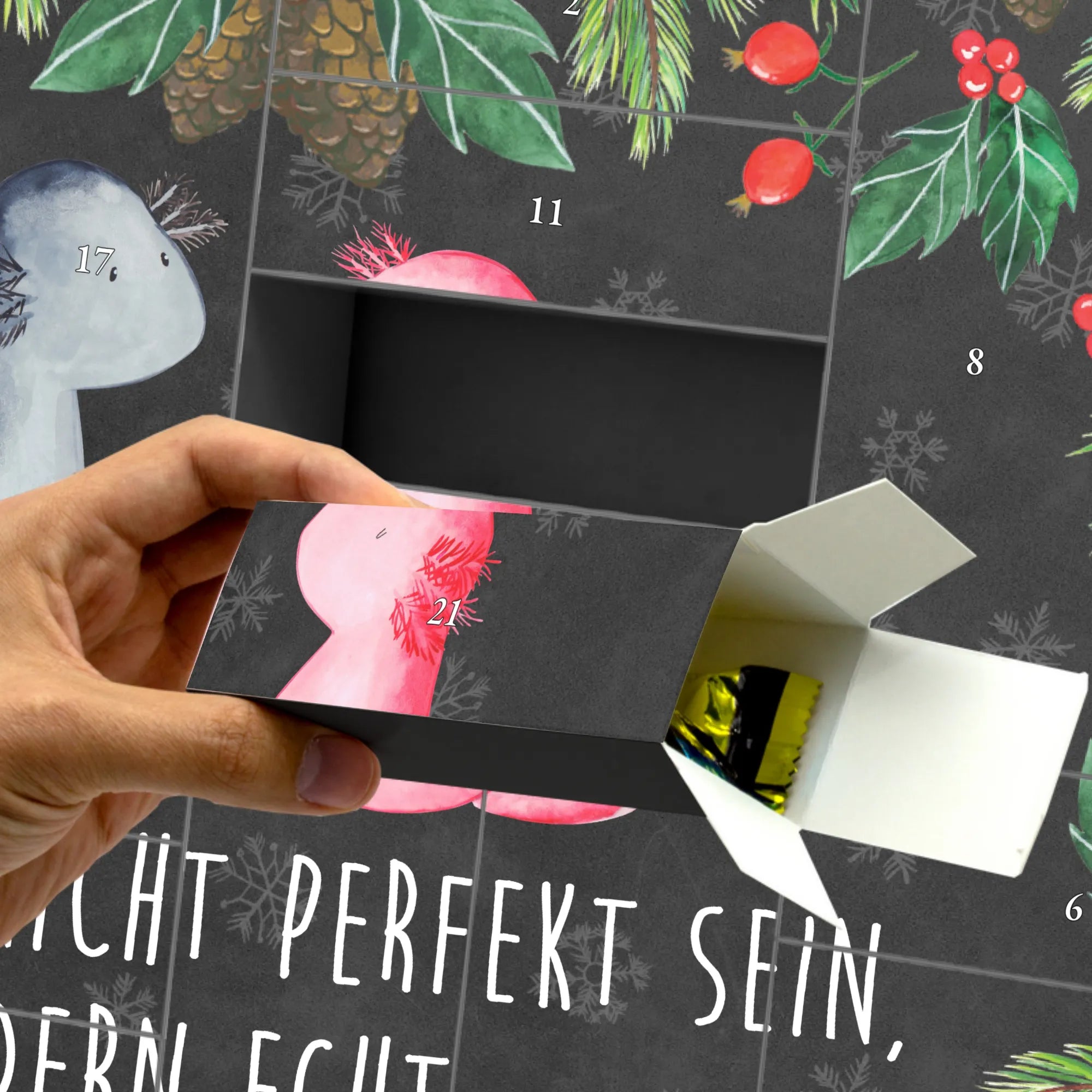 Die Axolotl-Illustration stammt aus der Feder von Mrs. Panda und wurde mit viel Liebe zum Detail gestaltet. Die Kreidetafel-Optik im Hintergrund verleiht dem Kalender einen modernen, gemütlichen Look. Die brillante Druckqualität und die seidenmatte Oberfläche sorgen dafür, dass das Motiv strahlt und sich wunderbar in deine Adventsdekoration einfügt.