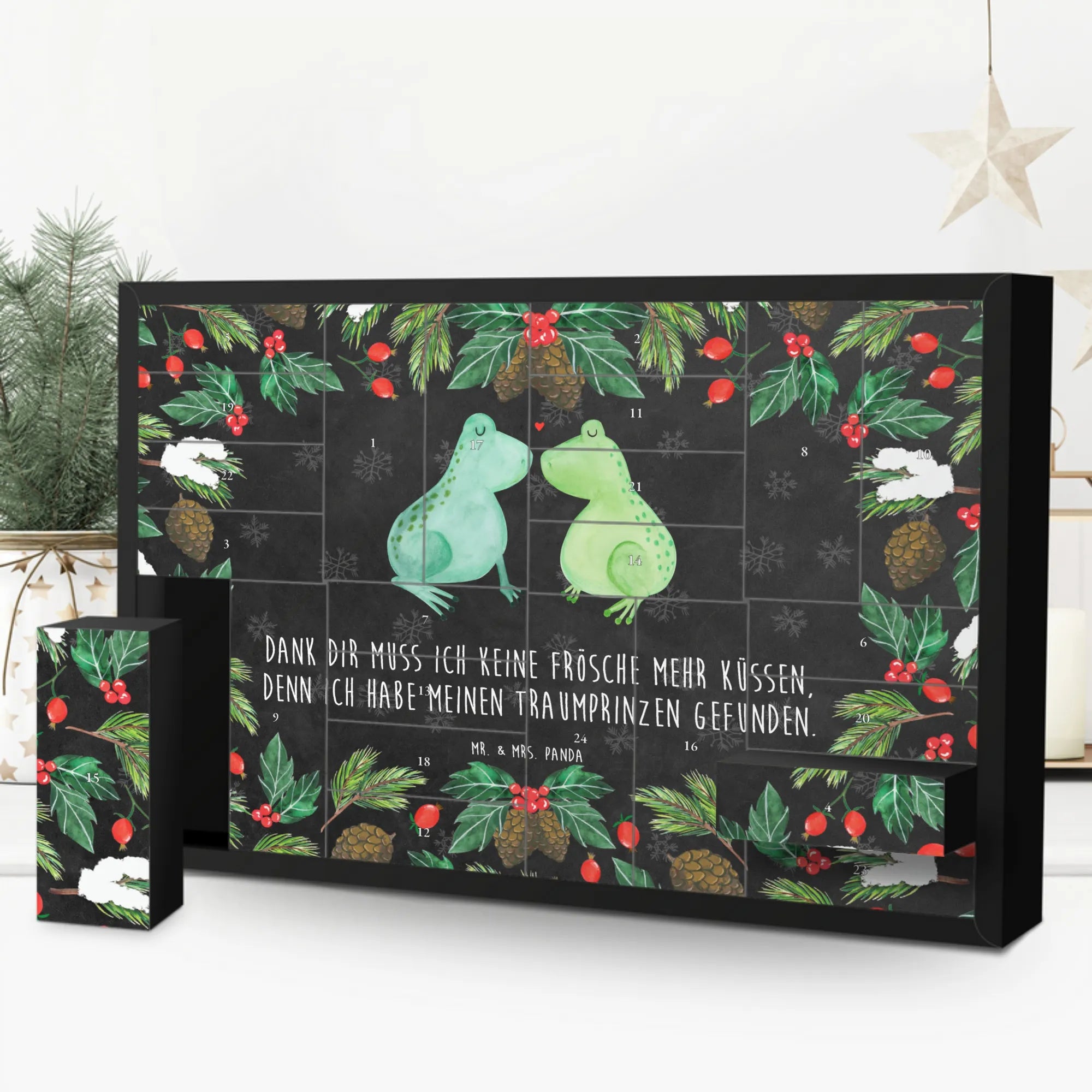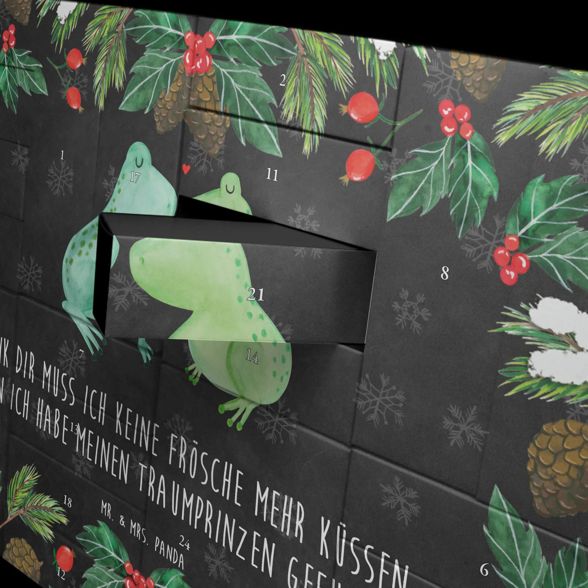 "Dank dir muss ich keine Frösche mehr Küssen, denn ich habe meinen Traumprinzen gefunden" – dieser süße Spruch macht das Geschenk besonders und persönlich. Verschenke Freude und Liebe mit dem Adventskalender Frosch Liebe von Mr. & Mrs. Panda und lass die Herzen deiner Liebsten höher schlagen! 🎁❤️