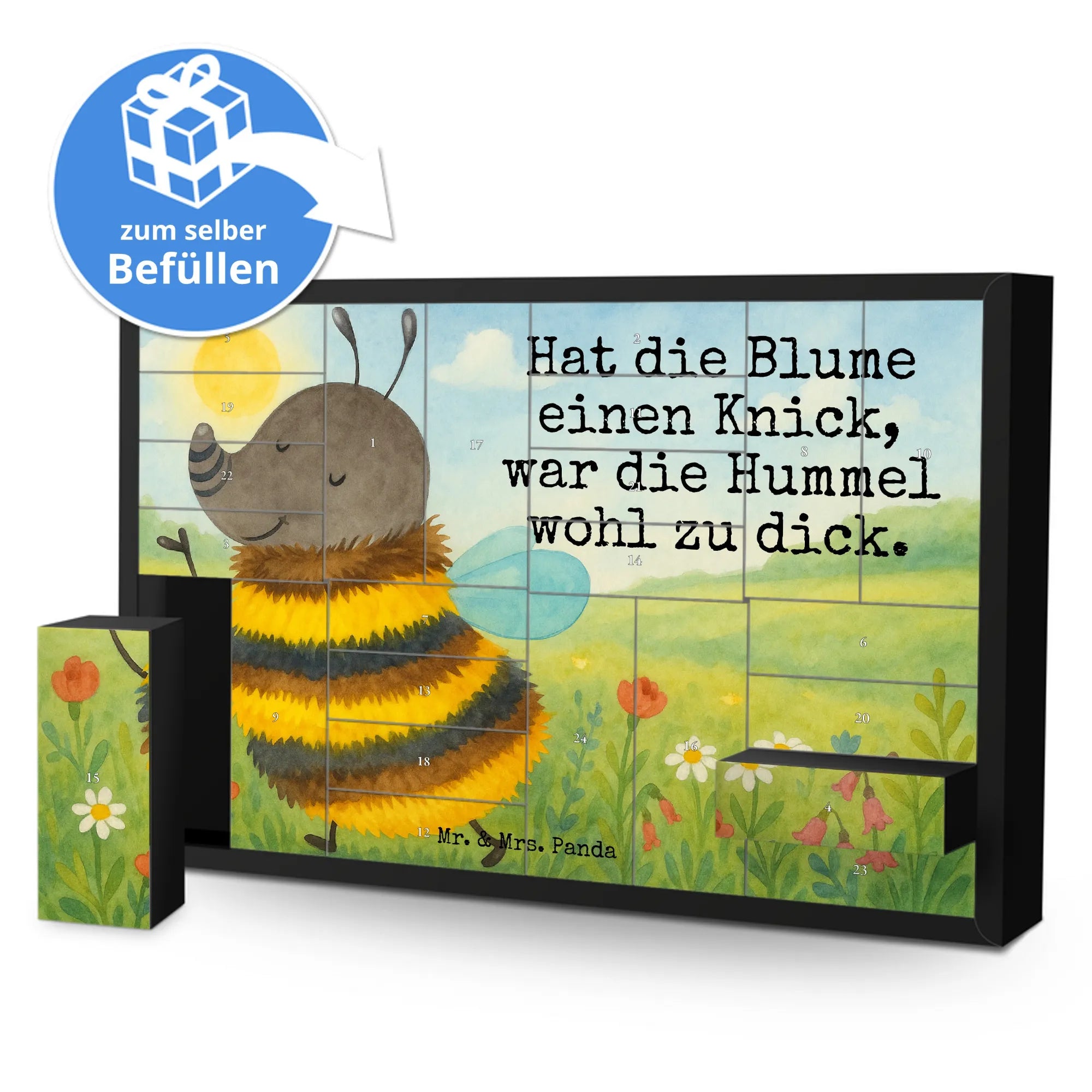 Wunderschöner, befüllbarer Adventskalender von Mr. & Mrs. Panda – perfekt, um die Vorweihnachtszeit ganz persönlich zu gestalten! Dieser liebevoll gestaltete Befüllbarer Adventskalender ist bedruckt mit schönen Sprüchen und zauberhaften Motiven von Mr. & Mrs. Panda. Auf der Frontseite begrüßt dich eine herzliche Zeichnung von Mrs. Panda, die dem Kalender seinen unverwechselbaren Charme verleiht. Der Kalender bietet 24 einzelne Schachteln zum Selbstbefüllen, ideal für kleine Überraschungen, Süßigkeiten oder persönliche Botschaften. Hergestellt aus stabilem Adventskalender Karton, überzeugt er durch brillante Druckqualität mit seidenmatter Oberfläche, die Farben und Details besonders schön zur Geltung bringt. Der Kalender ist nicht personalisierbar und wird ohne Füllung geliefert – so kannst du ihn ganz nach deinen Wünschen befüllen. Die praktische Aufstellvorrichtung sorgt dafür, dass der Kalender sicher und dekorativ steht. Maße: Breite: 619 mm, Höhe: 405 mm, Tiefe: 50 mm. Ob als Geschenk für die Familie, für Freunde oder als hübsche Deko für dein Zuhause – dieser Adventskalender zaubert Vorfreude und ist dabei robust und liebevoll gestaltet. Schenke dir oder deinen Liebsten jeden Tag im Advent ein kleines Lächeln mit diesem charmanten Begleiter von Mr. & Mrs. Panda.