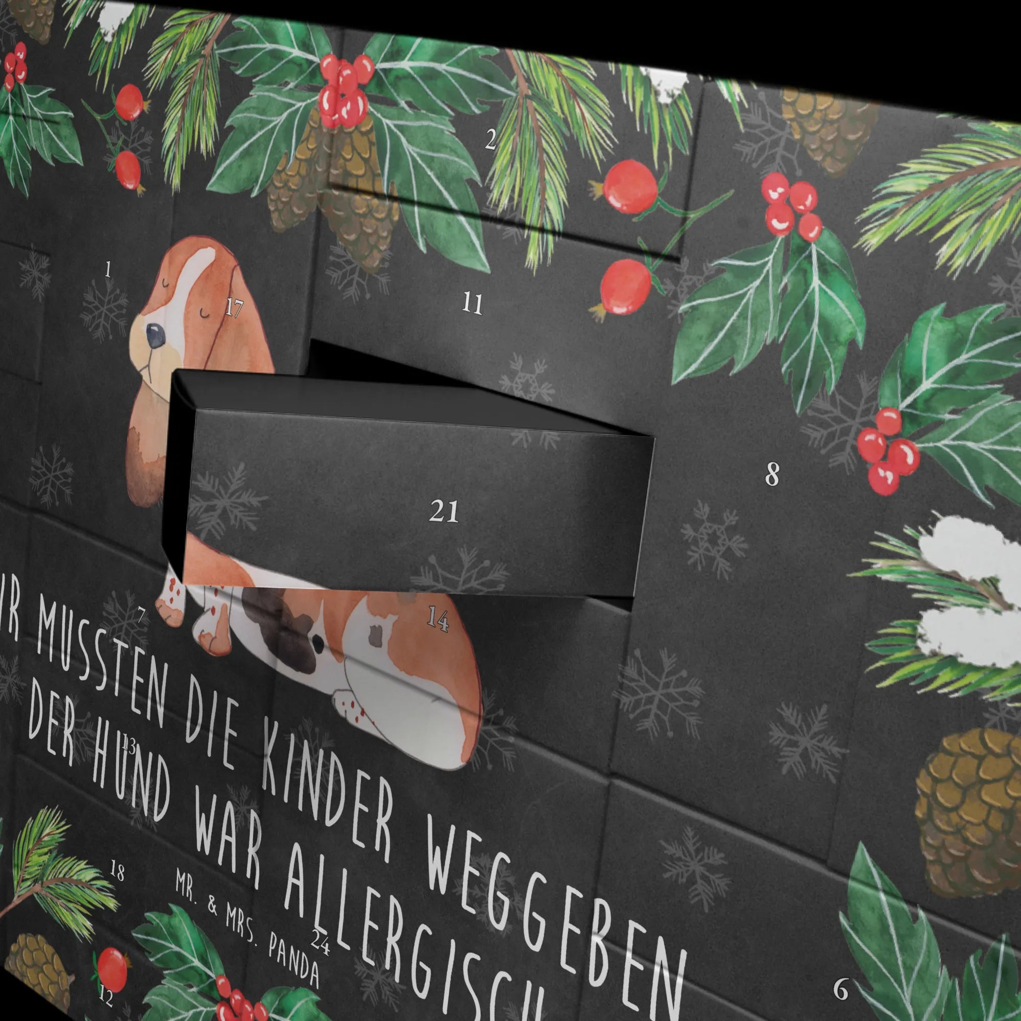 Der befüllbare Adventskalender vom Mr. & Mrs. Panda mit dem niedlichen Basset Hound-Motiv ist das perfekte Geschenk für alle Hundeliebhaber und besonders für jene, die keine Kinder haben! Mit dem liebevollen Spruch "Wir mussten die Kinder weggeben. Der Hund war allergisch." bringt er Farbe und Humor in die Vorweihnachtszeit.