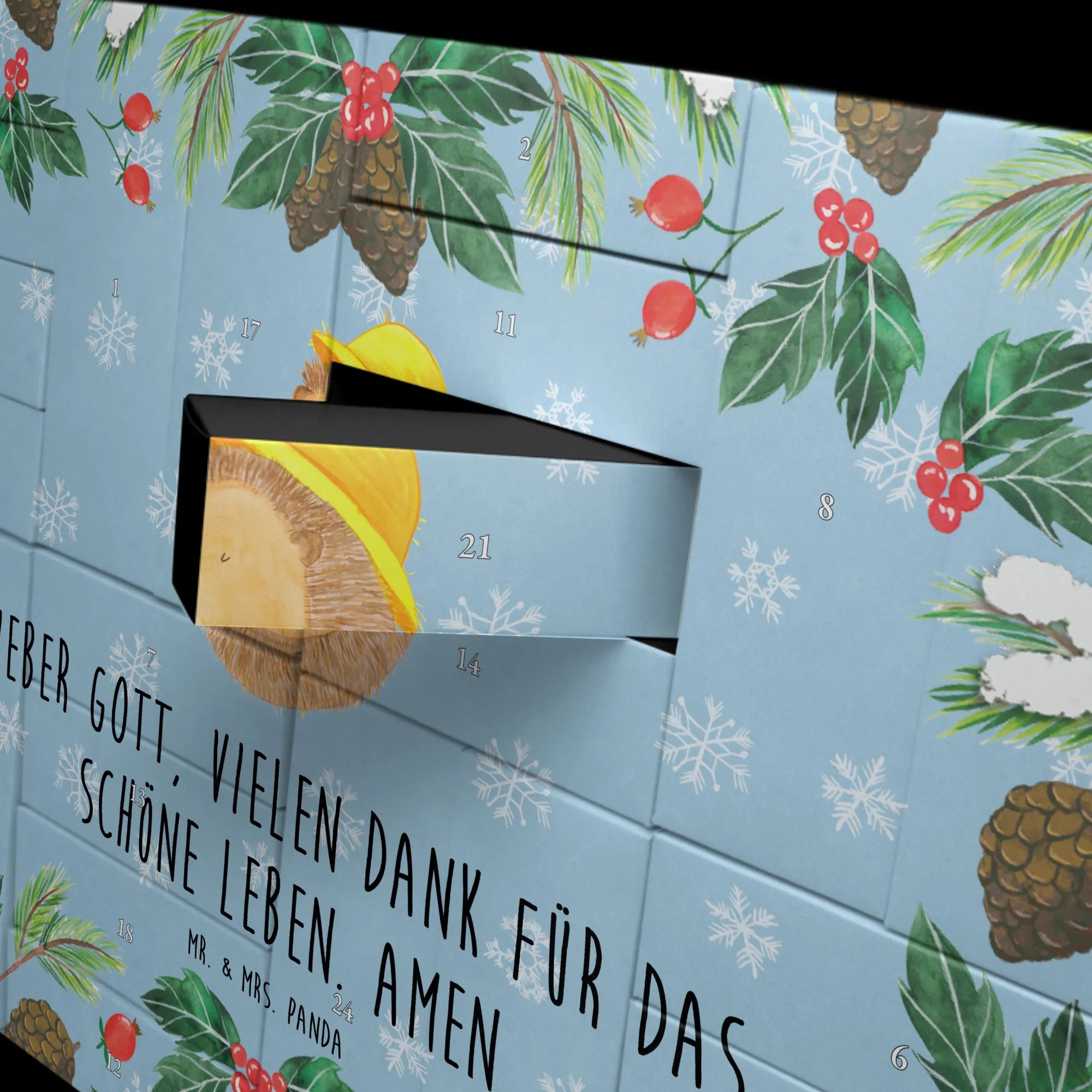 Der Befüllbare Adventskalender "Igel betet" von Mr. & Mrs. Panda ist das perfekte Geschenk für alle, die den Advent besinnlich und fröhlich gestalten möchten. Mit seinem liebevoll gezeichneten Igel, der in dem Motiv kniet und seine Hände zum Gebet faltet, bringt dieser Adventskalender nicht nur Freude in die Vorweihnachtszeit, sondern erinnert auch an die Dankbarkeit für die kleinen Dinge im Leben.
