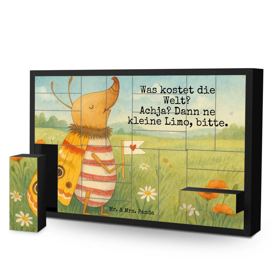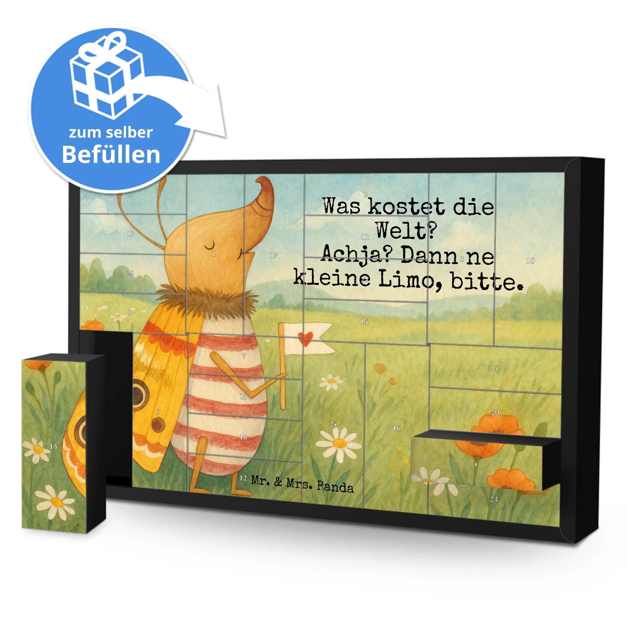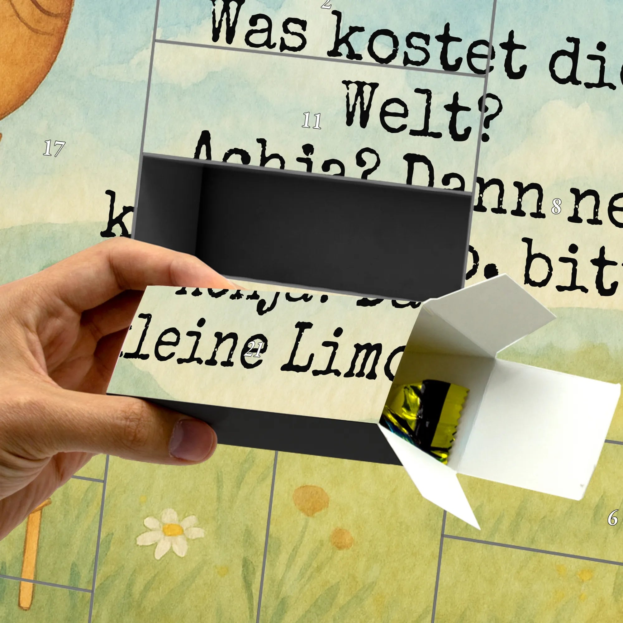 Komm mit auf eine nächtliche Entdeckungsreise! Unser befüllbarer Adventskalender „Nachtfalter mit Fähnchen“ aus der Small World Kollektion von Mr. & Mrs. Panda verbindet zarte Aquarell-Illustration mit einem frechen Spruch: Was kostet die Welt? Achja? Dann ne kleine Limo, bitte. Der kleine Nachtfalter hält eine herzförmige Fahne und lächelt – ein himmlischer Blickfänger für deine Adventszeit.