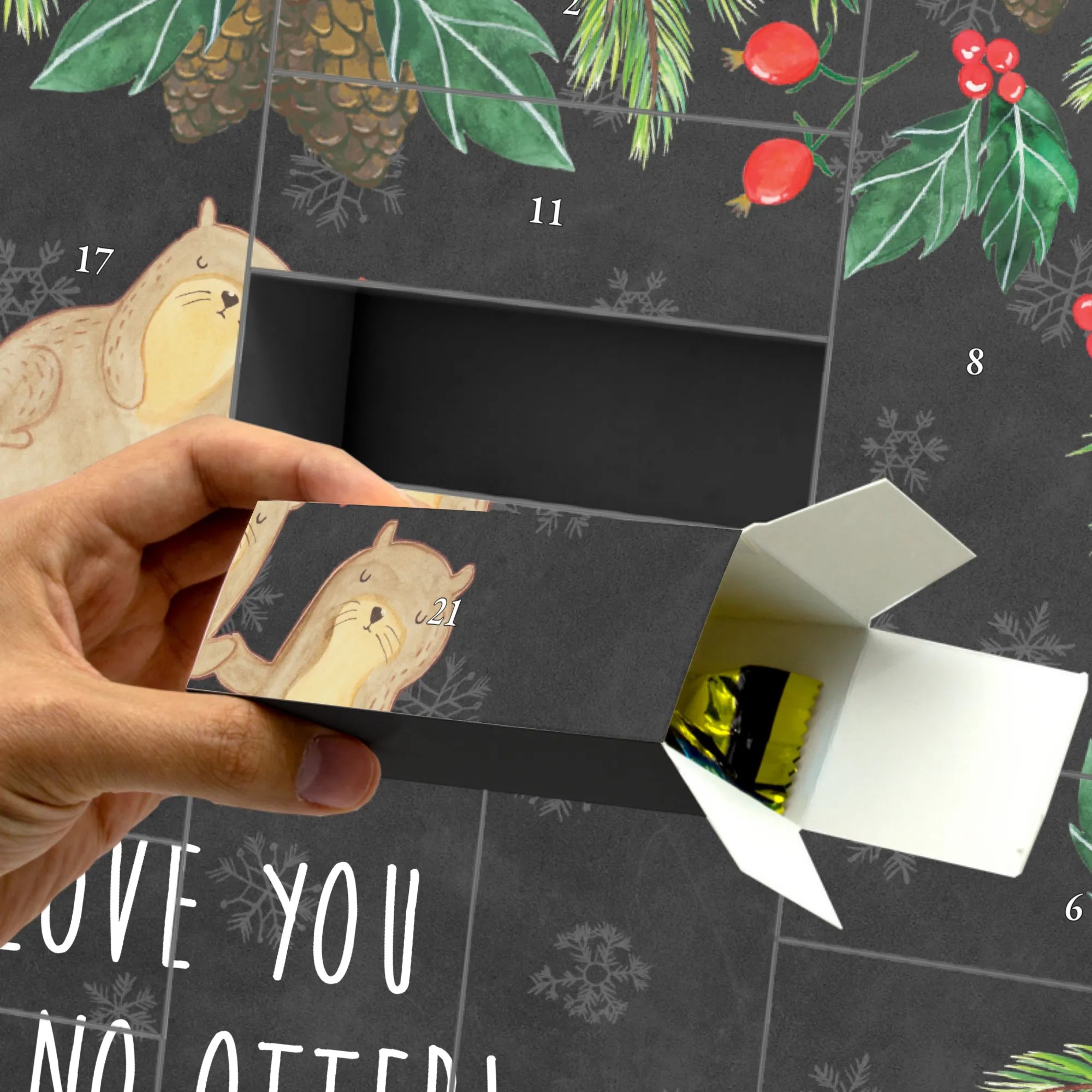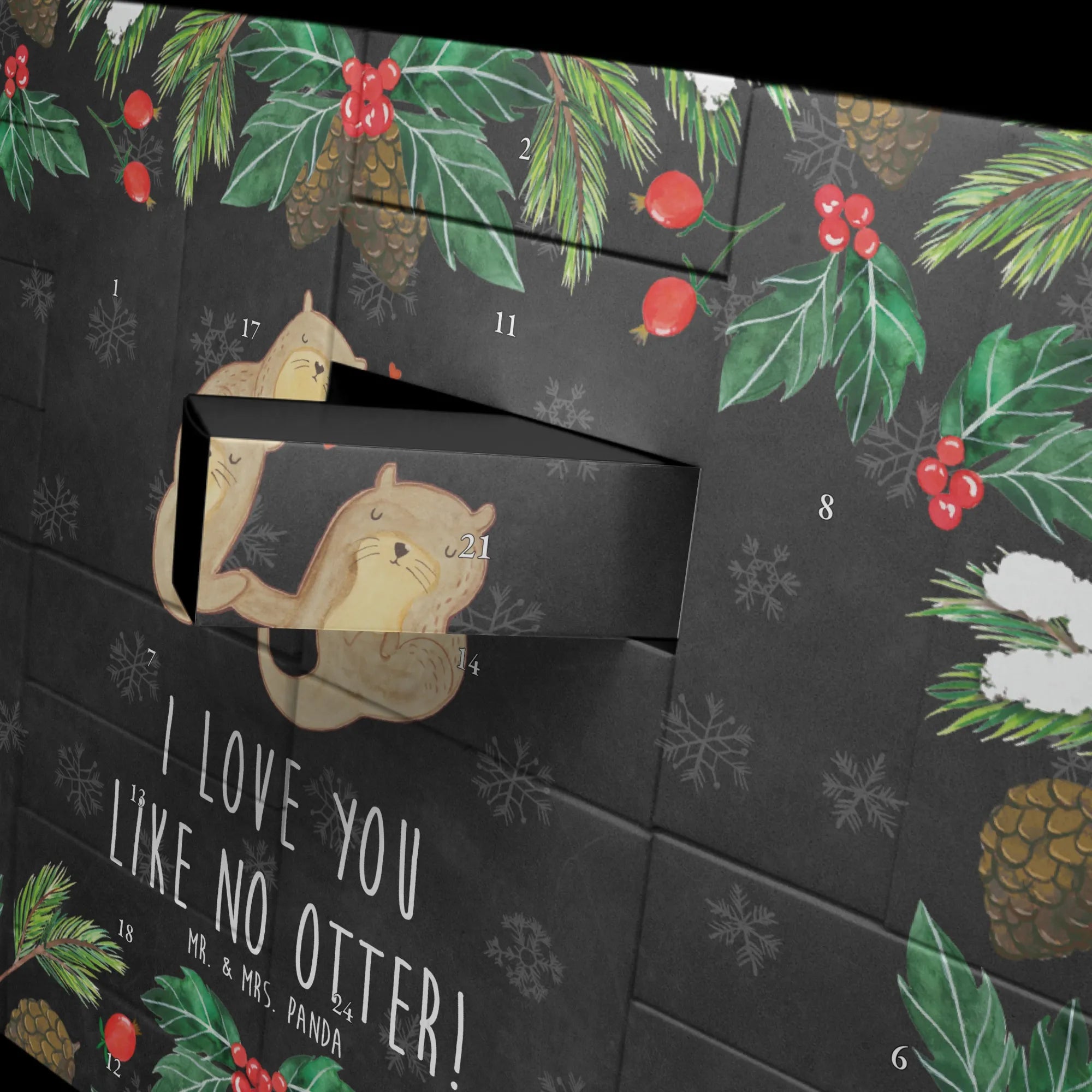Mach die Adventszeit zu etwas ganz Besonderem mit unserem einzigartigen befüllbaren Adventskalender von Mr. & Mrs. Panda! 🎄 Dieses bezaubernde Stück ist nicht nur ein Adventskalender, sondern auch ein liebevolles Geschenk, das perfekt für Otter-Fans ist. Design und Gestaltung stammen von Mrs. Panda, begeisterte Zeichnerin, und zeigen ein niedliches Otter-Pärchen, das Händchen haltend auf dem Rücken schwimmt. Diese liebevolle Zeichnung bringt ein Lächeln auf dein Gesicht und erinnert dich daran, dass du jemanden ganz Besonderen an deiner Seite hast. Mit dem Spruch "I love you like no otter!" werden deine Liebsten beim Öffnen jedes Türchens begeistert sein.