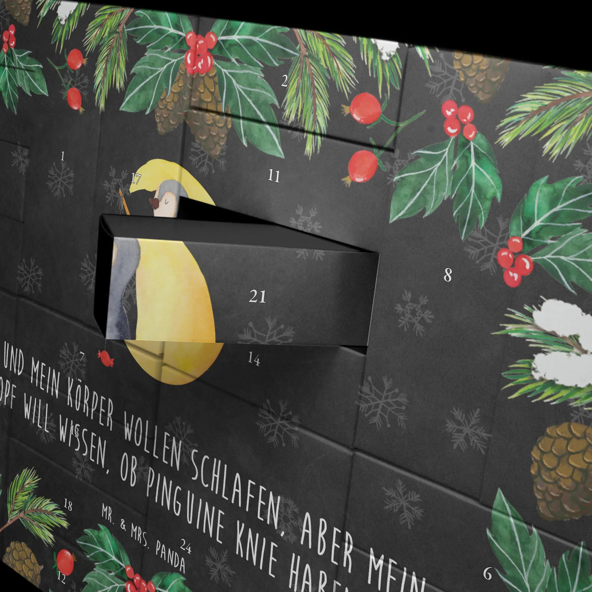 Das Motiv ist nicht nur niedlich, sondern auch mit einem witzigen Spruch versehen: 'Ich und mein Körper wollen schlafen, aber mein Kopf will wissen, ob Pinguine Knie haben...'. Damit wird der Kalender nicht nur zu einem Advents-Countdown, sondern auch zu einem Schmunzelobjekt, das jeden Tag ein Lächeln aufs Gesicht zaubert.