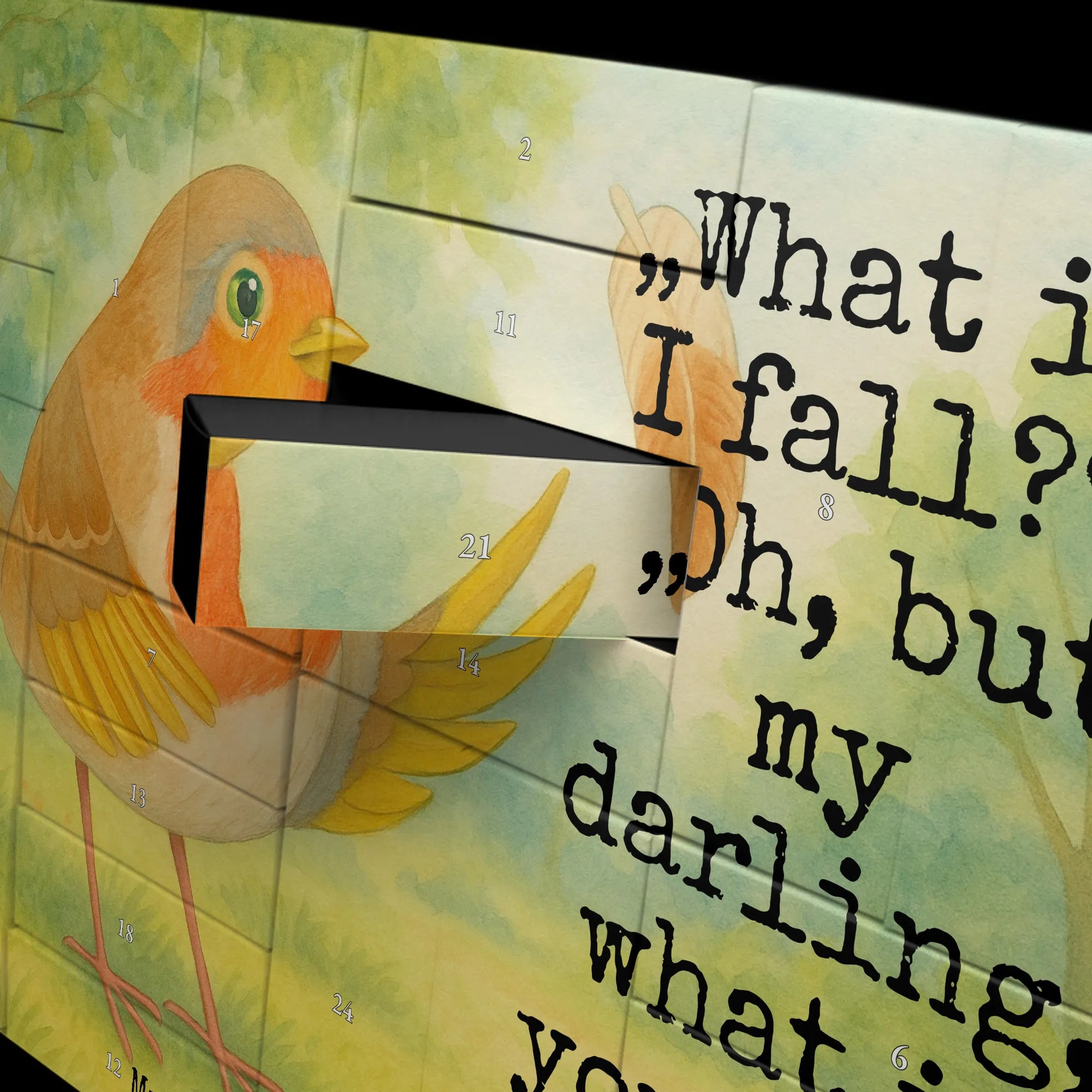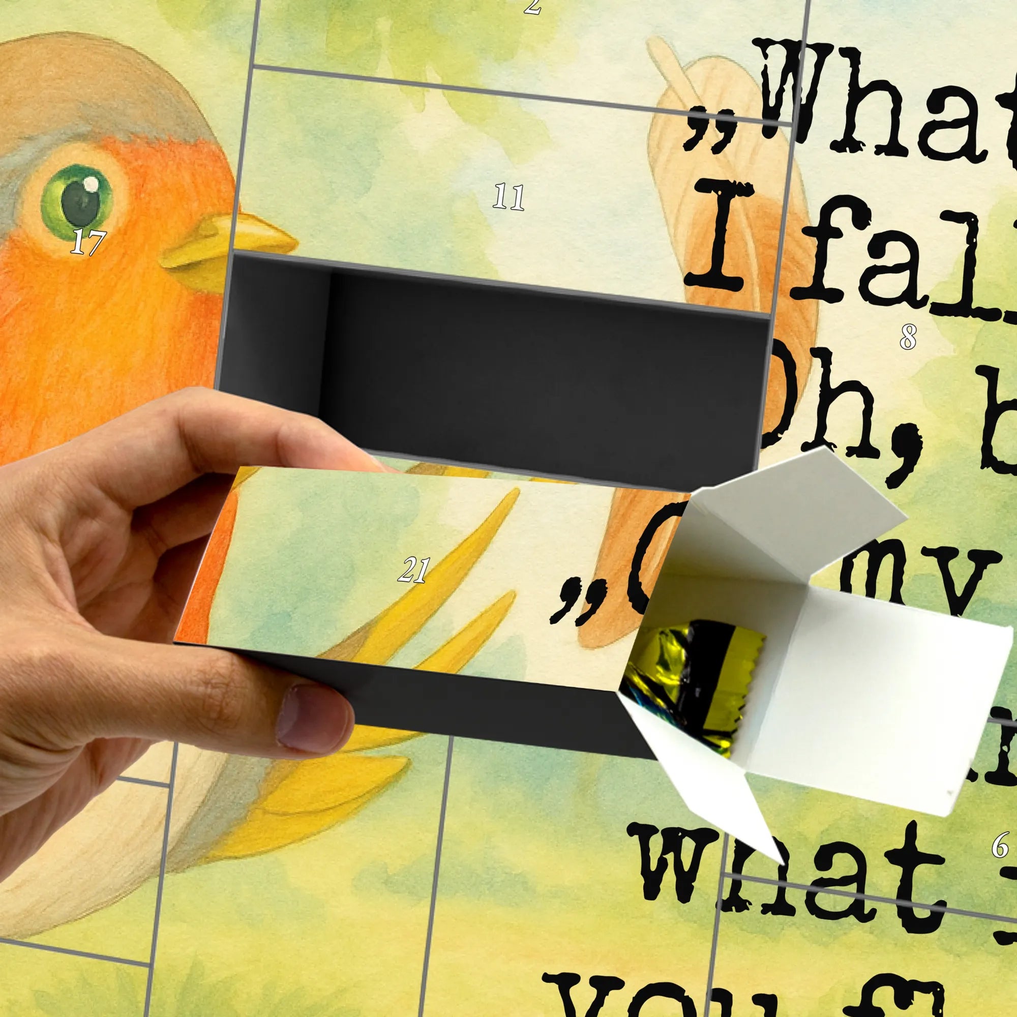 Dieser zauberhafte Adventskalender von Mr. & Mrs. Panda bringt Tierliebe, Mut und gute Laune in deine Vorweihnachtszeit. Die liebevoll von Mrs. Panda gezeichnete Aquarell-Illustration zeigt ein niedliches Rotkehlchen, umgeben von bunten Federn, und trägt den inspirierenden Spruch: „What if I fall?“ „Oh, but my darling, what if you fly?“ – ein kleiner Mutmacher für jeden Tag.