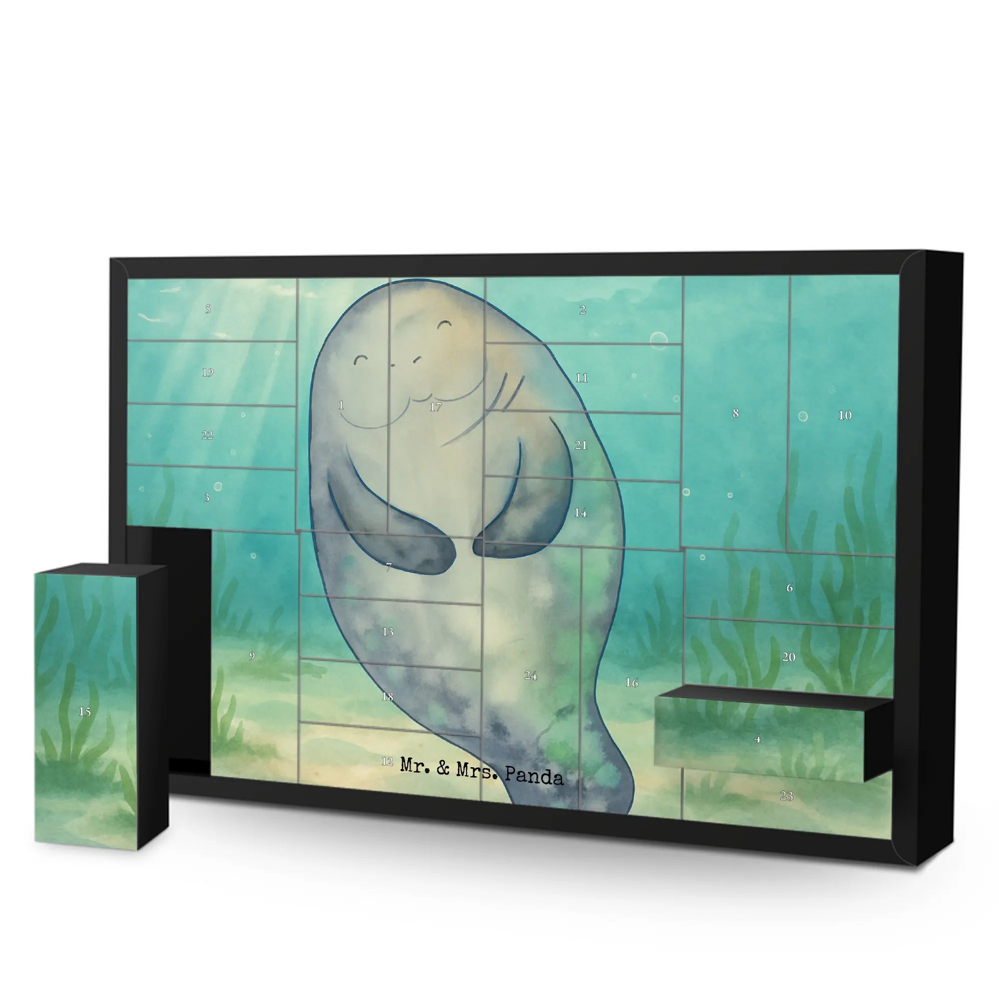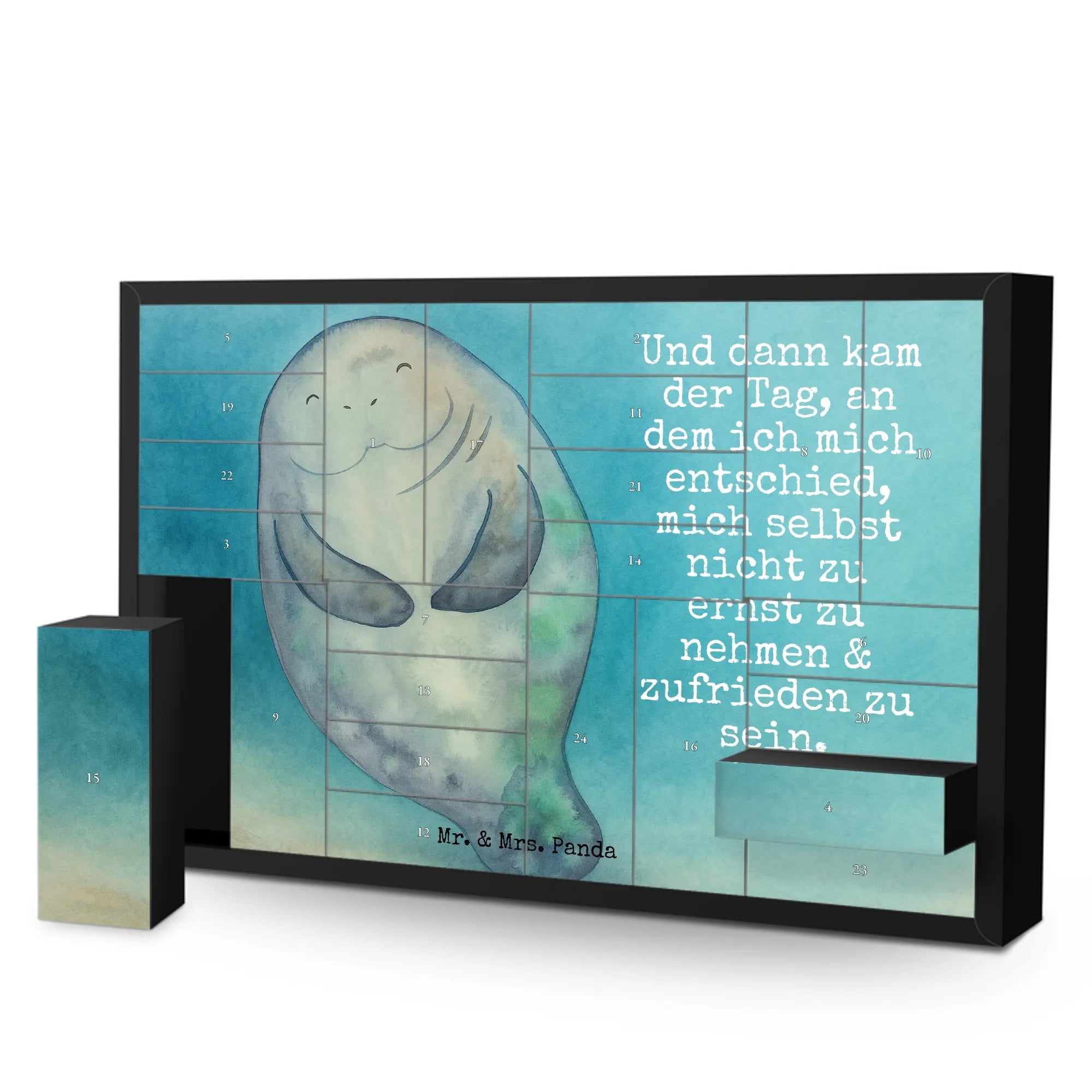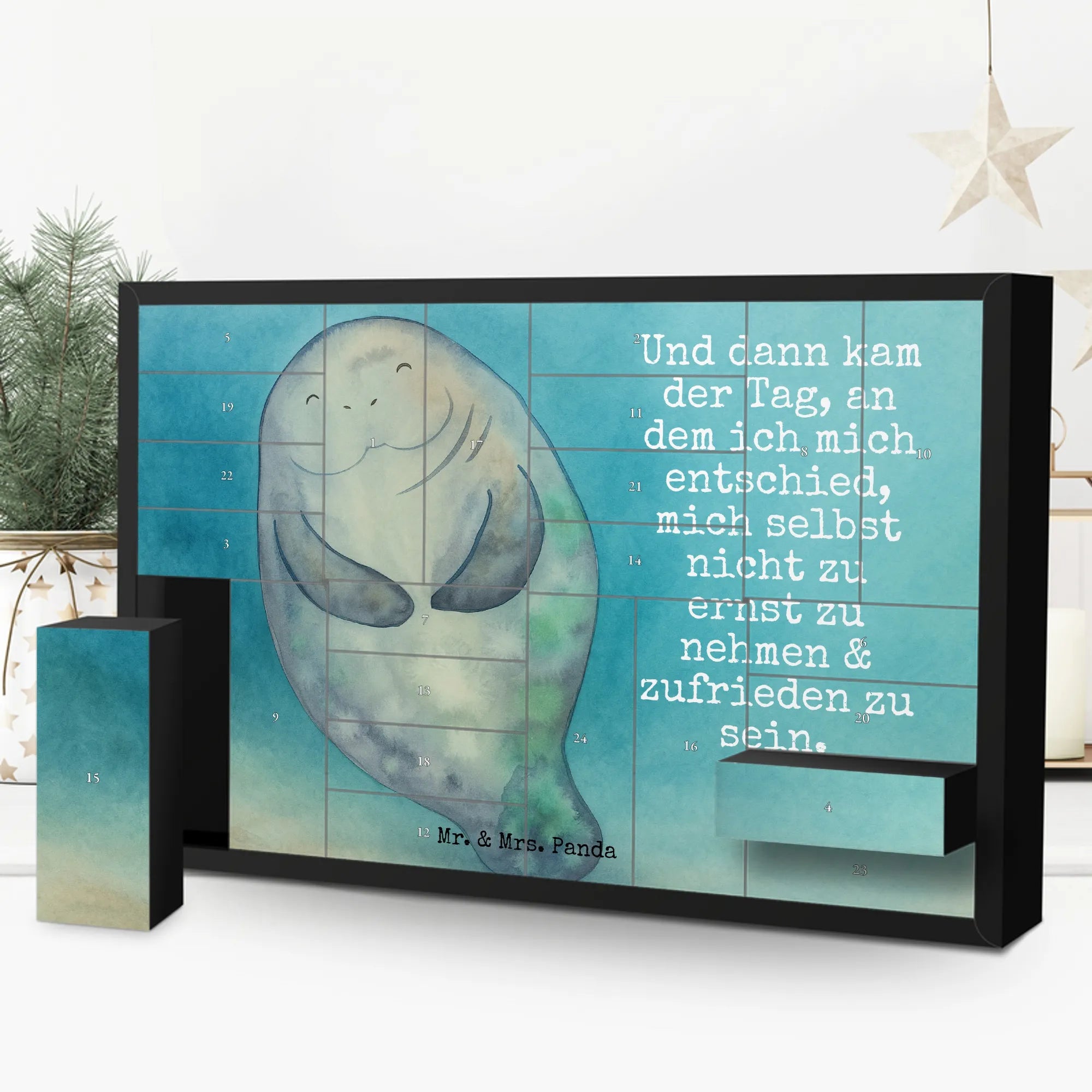 Stell dir vor, der erste Dezember steht vor der Tür und anstatt eines gewöhnlichen Kalenders wartet ein liebevoll gestaltetes Kunstwerk auf dich. Unser befüllbarer Adventskalender von Mr. & Mrs. Panda mit dem zauberhaften Seekuh-Motiv ist ein Bote für Achtsamkeit und Lebensfreude. 🌊