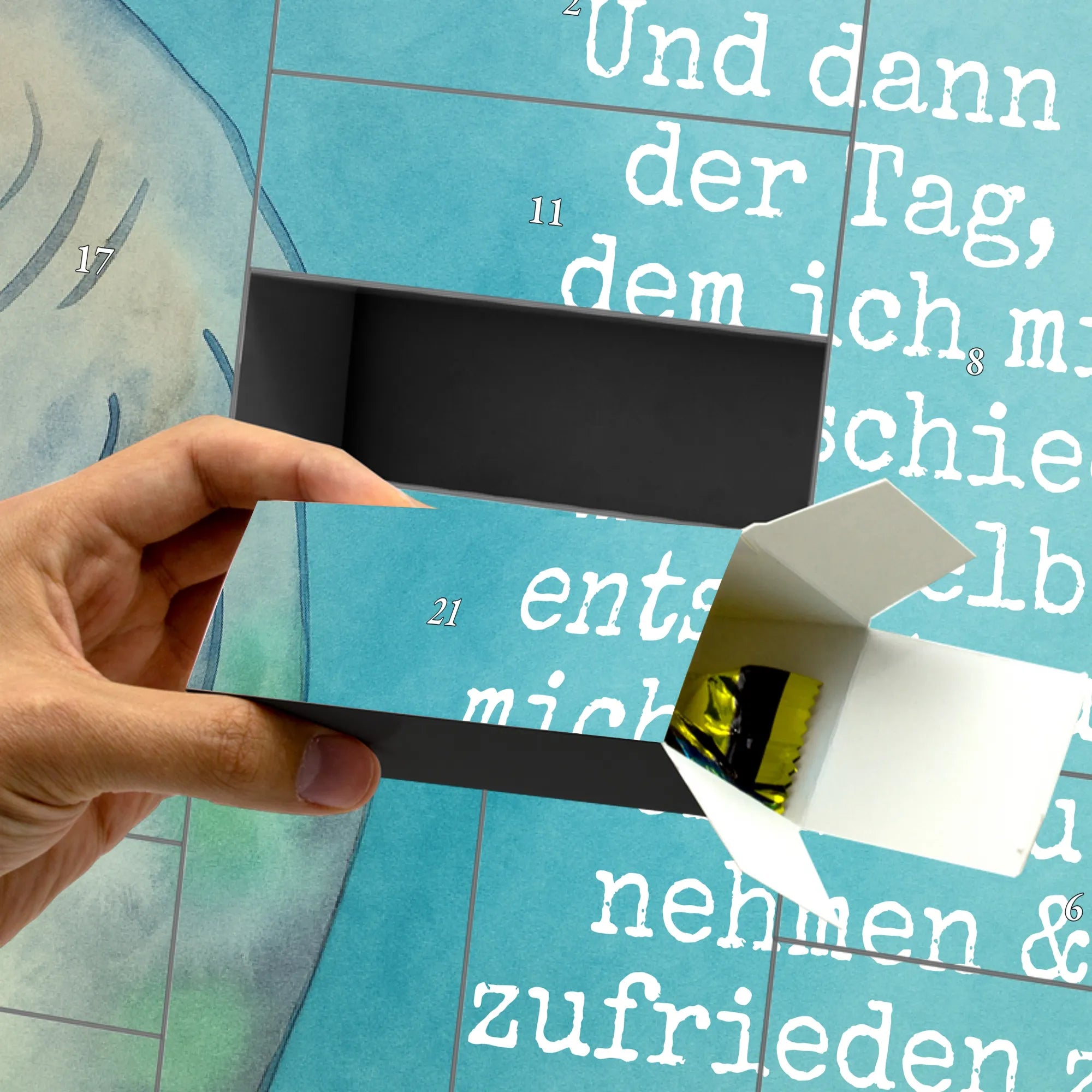 Das Motiv zeigt eine glückliche Seekuh, die mit einer Sanftheit und Ruhe durch das Wasser gleitet, die wir uns alle in der Adventszeit wünschen. Der begleitende Spruch 'Und dann kam der Tag, an dem ich mich entschied, mich selbst nicht zu ernst zu nehmen & zufrieden zu sein' ist eine kraftvolle Botschaft an dich selbst oder an einen geliebten Menschen. Er erinnert uns daran, dass Perfektionismus oft der Feind des Glücks ist. In einer Welt, die sich immer schneller dreht, schenkt dir dieser DIY Weihnachtskalender einen Moment des Innehaltens. ✨