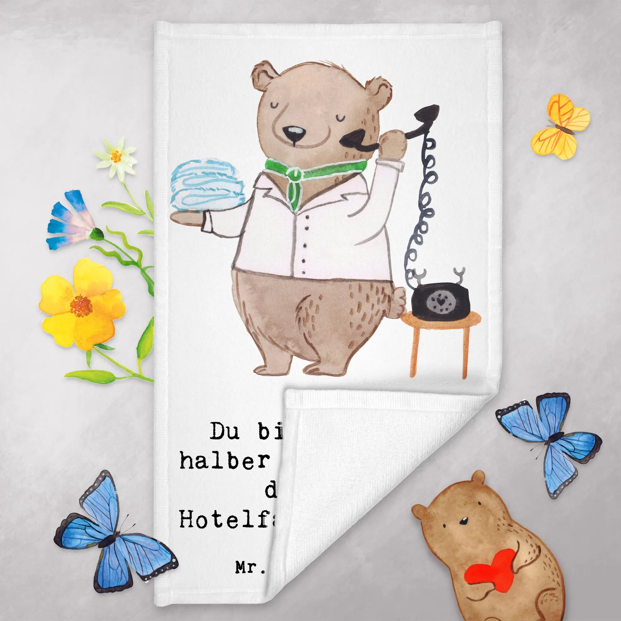 Das Gästehandtuch 'Hotelfachfrau mit Herz' von Mr. & Mrs. Panda ist das perfekte Geschenk für alle Hotelfachangestellten, Hotelkaufleute und zukünftigen Hotelier. Mit seinem charmanten Design und dem witzigen Spruch "Du bist nur ein halber Mensch, wenn du keine Hotelfachfrau bist." bringt es ein Lächeln in jedes Gesicht.