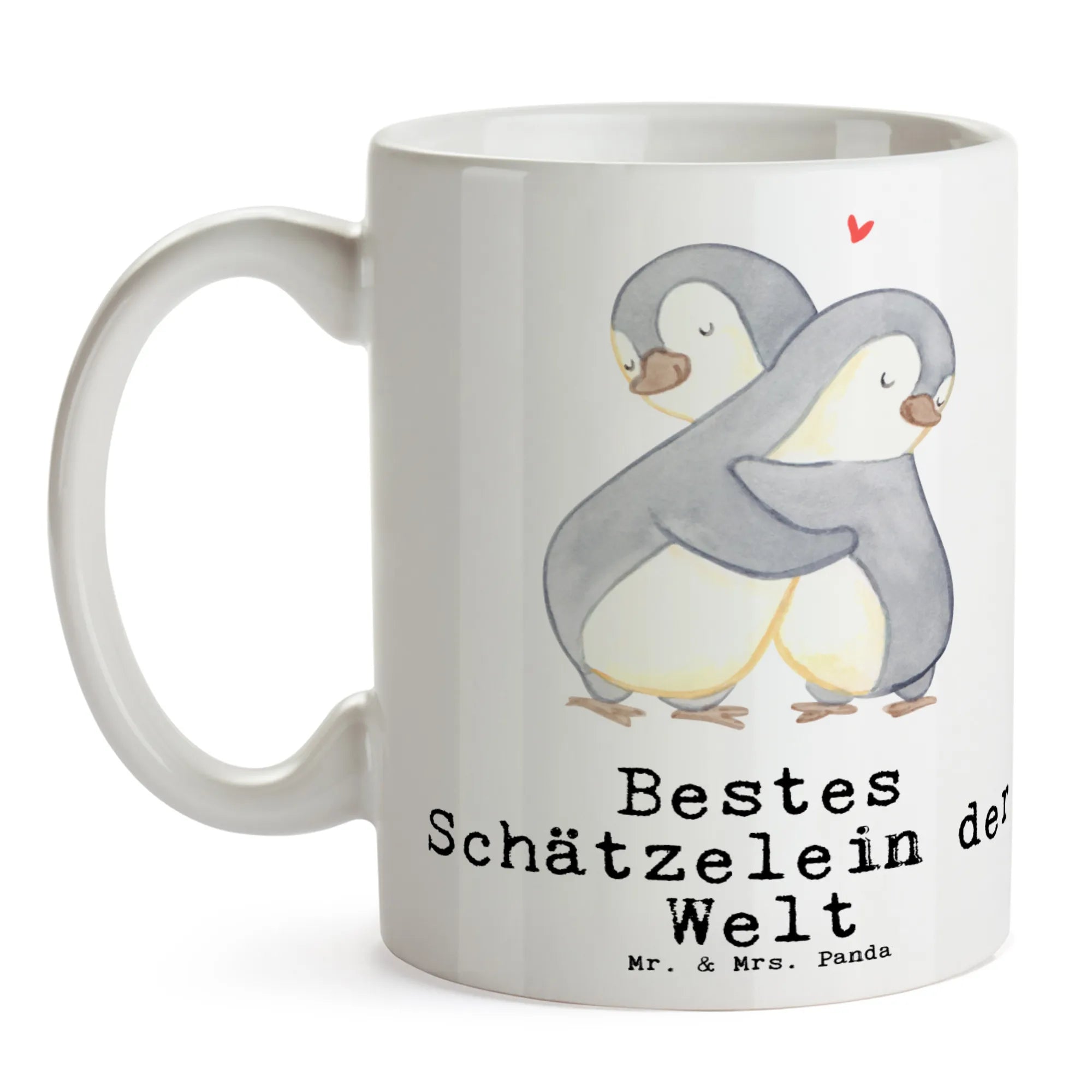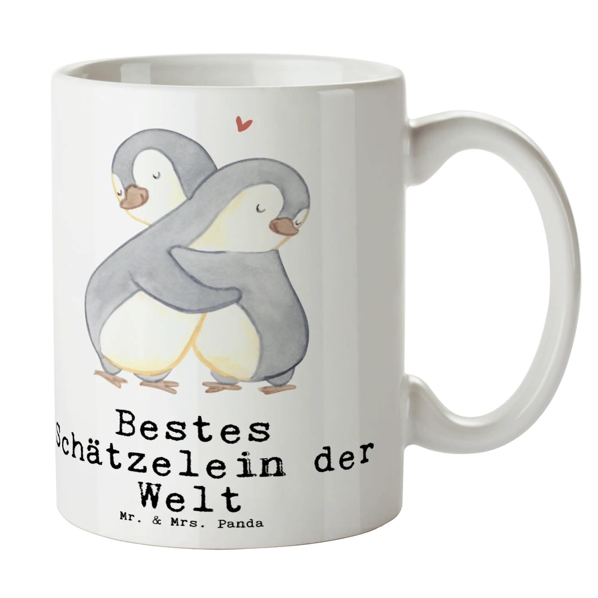 Das charmante Design zeigt zwei niedliche Pinguine, die sich im Arm halten, und der Slogan "Bestes Schätzelein der Welt" macht die Botschaft klar: Hier ist etwas für die besonderen Beziehungen in deinem Leben. Ob für deine Freundin, deinen Freund, Ehemann oder Ehefrau – diese Tasse bringt Liebesbeweise direkt in die Küche.