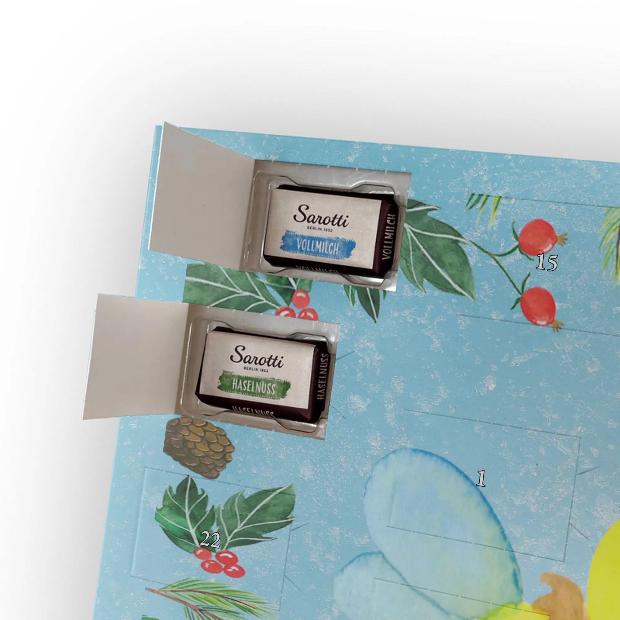 🐼 Adventskalender mit Schokolade, liebevoll bedruckt, seidenmatt veredelt.