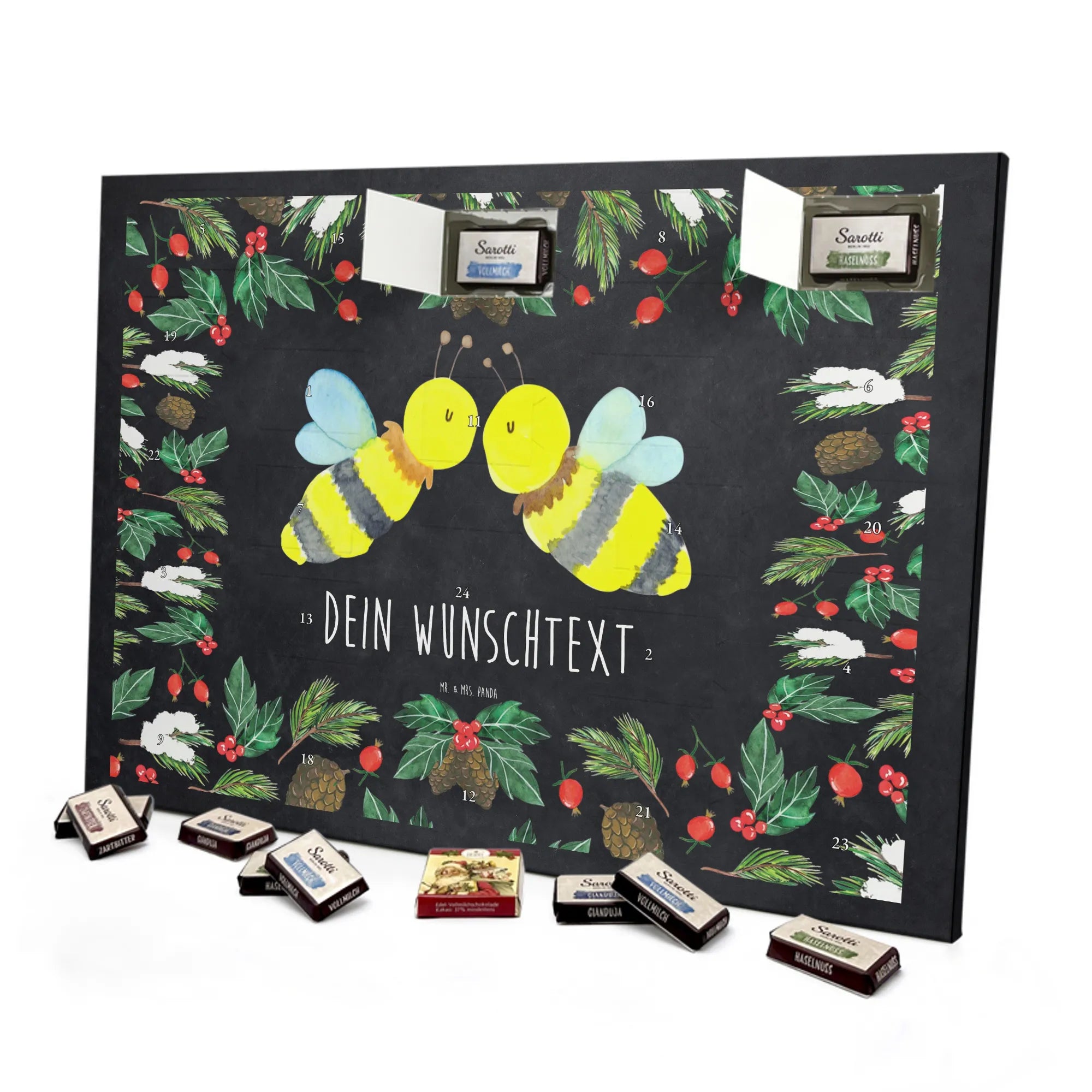 Der perfekte Adventskalender für individuelle Geschenkideen: Adventskalender mit Namen von Mr. & Mrs. Panda. Dieser Kalender ist mit liebevollen Motiven und frechen Sprüchen bedruckt und kann mit deinem Wunschtext oder Namen personalisiert werden – so wird jedes Türchen zur persönlichen Überraschung. Die brillante Druckqualität und die seidenmatte Oberflächenveredelung geben dem Kalender ein hochwertiges Aussehen, und die bedruckten Seitenflächen runden das Design ab. Maße: 355 mm x 245 mm x 11 mm. Du kannst den Kalender an die Wand hängen oder einfach aufstellen – praktisch und schön zugleich. Gefüllt ist er mit 24 einzeln verpackten Schokoladentäfelchen in vier köstlichen Geschmacksrichtungen. Insgesamt enthält er 107 g Markenschokolade von Sarotti® und Confiserie Heidel® in den Sorten Vollmilch, Nougat, Zartbitter und Haselnuss. Hinweis: Es handelt sich um einen Kalender gefüllt mit Sarotti® und Confiserie Heidel® Markenschokolade. Ob als liebevolles Geschenk für Kinder, Partner oder Freundinnen und Freunde – dieser Adventskalender sorgt für tägliche Vorfreude und süße Genussmomente.
