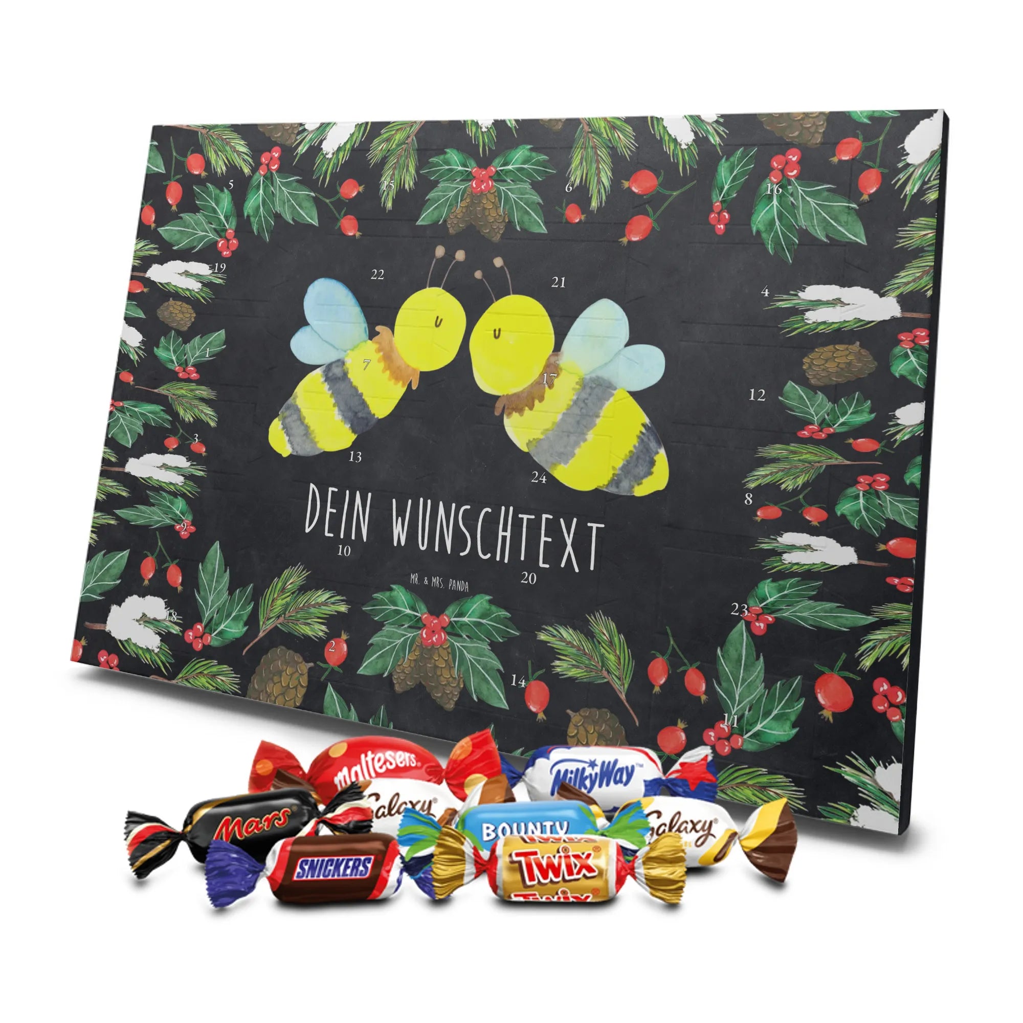 Adventskalender mit deinem Namen – individuell, süß und mit ganz viel Mr. & Mrs. Panda Charme! Dieser personalisierbare Schoko Adventskalender wird mit liebevollen Motiven & frechen Sprüchen bedruckt und lässt sich mit deinem Wunschnamen oder Wunschtext individualisieren. Durch die brillante Druckqualität und die seidenmatte Oberflächenveredelung wirken die Farben besonders intensiv und hochwertig. Auch die Seitenflächen sind bedruckt, sodass das Gesamtbild stimmig ist. Du hast die Wahl: Häng den Kalender auf oder stell ihn auf – beides funktioniert super. Der Kalender ist gefüllt mit Celebrations und enthält 24 hochwertige Füllungen in 8 verschiedenen Sorten, darunter Maltesers, Mars, Snickers, Twix, Milky Way, Bounty, Galaxy und Galaxy Caramel, die dir jeden Tag im Dezember ein Lächeln schenken. Maße: 325 mm x 225 mm x 27 mm – ideal dimensioniert für schöne Türchen-Überraschungen. Verschenke persönliche Vorfreude an Freunde, Familie oder gönn dir selbst diese zuckersüße Adventsüberraschung von Mr. & Mrs. Panda.