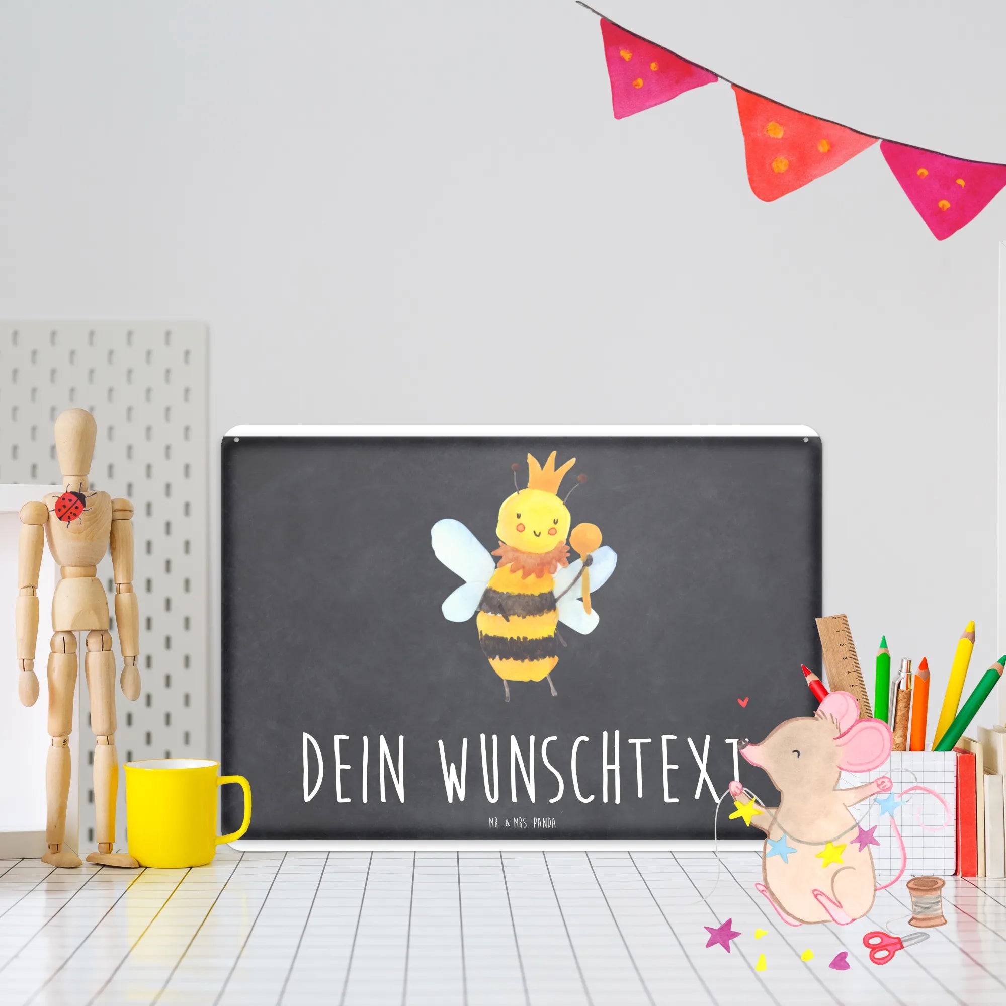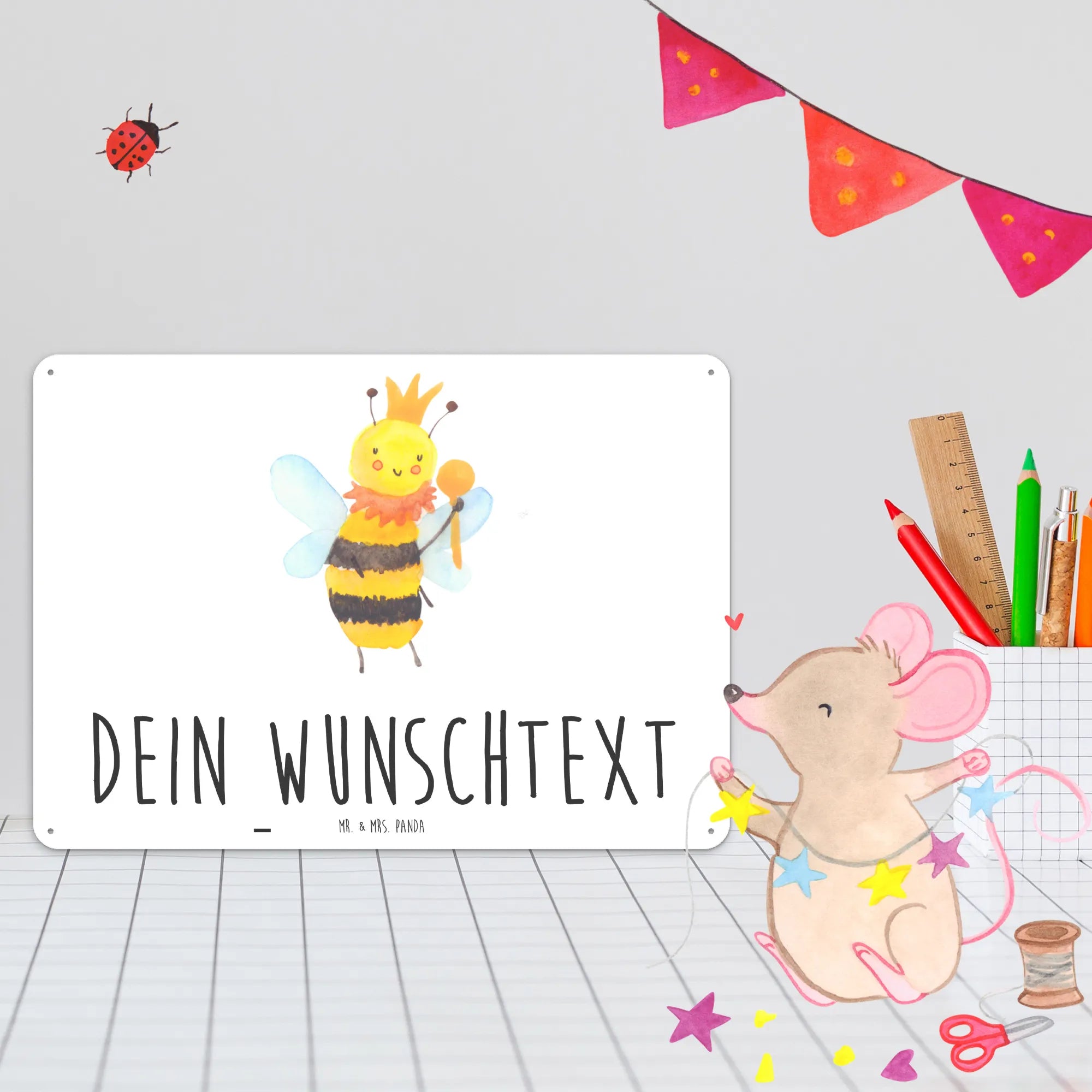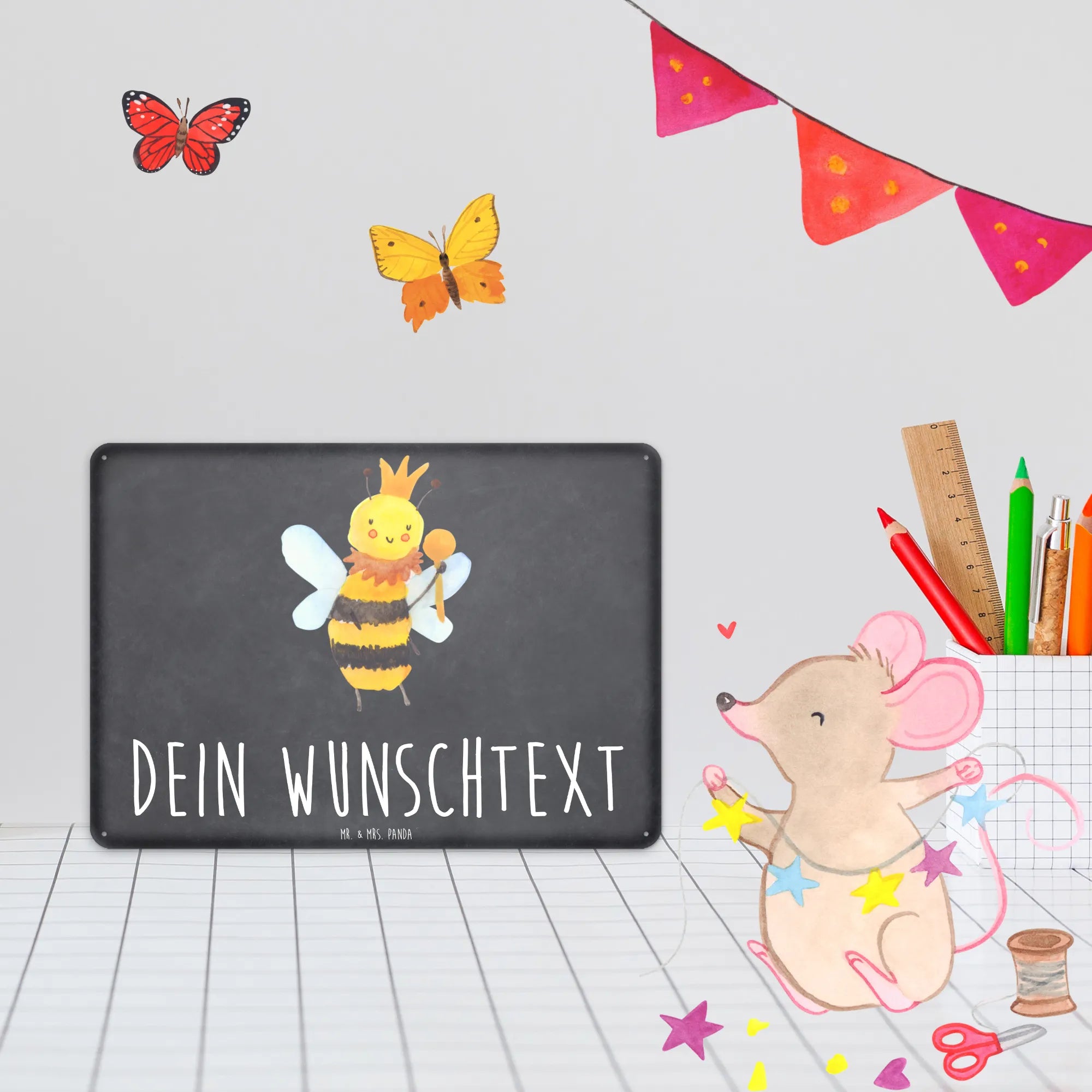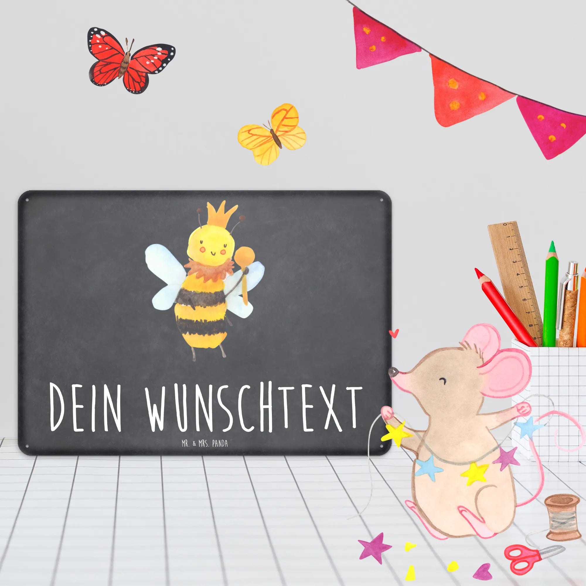 Die Bienen Kollektion von Mr. & Mrs. Panda ist eine zauberhafte Sammlung von handgezeichneten Motiven, die jedes Herz höher schlagen lässt! Wer könnte bei einer so charmanten Biene widerstehen? Verschenke Freude, Stil und eine Botschaft – mit unserem personalisierten Blechschild "Biene König" machst du alles richtig!