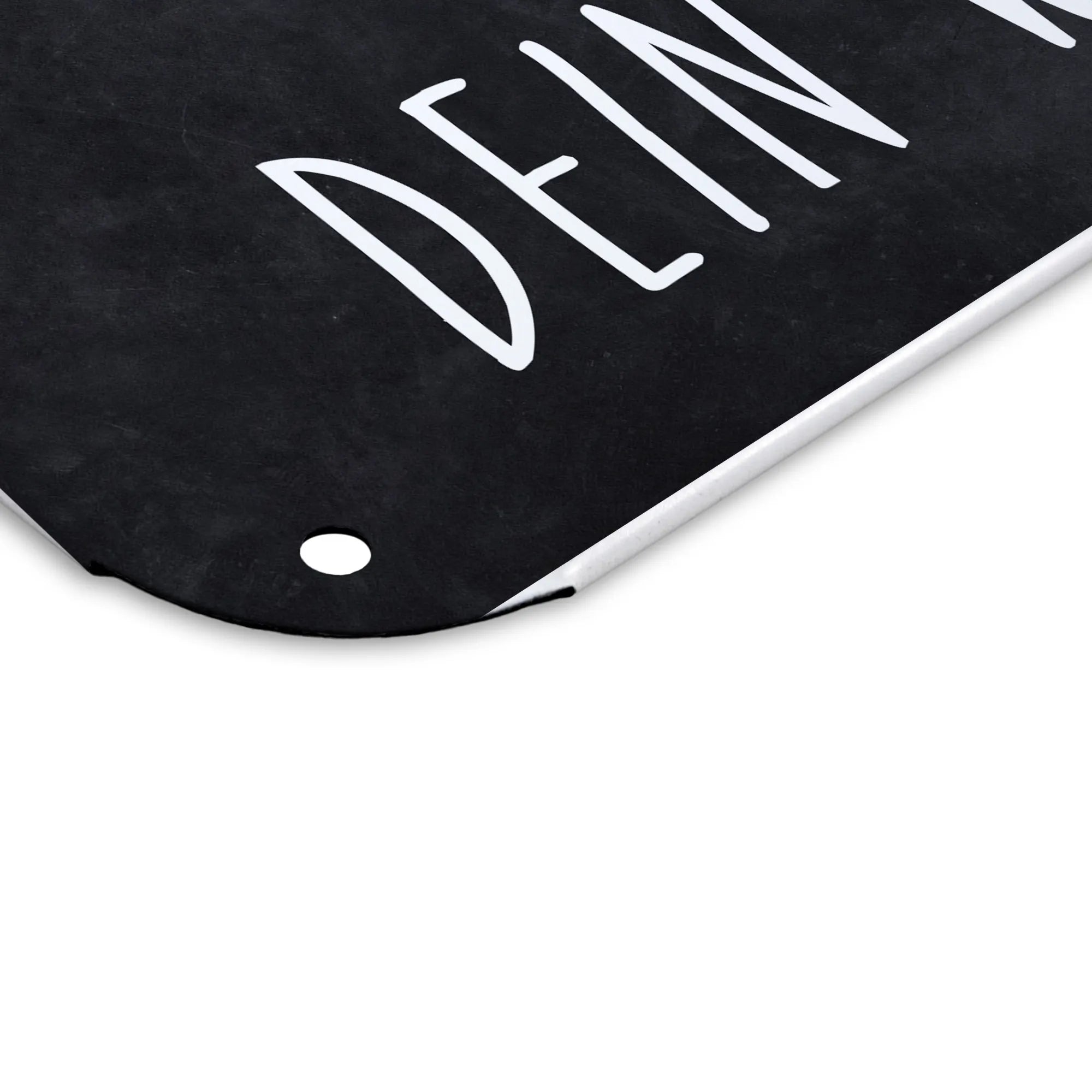 Das Schild hat die Maße DIN A5 und besteht aus hochwertigem Stahlblech ohne Wölbung. Es besticht durch seine edle, seidenmatte Oberfläche, die sich wunderbar in jeden Einrichtungsstil einfügt. Die Kanten sind umgefasst und die Ecken abgerundet, damit es sowohl sicher als auch stilvoll ist. Mit vier Bohrungen kannst du das Schild einfach an der Wand oder an deiner Tür anbringen.