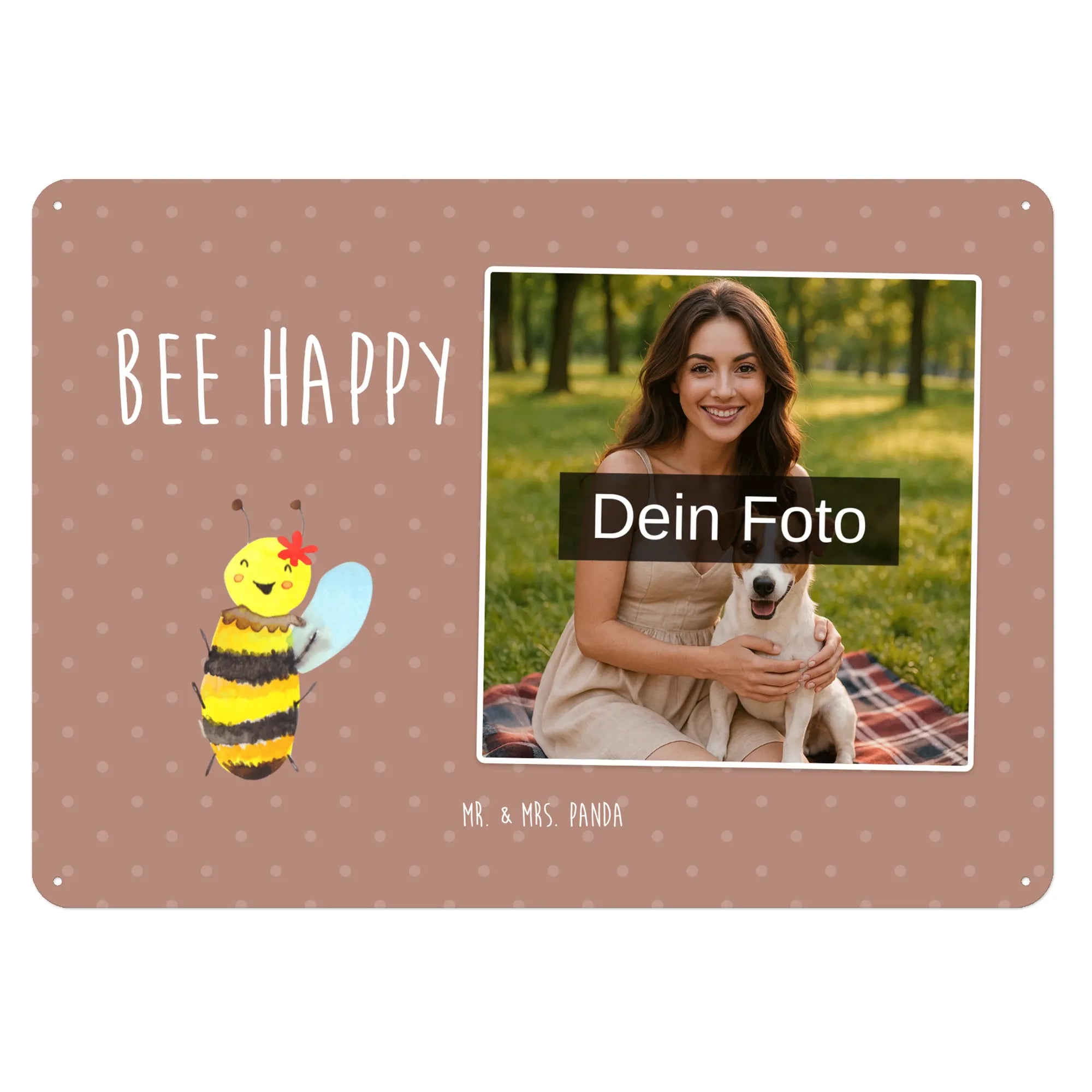 Flieg mit unserer fröhlichen „Biene Happy“ durch den Alltag und bring ein kleines Stück Sonnenschein an deine Wand oder an die Tür. Dieses personalisierte Foto-Blechschild von Mr. & Mrs. Panda vereint eine liebevoll handgezeichnete Illustration mit deinem eigenen Foto – edel bedruckt und langlebig.
