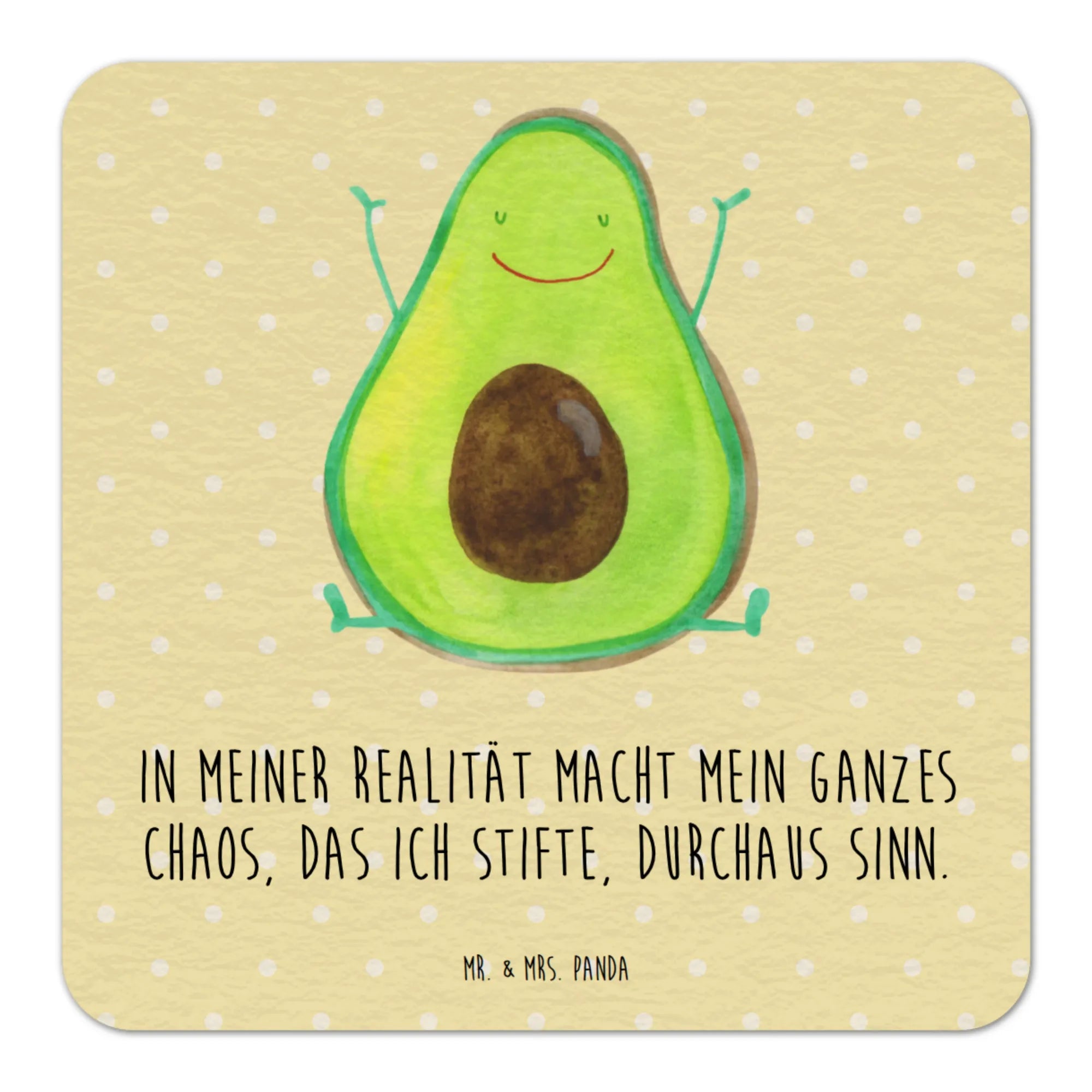 Suchst du ein kleines, liebevolles Geschenk, das Gäste lächeln lässt? Unser quadratischer Bierdeckel „Avocado Happy“ von Mr. & Mrs. Panda bringt sofort gute Laune auf den Tisch. Die fröhliche Avocado streckt die Arme nach oben und der Spruch „In meiner Realität macht mein ganzes Chaos, das ich stifte, durchaus Sinn.“ sorgt für viele Schmunzler und Gesprächsthemen – perfekt als Gastgeschenk Hochzeit oder Erinnerungsstück an einen unvergesslichen Abend.