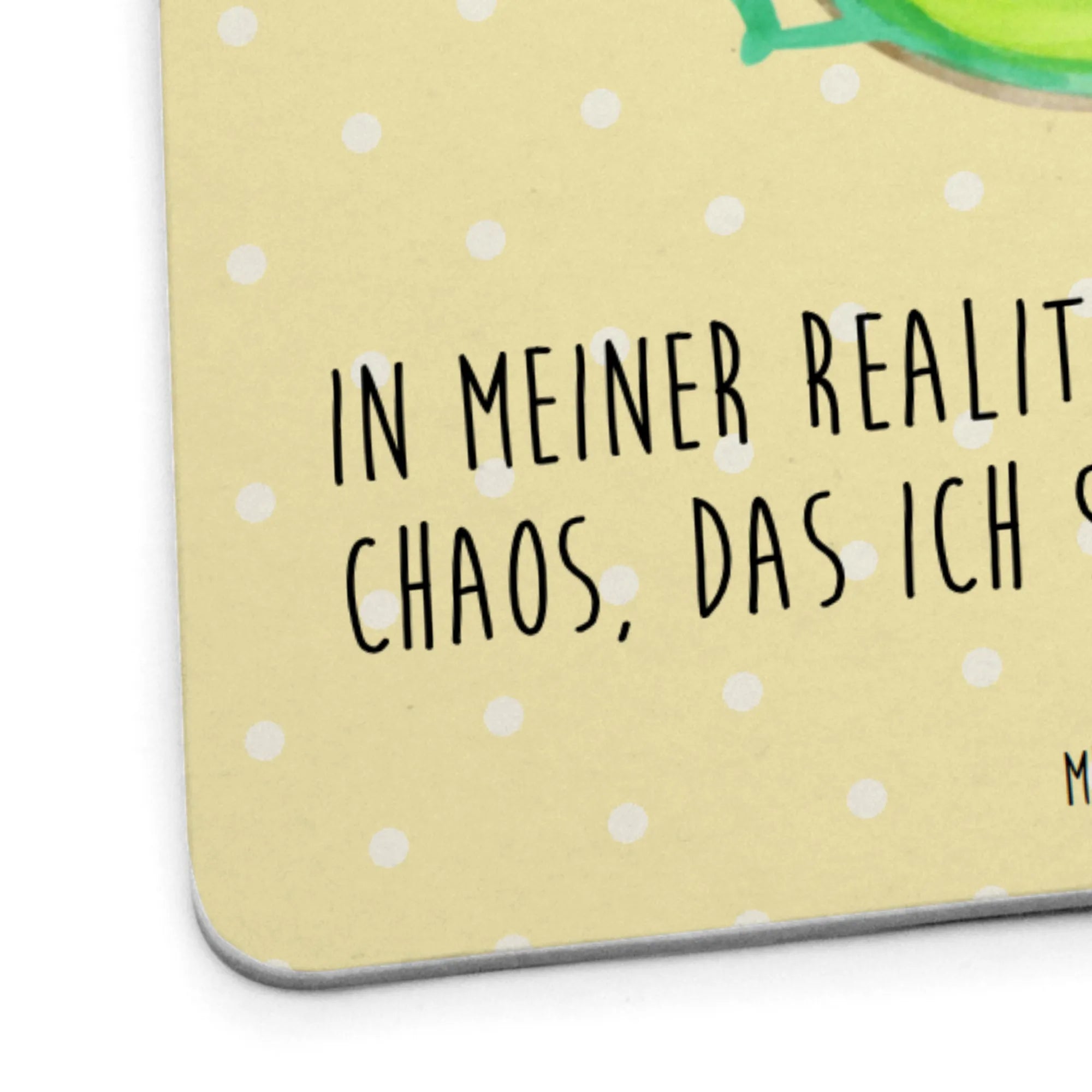 Warum er so gut passt: Die sonnige Gelb-Optik zieht Blicke an, die fröhliche Avocado mit erhobenen Armen bringt gute Laune, und der Spruch „In meiner Realität macht mein ganzes Chaos, das ich stifte, durchaus Sinn.” sorgt für Schmunzeln und Gesprächsstoff. Ideal als Gastgeschenk Hochzeit, Erinnerung an den perfekten Abend oder einfach als stylisches Detail auf Deinem Esstisch.