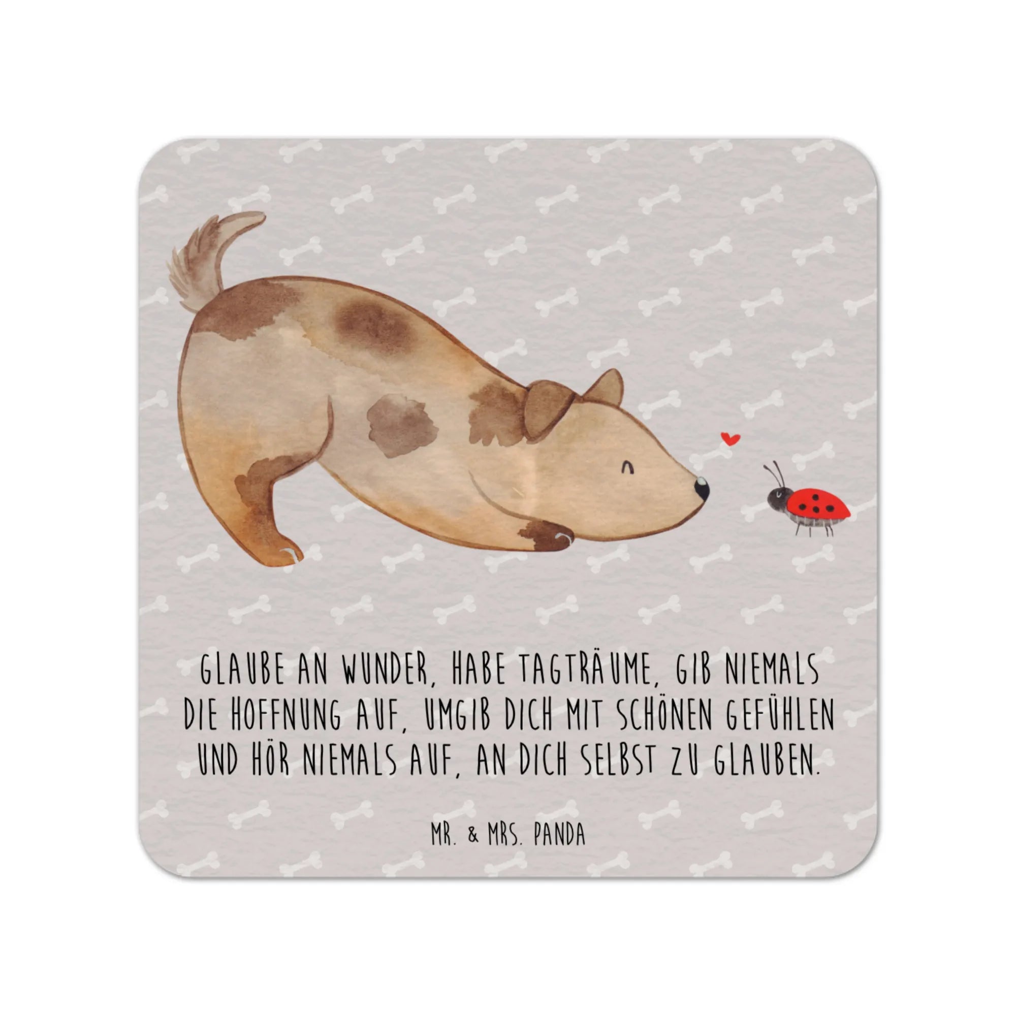 Suchst du nach einem besonderen Geschenk oder einem einzigartigen Gastgeschenk für deine Hochzeitsgäste? Dann ist unser quadratischer Bierdeckel "Hund Marienkäfer" aus der beliebten Hunde Kollektion von Mr. & Mrs. Panda genau das Richtige für dich!