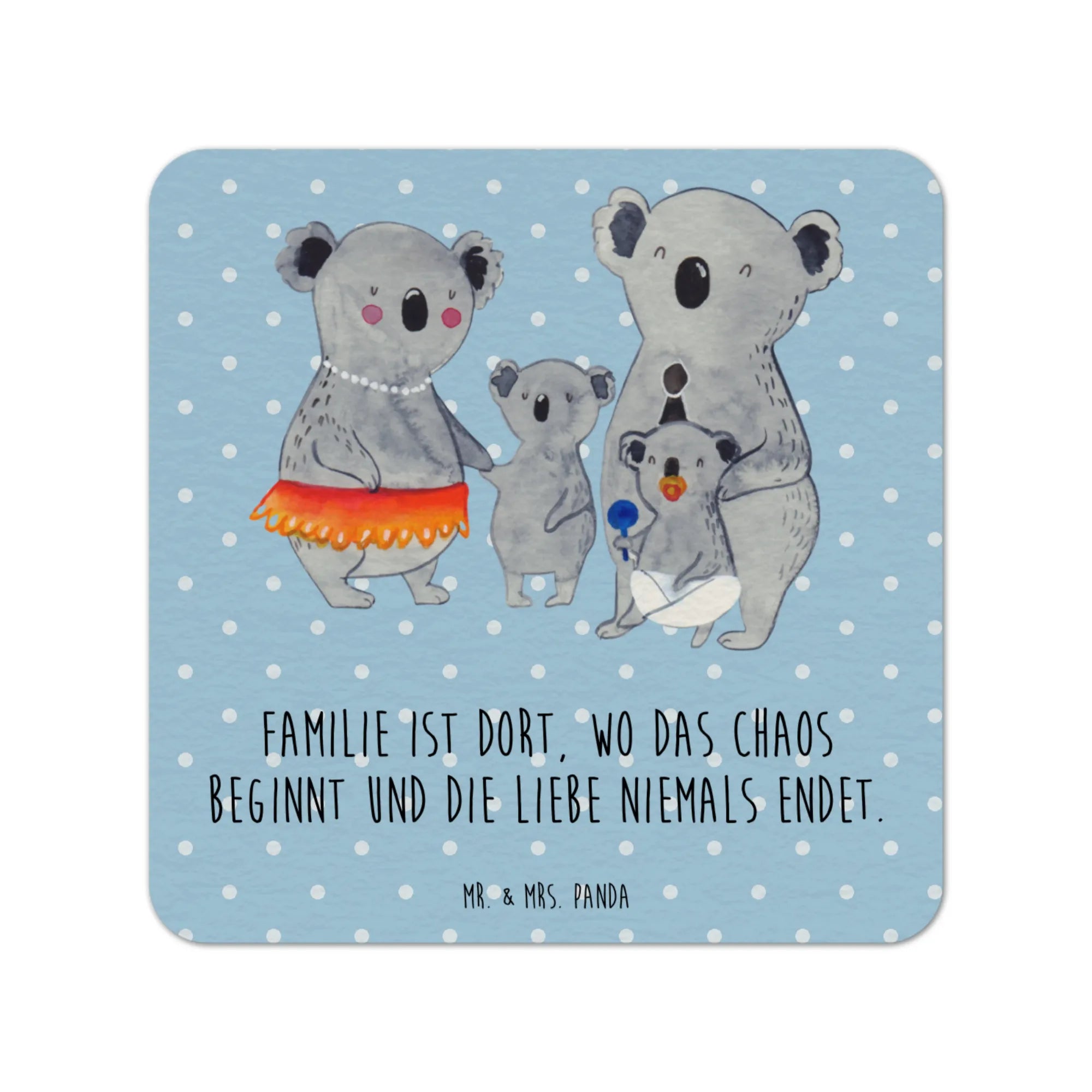 Das Motiv zeigt eine fröhliche Koala-Familie: Zwei große Koalas, deren menschliche Züge und Accessoires sie zum Leben erwecken - einer trägt eine schicke Perlenkette und der andere einen bunten Partyhut. Neben ihnen stehen zwei kleine Koalas, die den Familienhype perfekt abrunden. Das Lätzchen und das Spielzeug, das einer der kleinen Koalas hält, erinnern uns daran, wie wichtig es ist, die kleinen Dinge im Leben zu schätzen. Die fröhlichen Gesichter der Koalas strahlen Wärme aus und verleihen jedem Anlass eine besondere Note. Ideal sind diese Bierdeckel auch als Gastgeschenk zur Hochzeit, auf Feiern wie Weihnachten, Geburtstagen oder Junggesellenabschieden. Du suchst nach einem tollen Geschenk für den Vatertag oder Muttertag? Mit den Bierdeckeln aus unserer Familien-Kollektion machst du Freunden und Verwandten ein ganz besonderes Geschenk, das immer wieder Freude bereitet.
