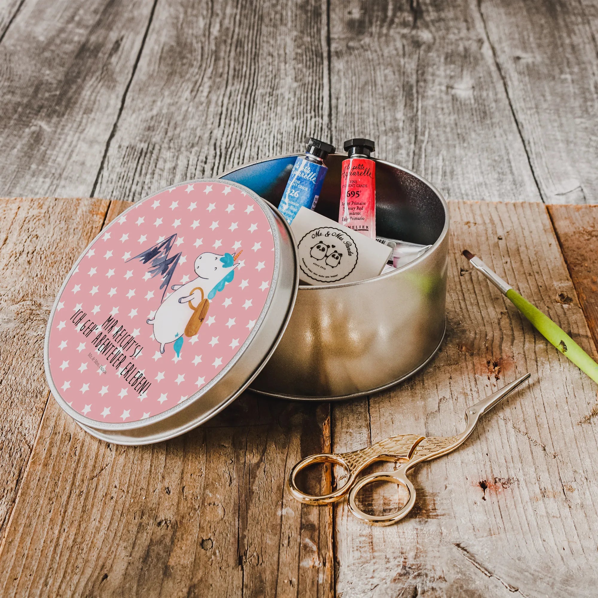 Die runde Blechdose Einhorn Bergsteiger von Mr. & Mrs. Panda ist das perfekte Geschenk für all jene, die Abenteuer und die magische Welt der Einhörner lieben. Mit einem Durchmesser von 150 mm und einer Höhe von 150 mm bietet sie ausreichend Platz für deine selbstgebackenen Kekse oder kleine Erinnerungen, die du auf deinen Reisen gesammelt hast.