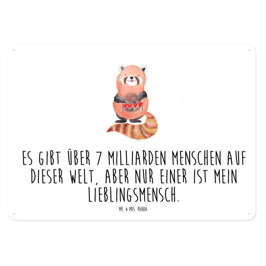 Das wunderschöne und edle Blechschild von Mr. & Mrs. Panda ist das perfekte Geschenk für alle, die ein Stück gute Laune und Liebe in ihr Zuhause bringen möchten. Mit seinem liebevoll gestalteten Motiv eines roten Pandas, der eine Herzgirlande hält, ist dieses Schild eine tolle Dekoration für die Wand oder die Tür. Der Slogan "Es gibt über 7 Milliarden Menschen auf dieser Welt, aber nur einer ist mein Lieblingsmensch." spricht aus, was viele von uns fühlen und ist ideal, um jemandem eine besondere Freude zu bereiten.