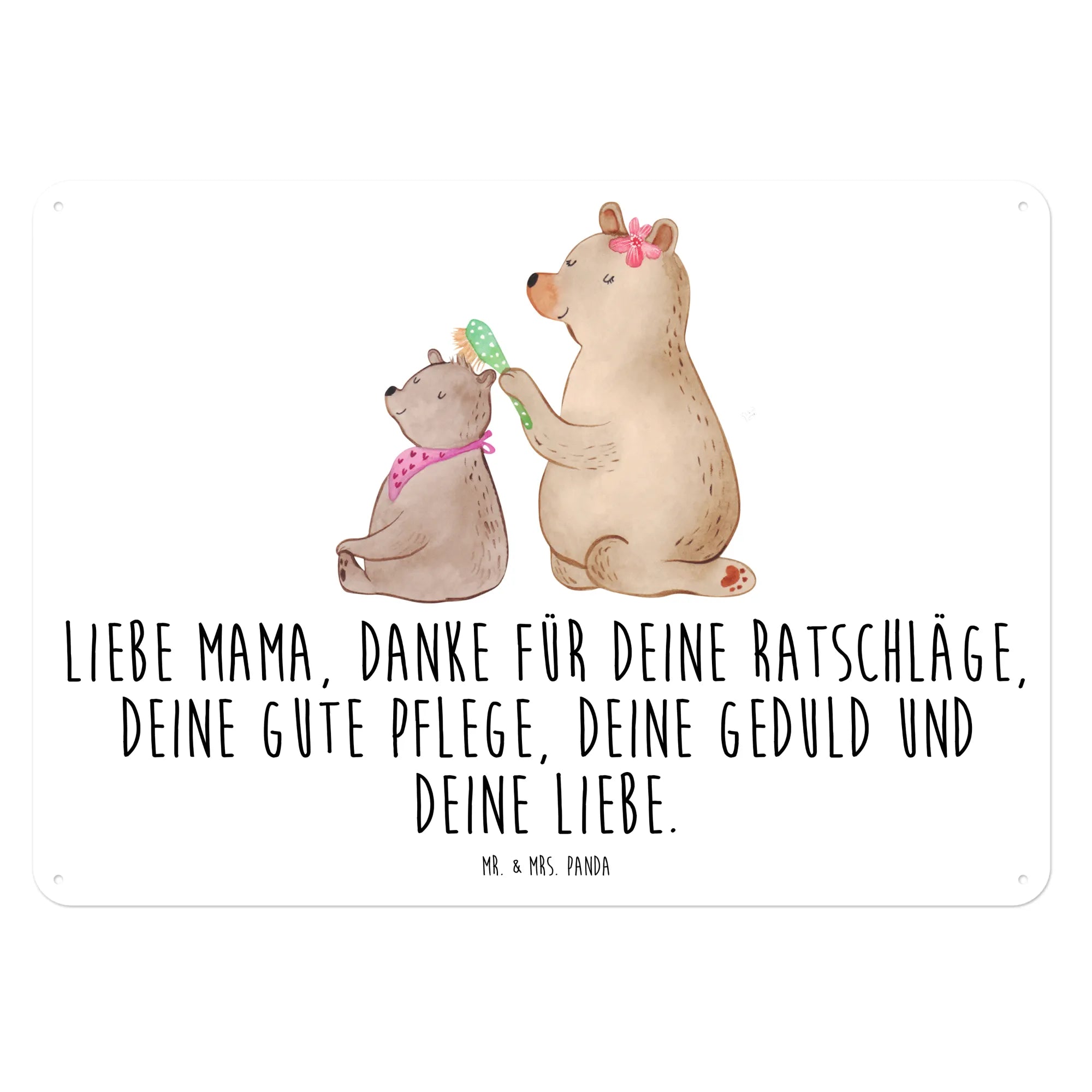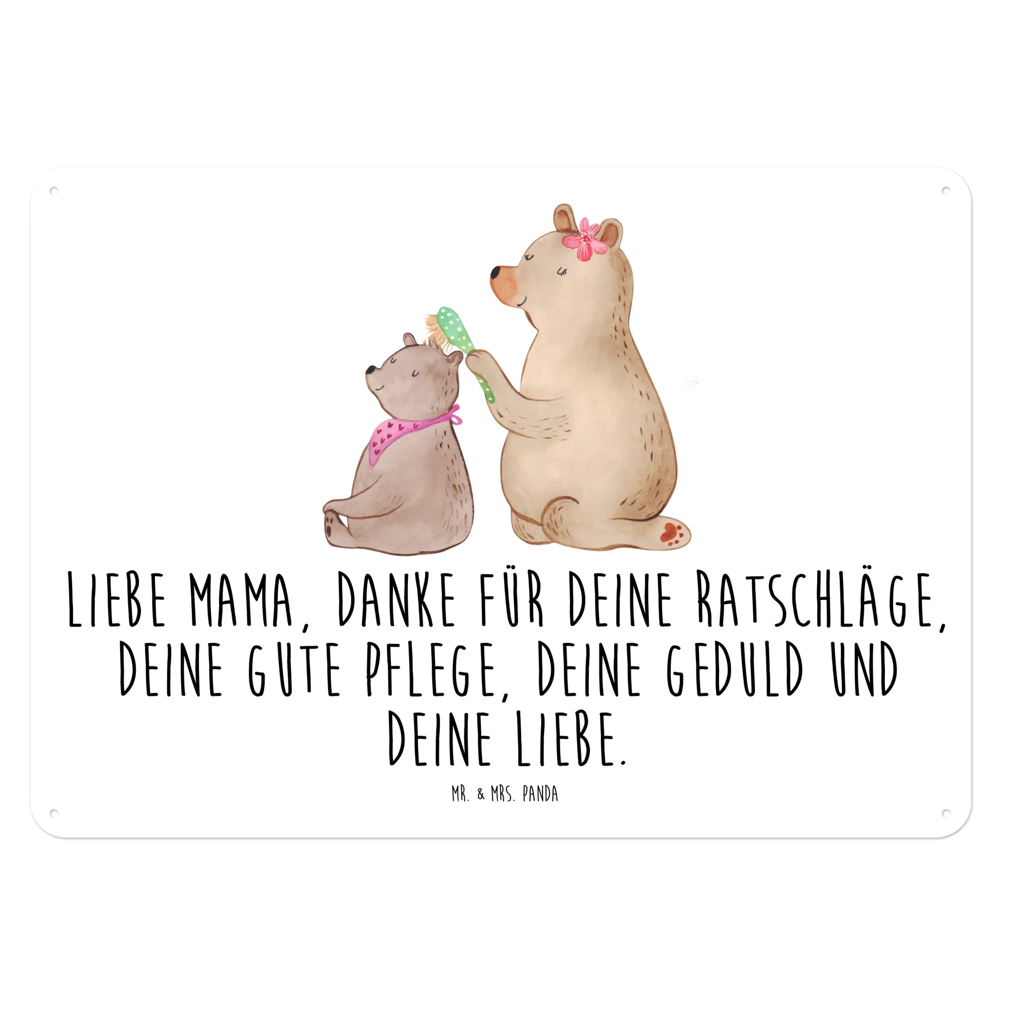 Das edle Blechschild "Bär mit Kind" von Mr. & Mrs. Panda ist das perfekte Geschenk für jede Mutter, die Deinen Dank und Deine Liebe verdient. Mit einer wunderschönen, handgezeichneten Illustration von einem großen Bären, der liebevoll das Fell eines kleineren Bären bürstet, strahlt dieses Schild eine herzliche, familiäre Atmosphäre aus.