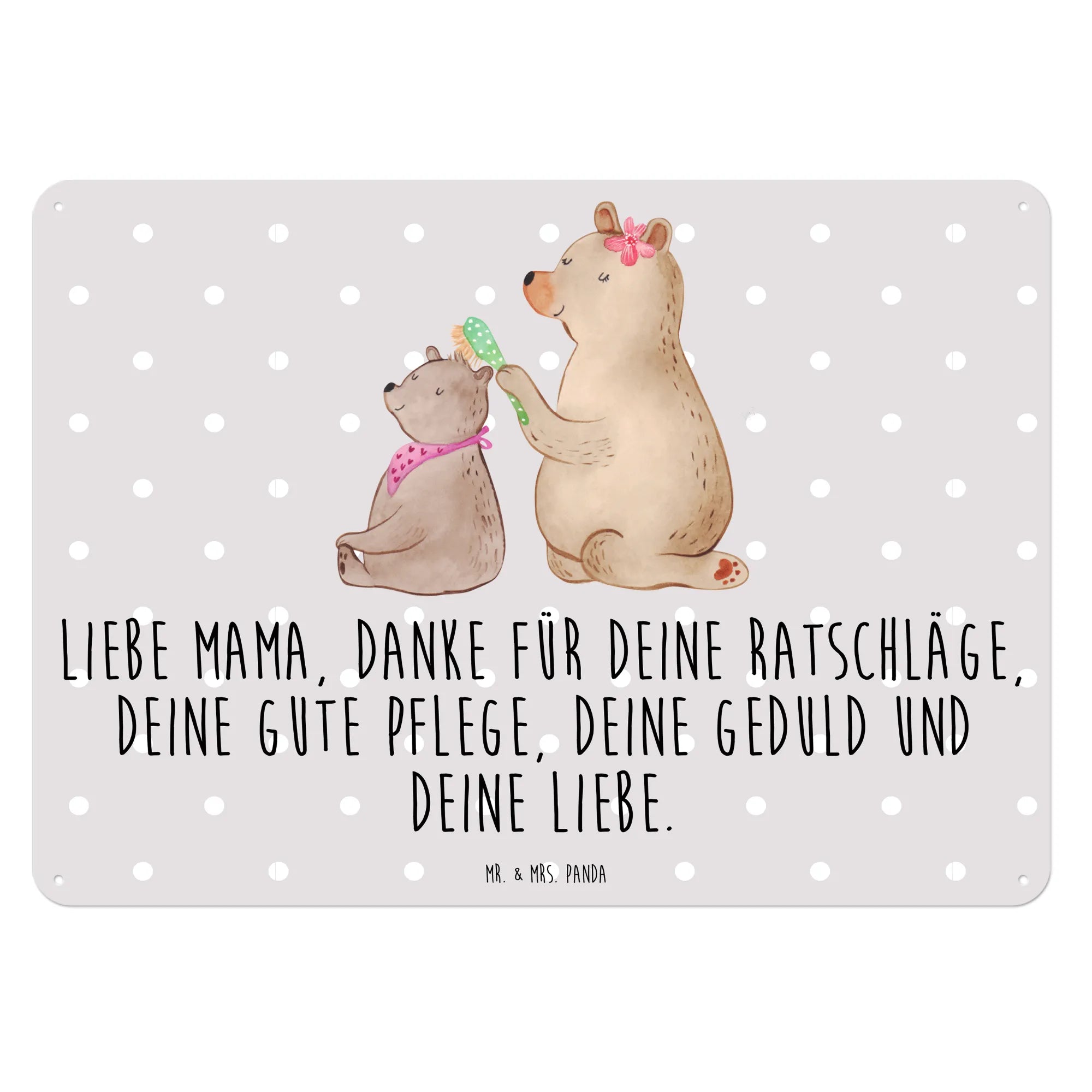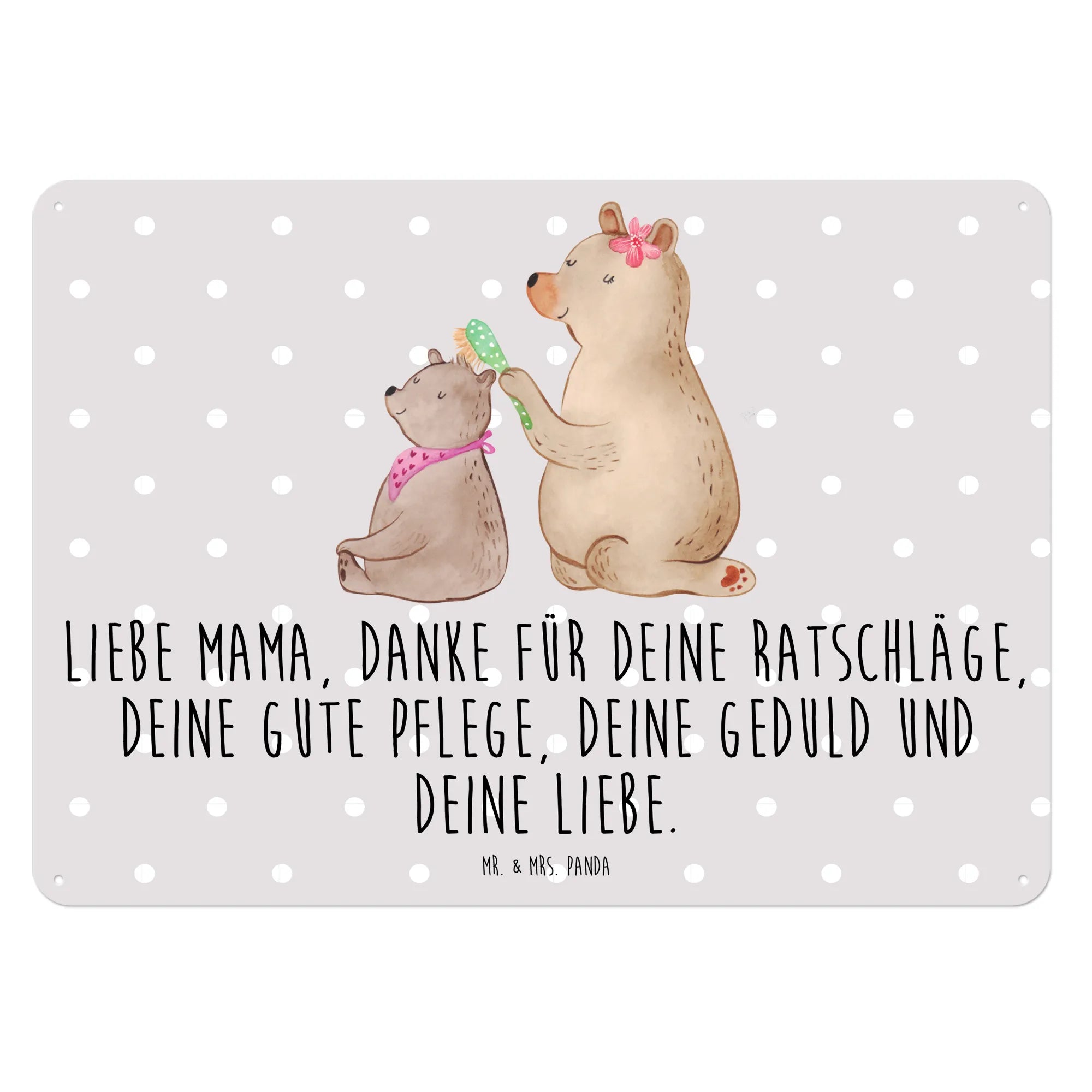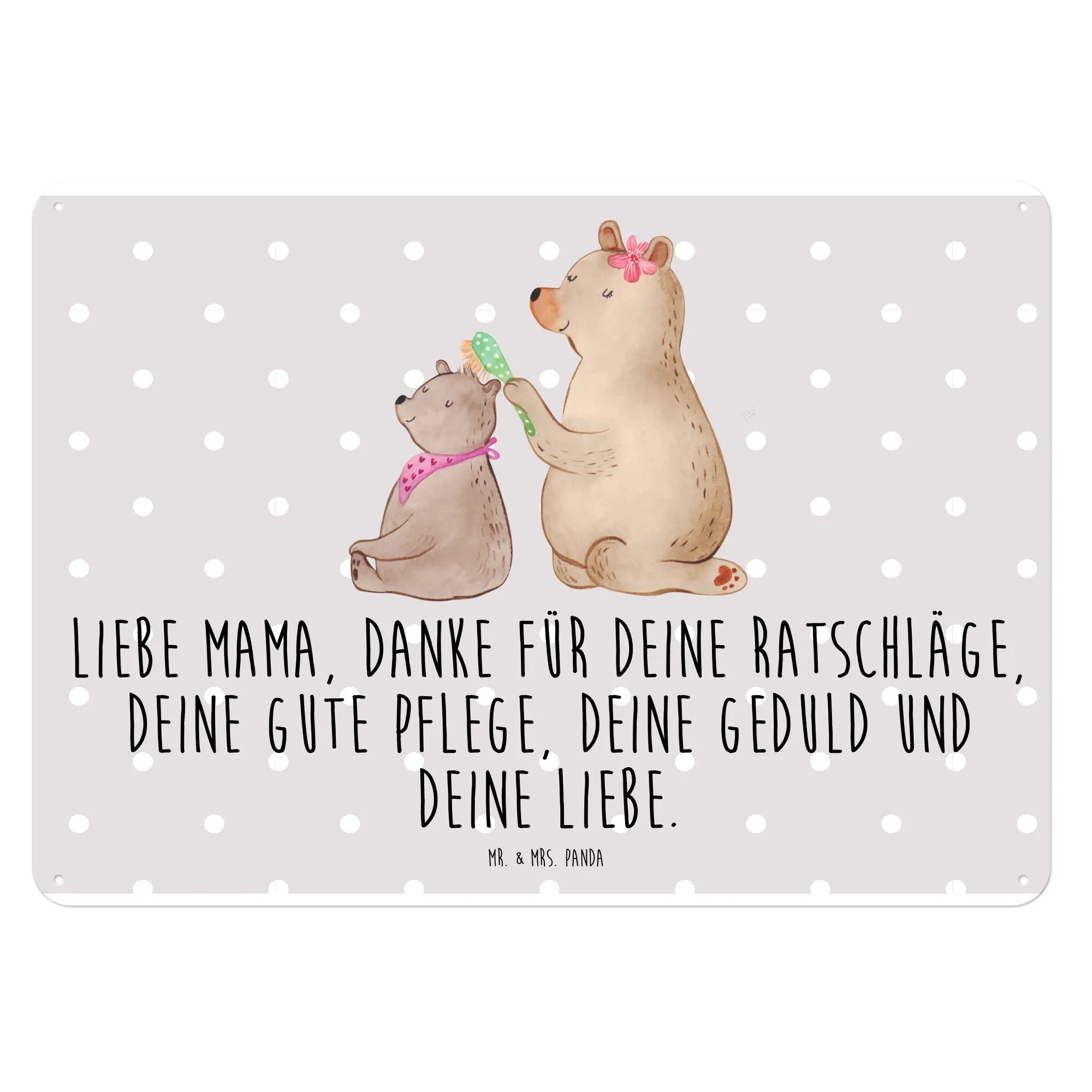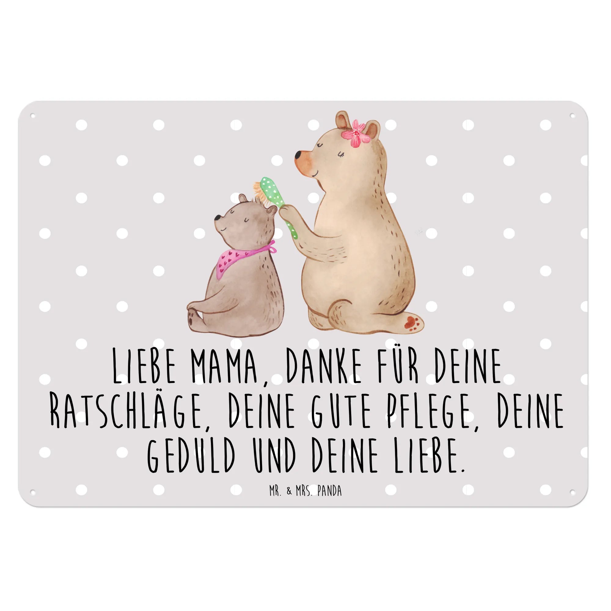 Das wunderschöne Blechschild mit dem Motiv Bär mit Kind aus unserer Familien Kollektion von Mr. & Mrs. Panda ist das perfekte Geschenk für jede Mama oder Mutter. Es ist ideal geeignet für besondere Anlässe wie den Muttertag, Geburtstage oder einfach als liebevolle Geste zwischendurch. Der liebevoll gestaltete Bär, der sein kleineres Pendant mit einer gepunkteten Bürste frisiert, strahlt Wärme, Fürsorge und Zuneigung aus.