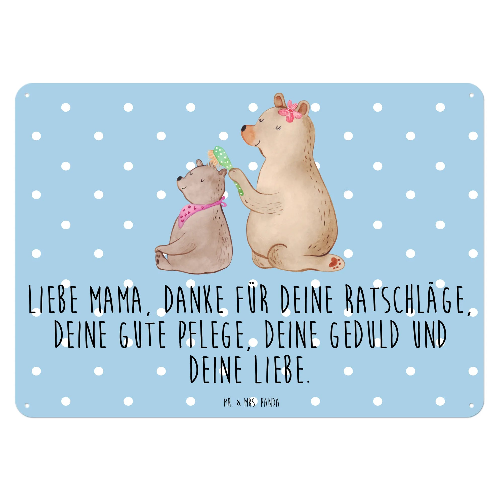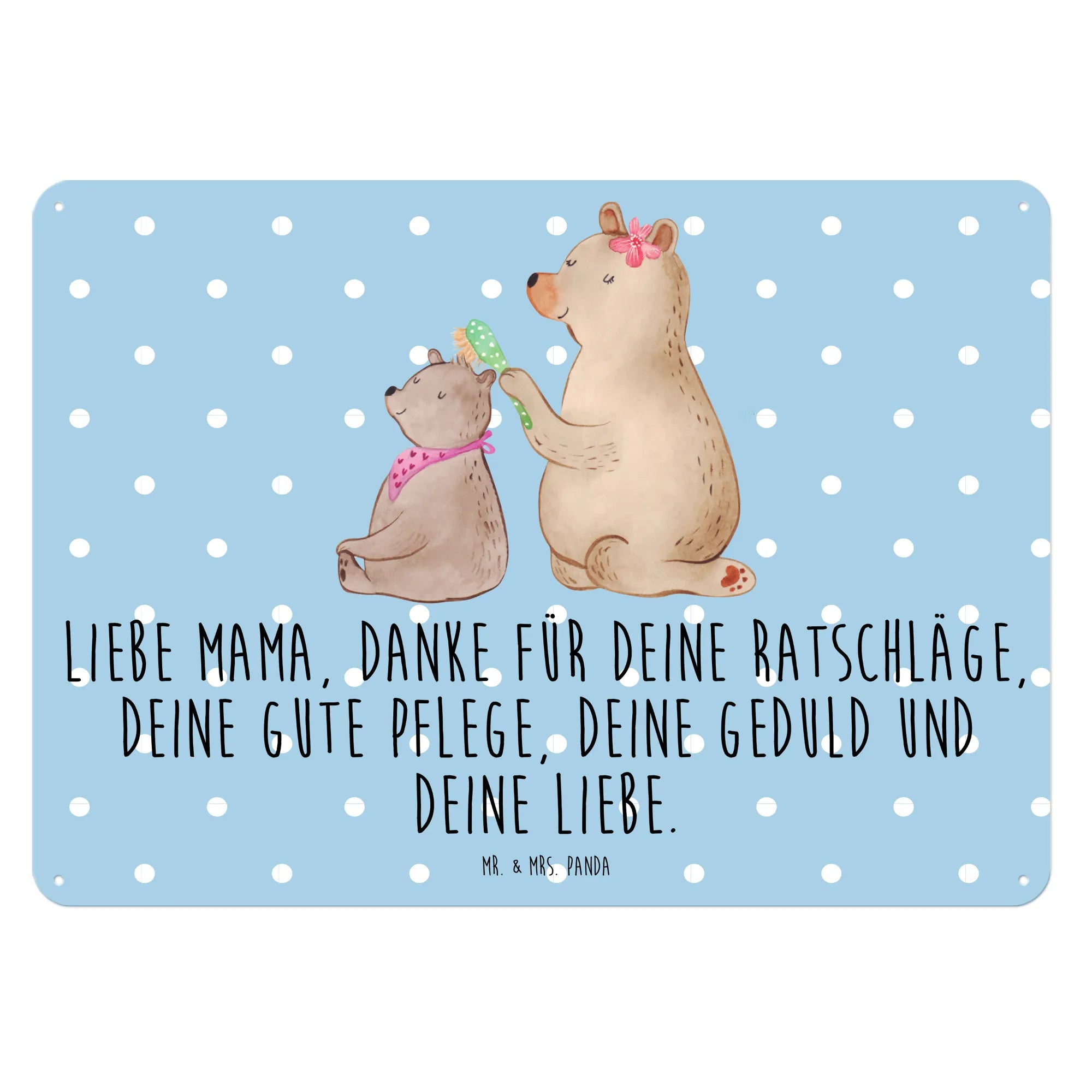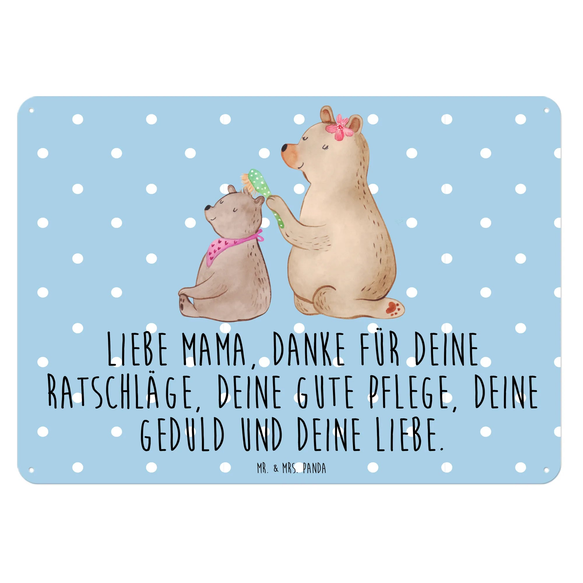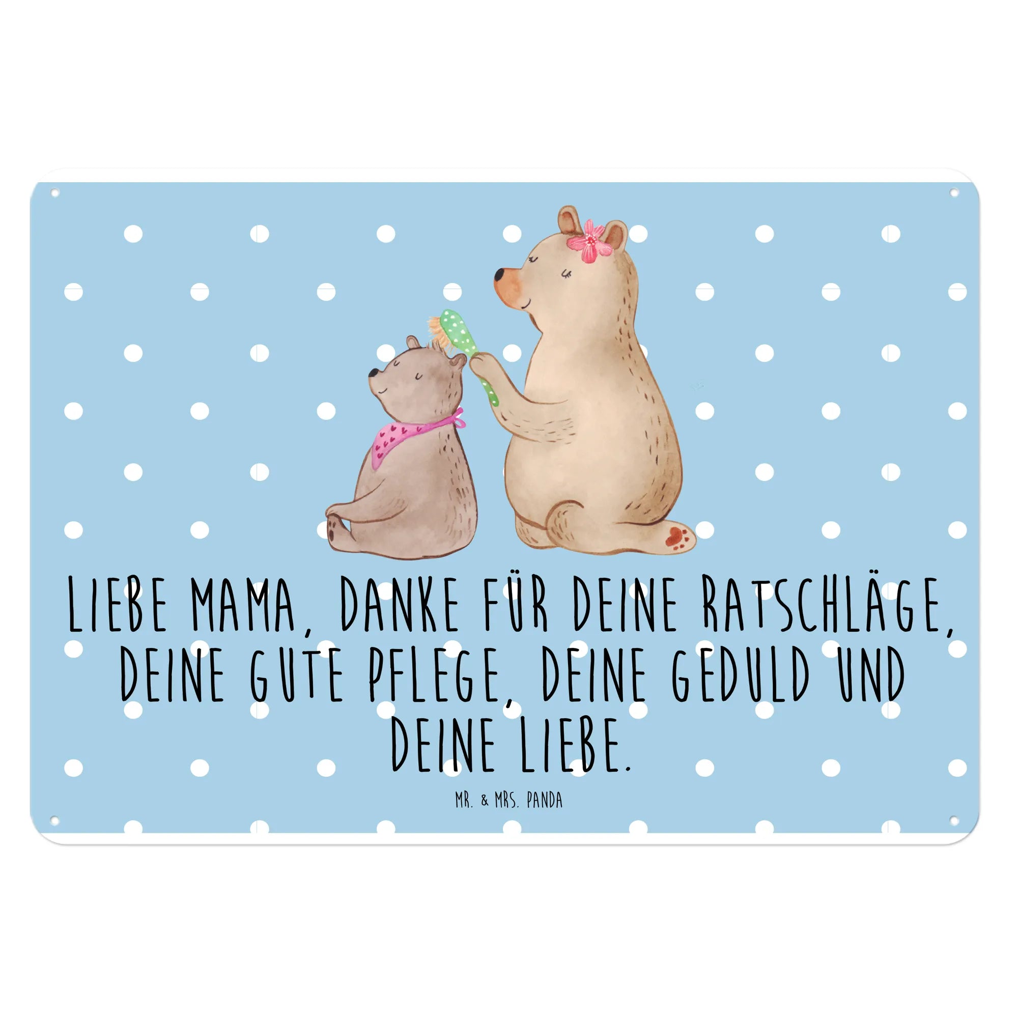 Das Blechschild mit dem Motiv Bär mit Kind von Mr. & Mrs. Panda ist das perfekte Geschenk für alle Mamas! 🎁 Dieses wunderschöne Schild bringt nicht nur fröhliche Farben, sondern auch eine starke Botschaft der Dankbarkeit und Liebe. Das liebevoll gestaltete Motiv zeigt einen großen Bären, der vorsichtig das Haar seines kleinen Bärenbärchens bürstet – eine süße Darstellung von Familieneinheit und Zuneigung.