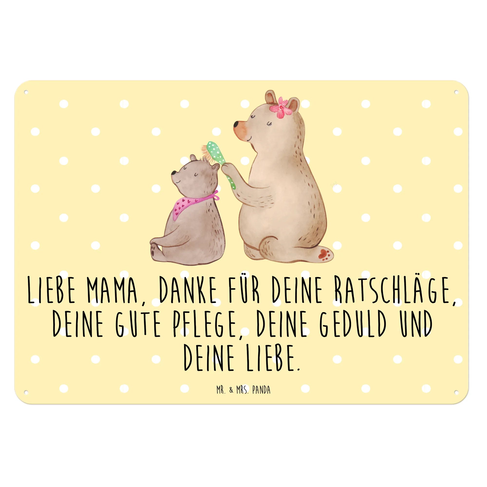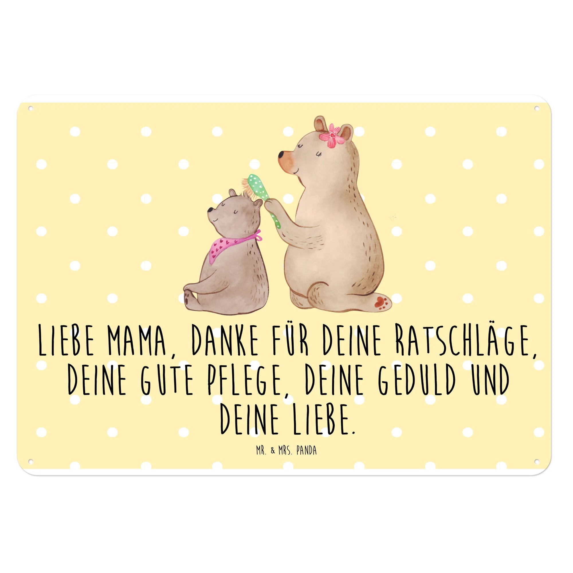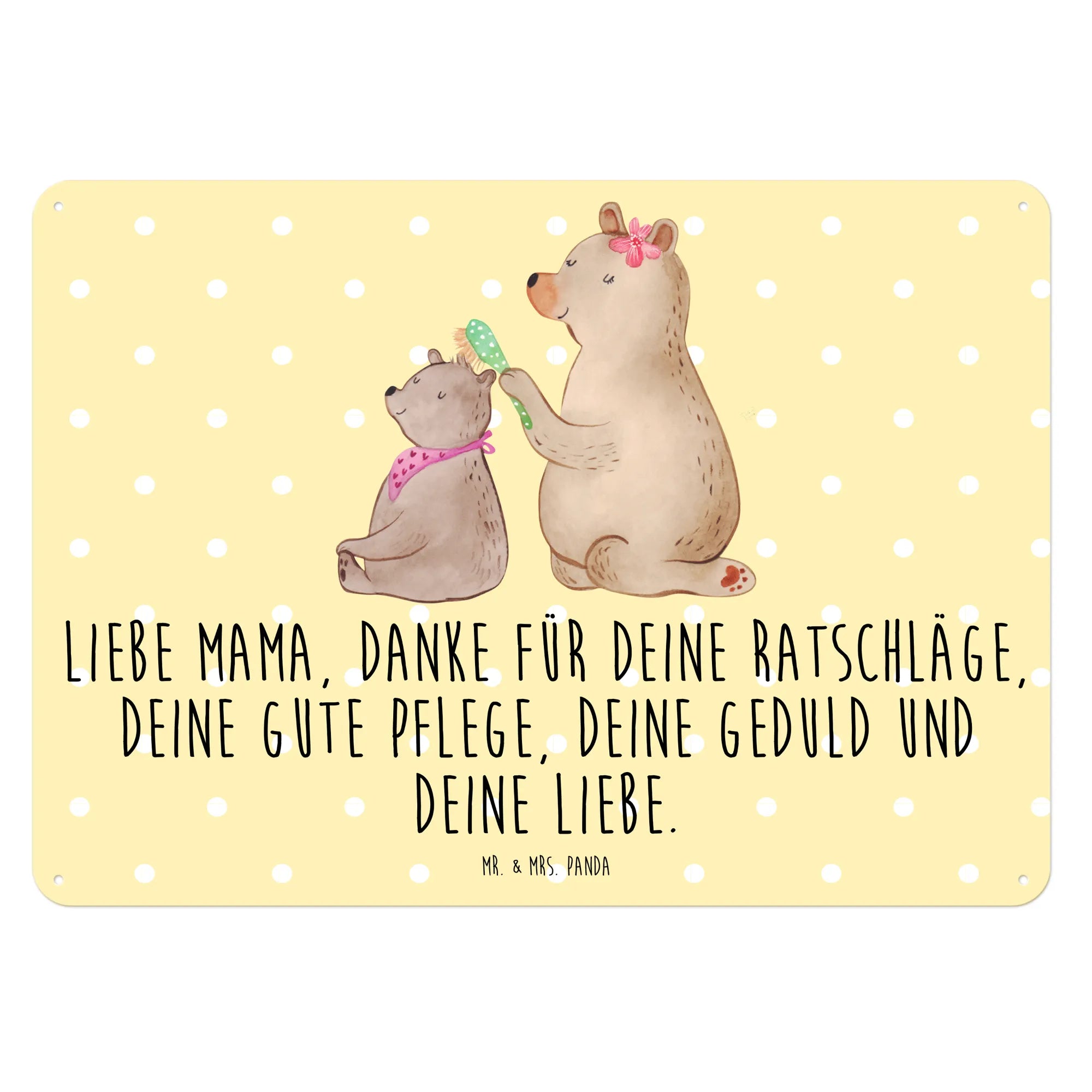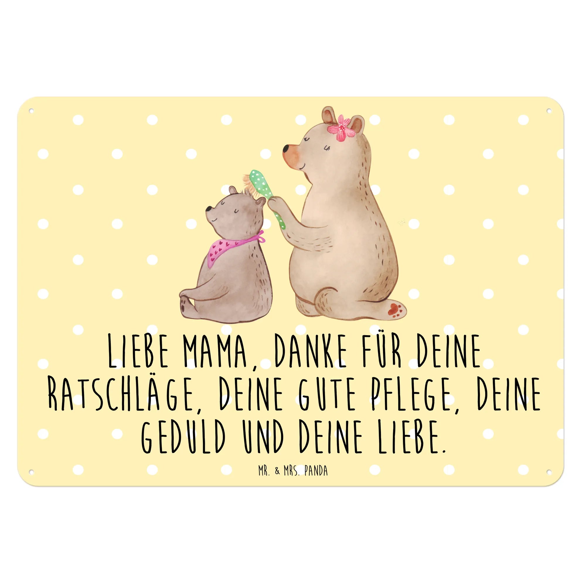 Das Blechschild mit dem Motiv Bär mit Kind von Mr. & Mrs. Panda ist das perfekte Geschenk für alle Mamas! 🎁 Dieses wunderschöne Schild bringt nicht nur fröhliche Farben, sondern auch eine starke Botschaft der Dankbarkeit und Liebe. Das liebevoll gestaltete Motiv zeigt einen großen Bären, der vorsichtig das Haar seines kleinen Bärenbärchens bürstet – eine süße Darstellung von Familieneinheit und Zuneigung.